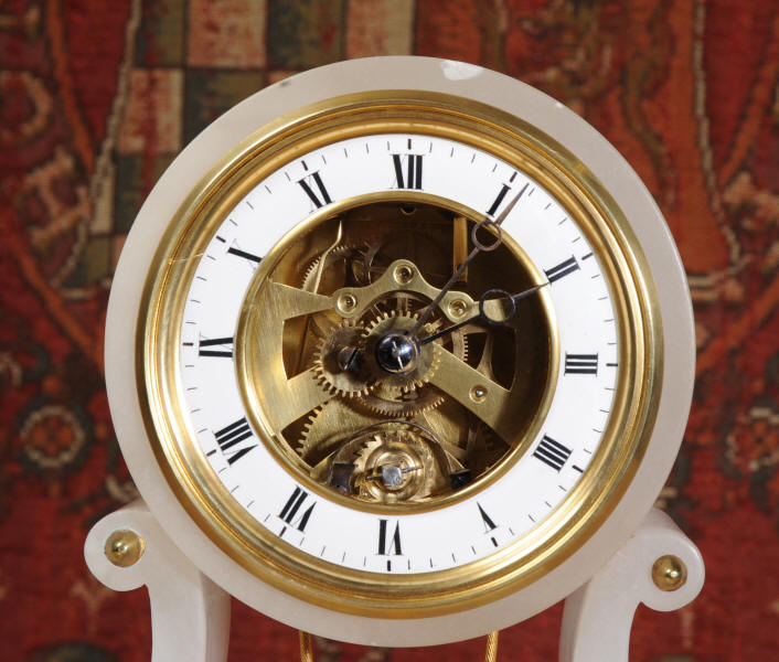The dial is enamel on copper in the form of a ring around the centre which is open to allow the skeletonised movement to be seen including the pin-pallet escapement. Please note, this type of clock does not have a glazed bezel or a rear door.