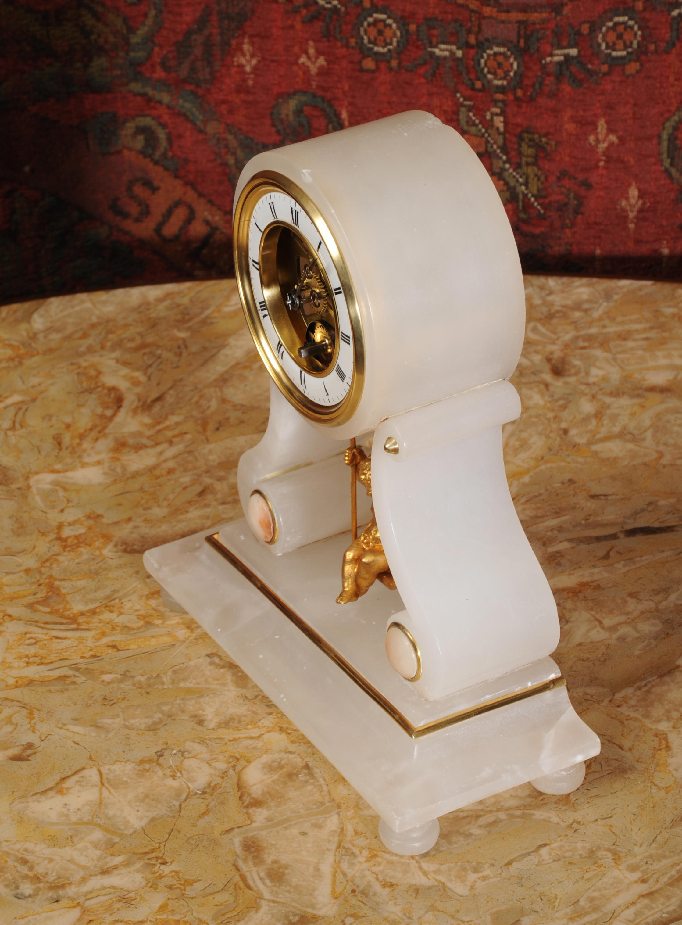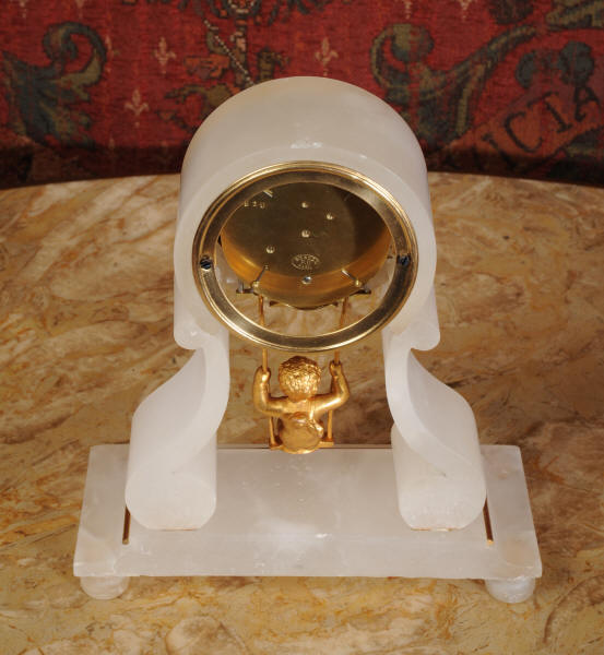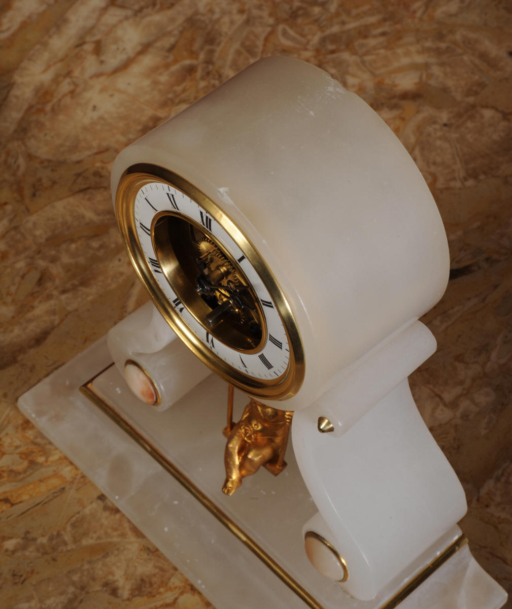 Condition of the case is very good, the alabaster is crisp and clean. Alabaster is a delicate material and there are one or two marks, discolouration and nibbles to the edges, particularly to the rear of the top and a slight chip to the top of the front. The dial is also in excellent condition with no damage. The metal work including the cherub is in excellent clean and bright condition This is a rare and delightful clock to add to your collection.