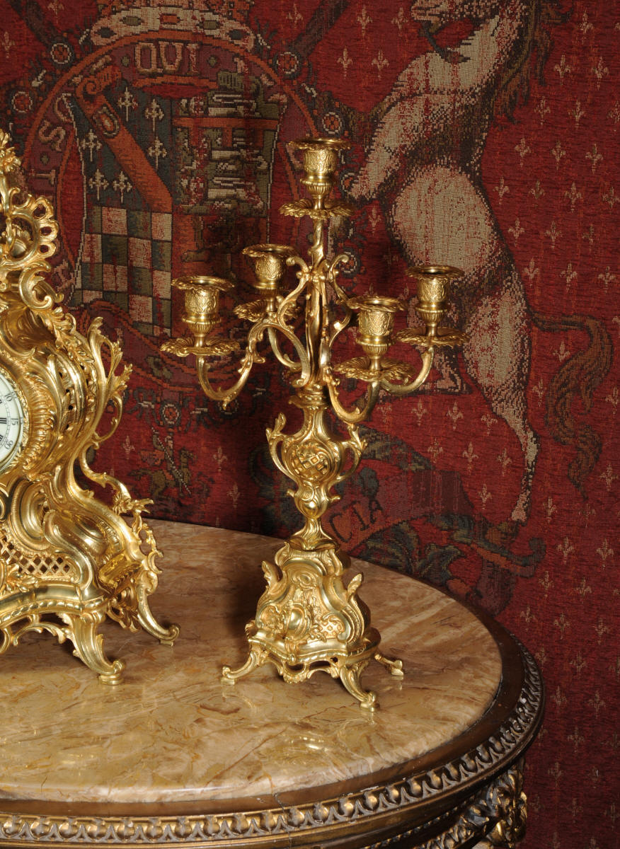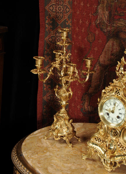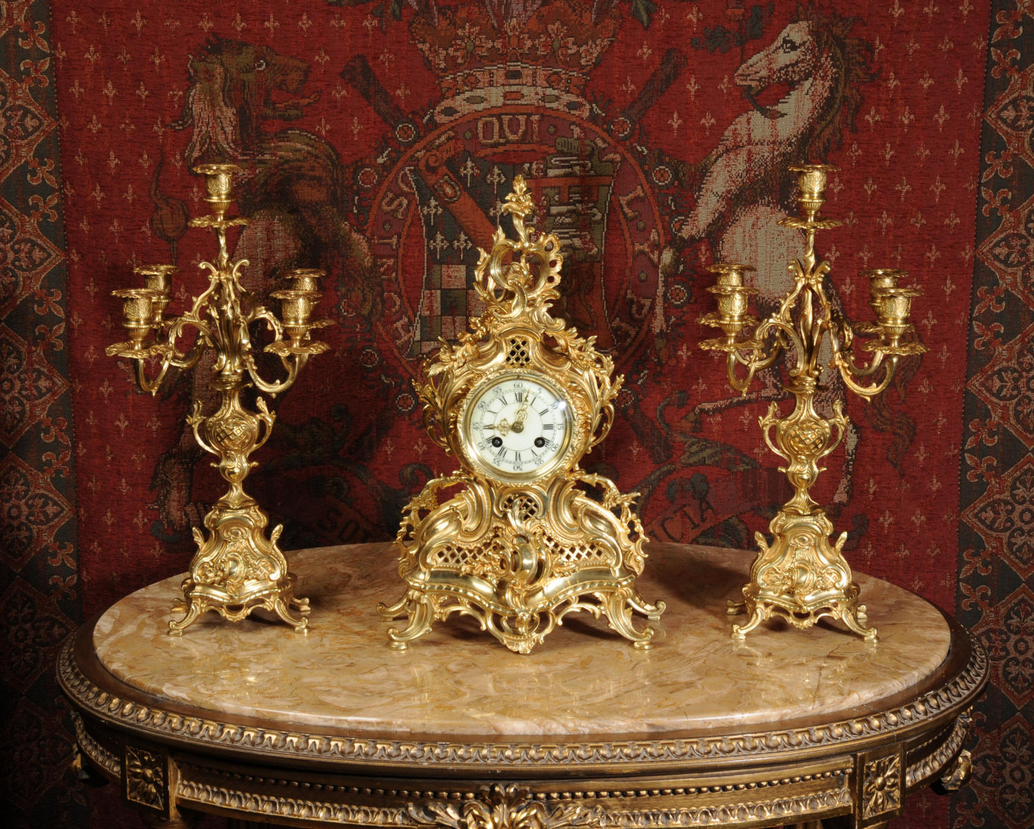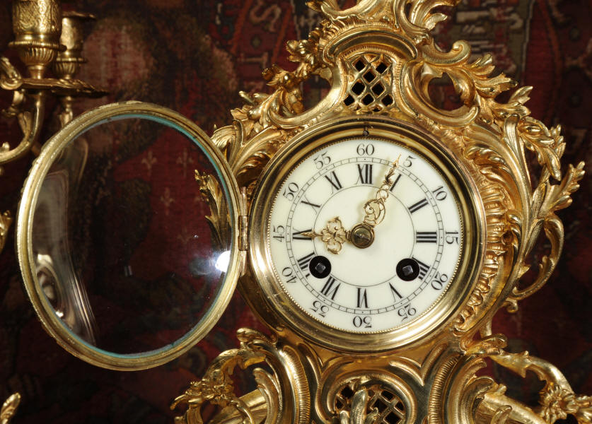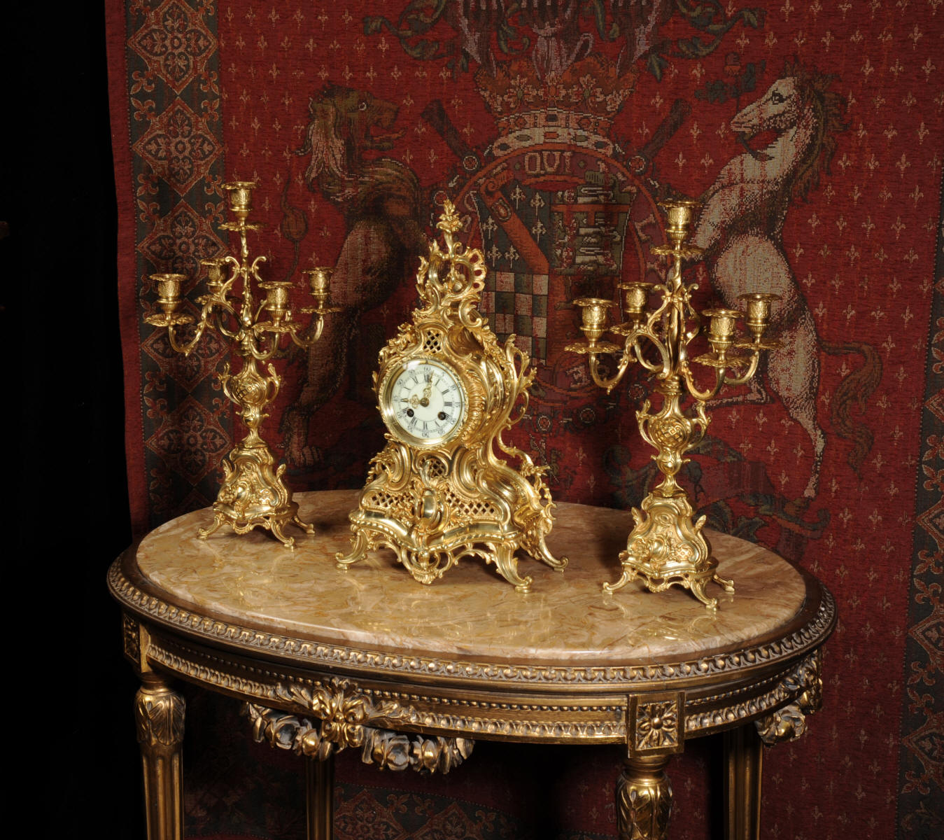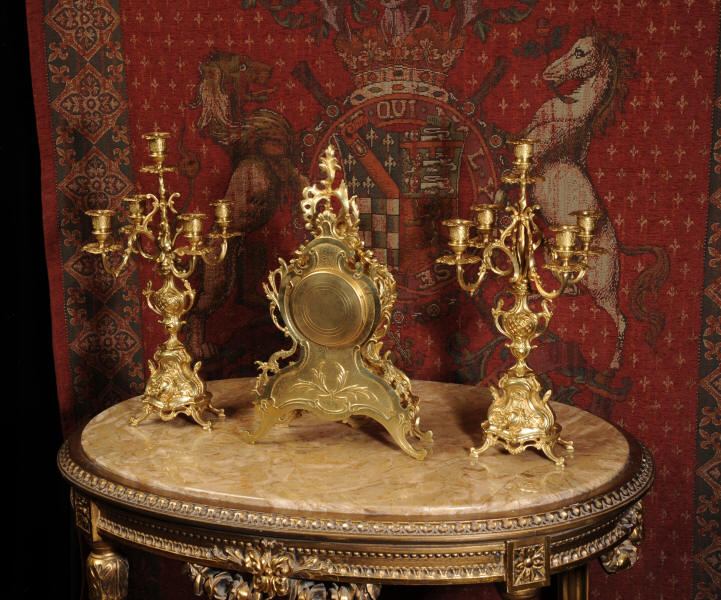 Condition of the case is excellent, the original gilding is beautifully clean and bright with hardly any wear or discolouration and there are no losses. The dial is also in excellent condition with no damage. There are a couple of very small flaws in the original glass. Candelabra are slightly distorted. The set makes a stunning display as you can see below.