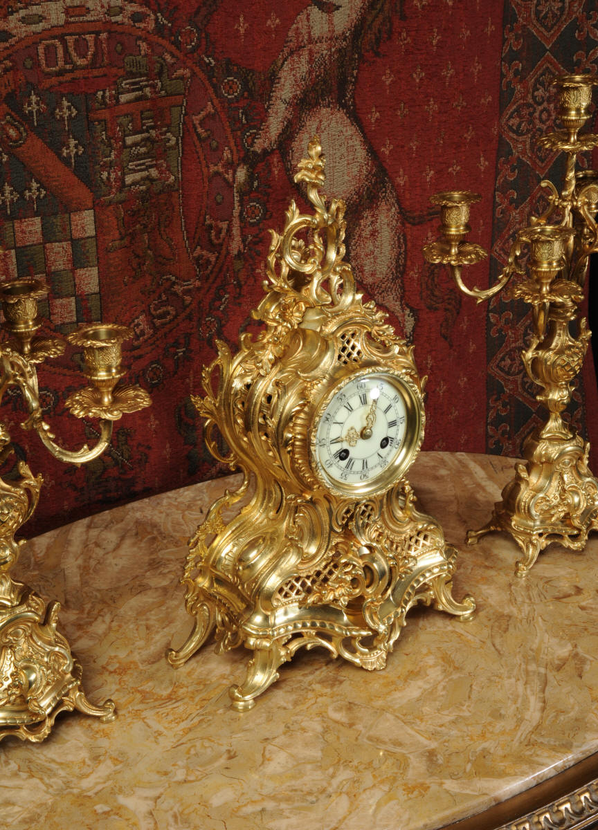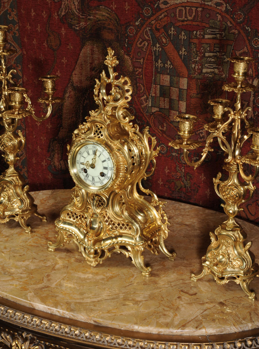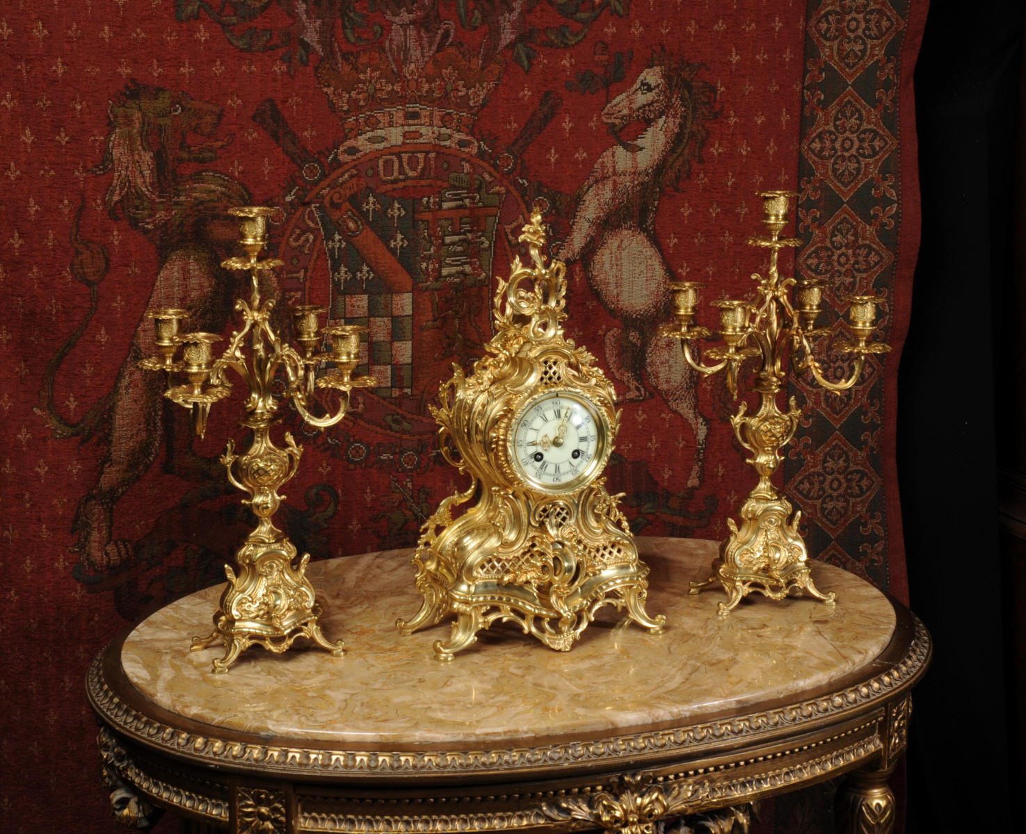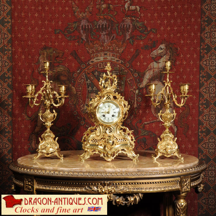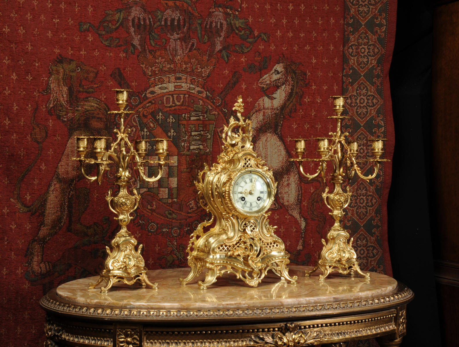 Condition of the case is excellent, the original gilding is beautifully clean and bright with hardly any wear or discolouration and there are no losses. The dial is also in excellent condition with no damage. There are a couple of very small flaws in the original glass. Candelabra are slightly distorted. The set makes a stunning display as you can see below.
