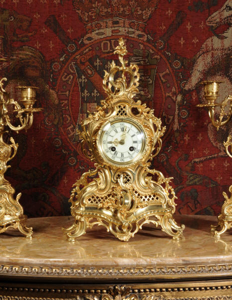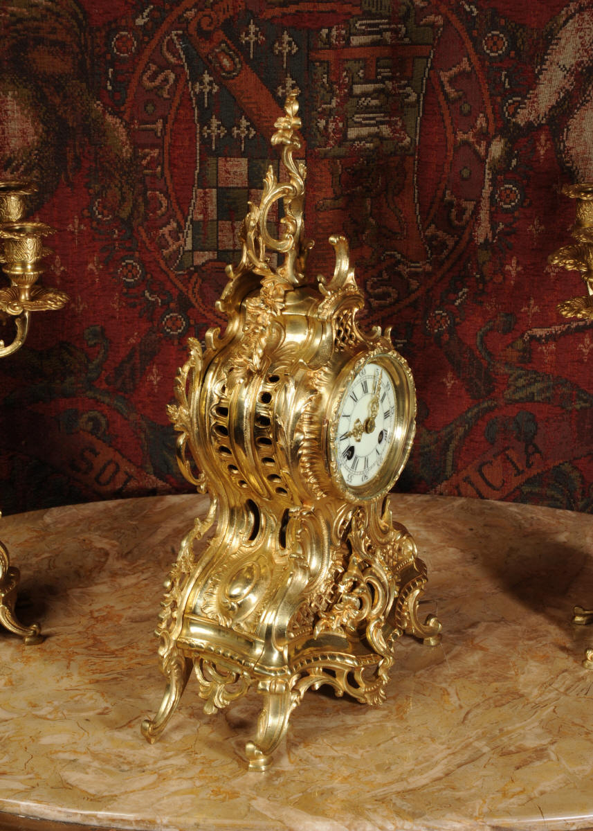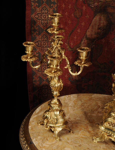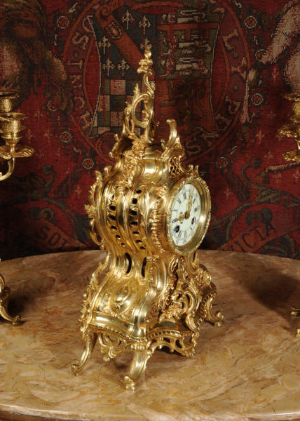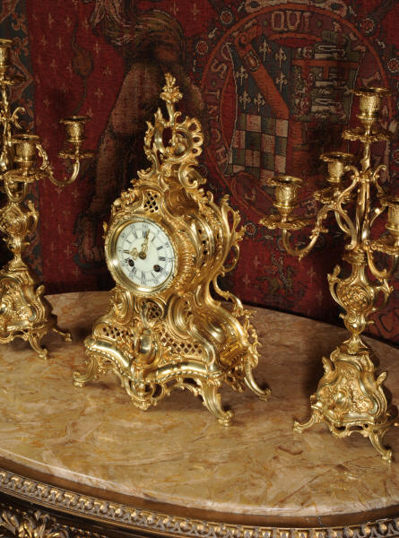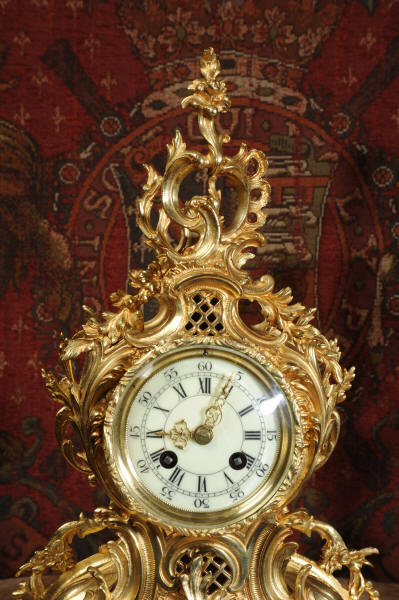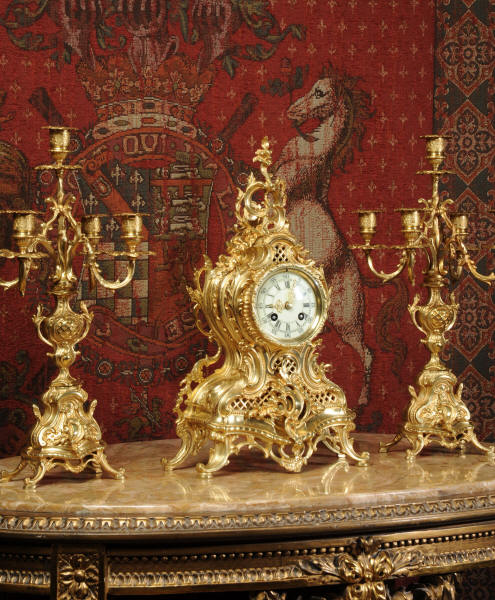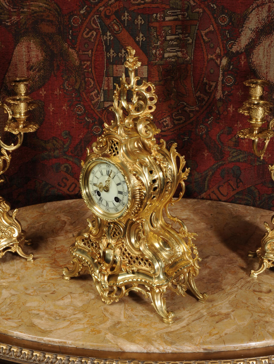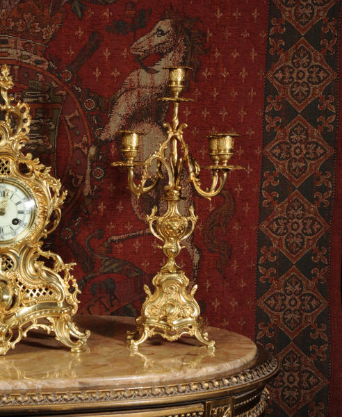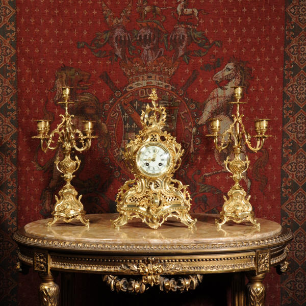 Condition of the case is excellent, the original gilding is beautifully clean and bright with hardly any wear or discolouration and there are no losses. The dial is also in excellent condition with no damage. There are a couple of very small flaws in the original glass. Candelabra are slightly distorted. The set makes a stunning display as you can see below.