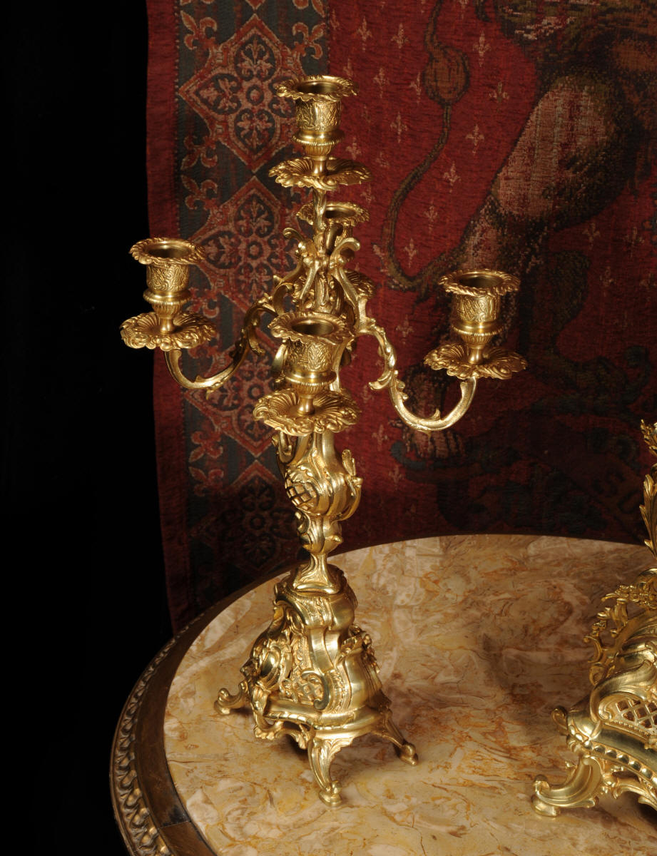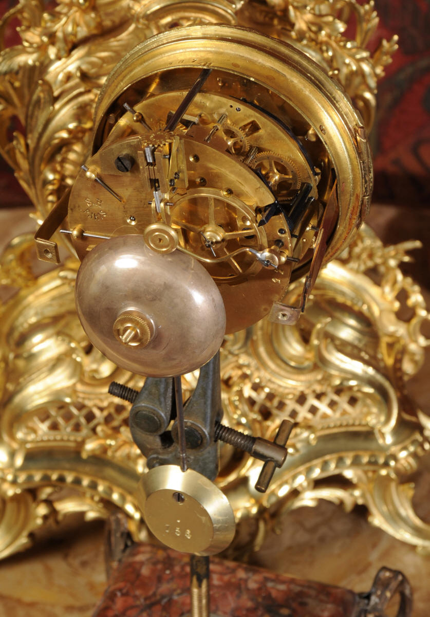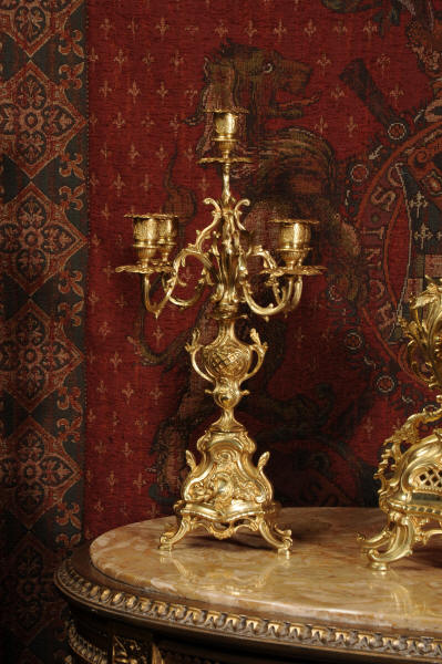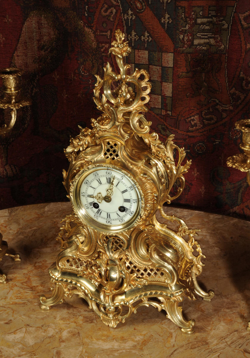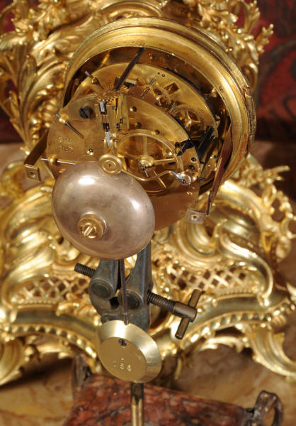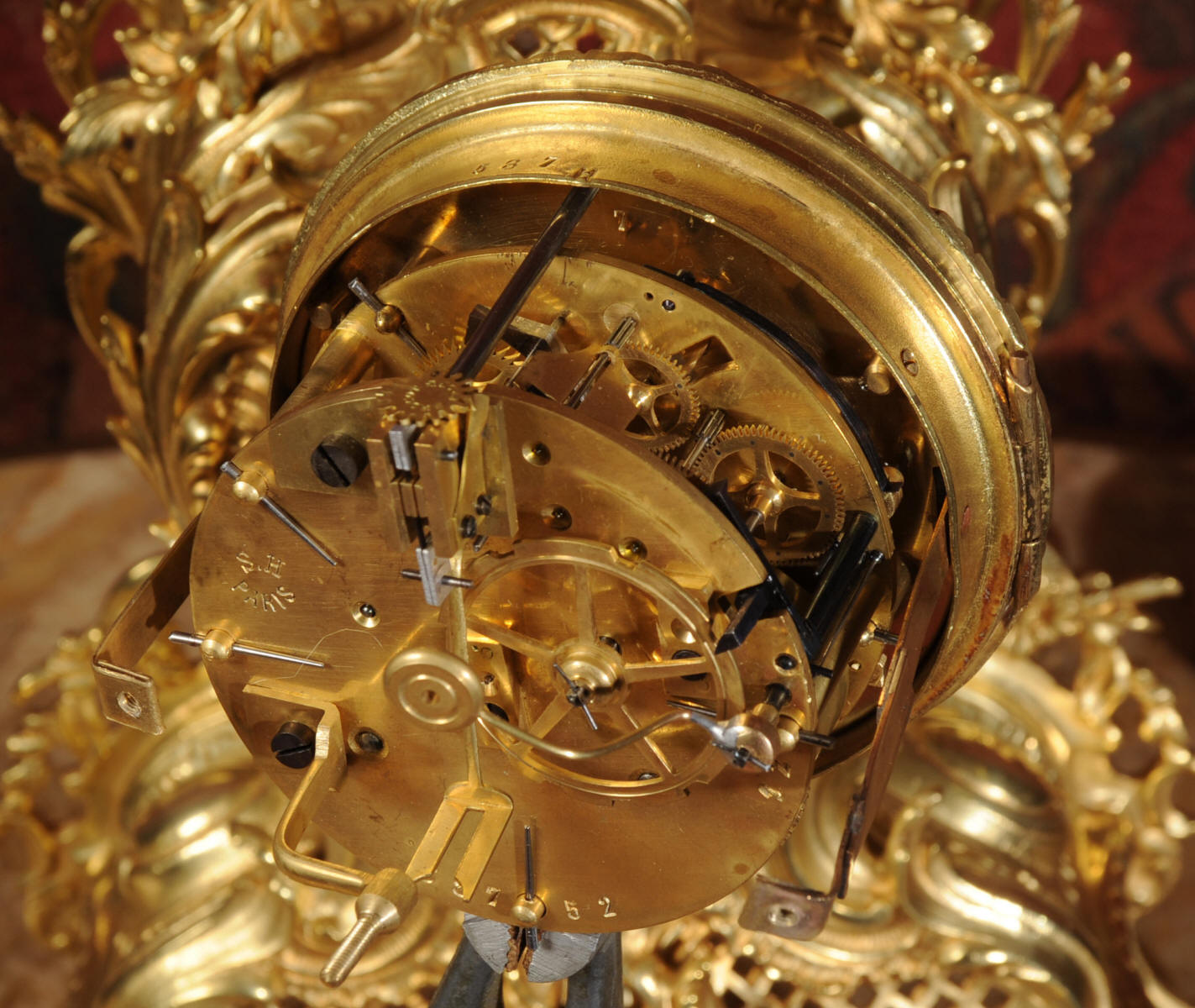 Condition of the case is excellent, the original gilding is beautifully clean and bright with hardly any wear or discolouration and there are no losses. The dial is also in excellent condition with no damage. There are a couple of very small flaws in the original glass. Candelabra are slightly distorted. The set makes a stunning display as you can see below.