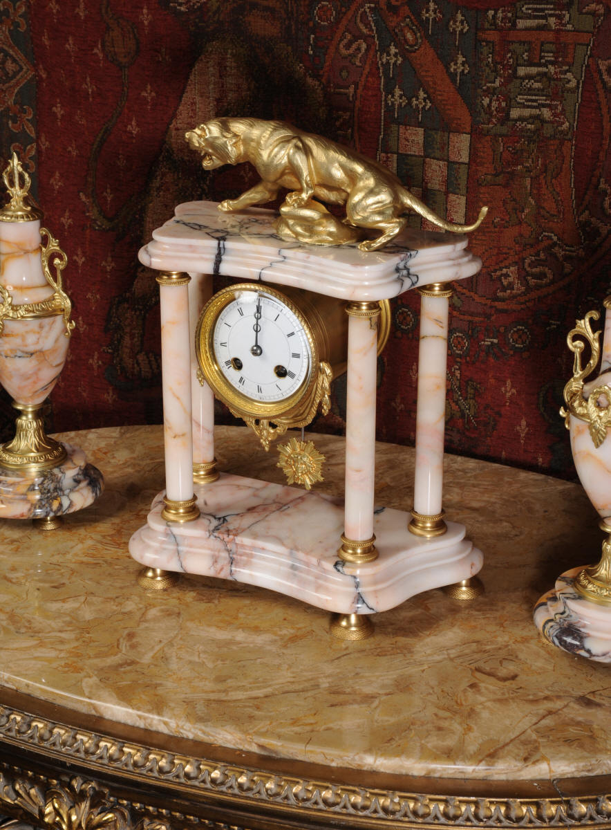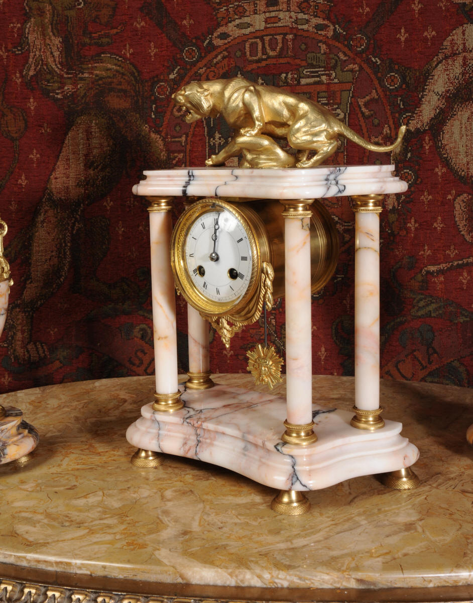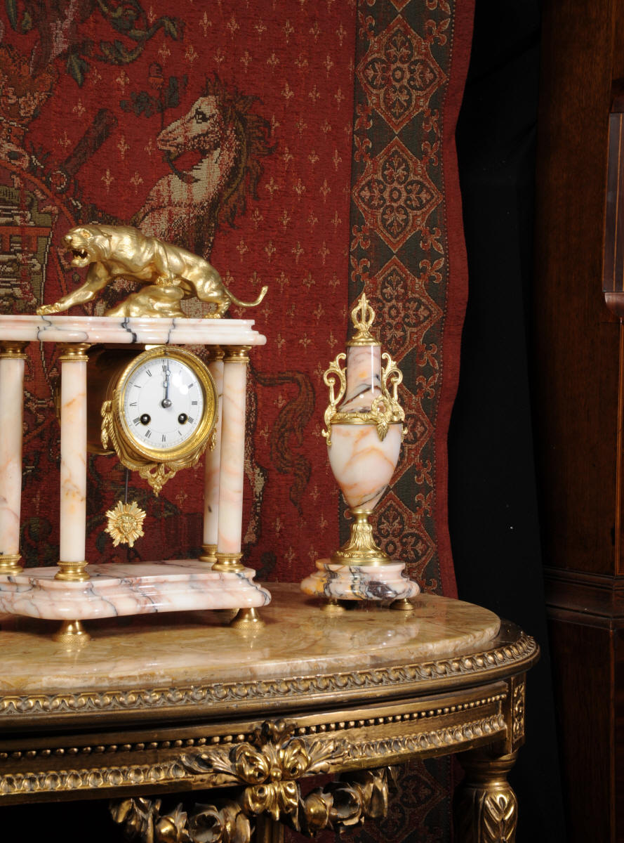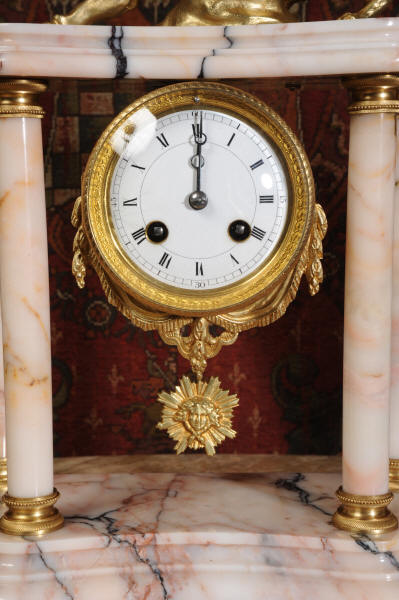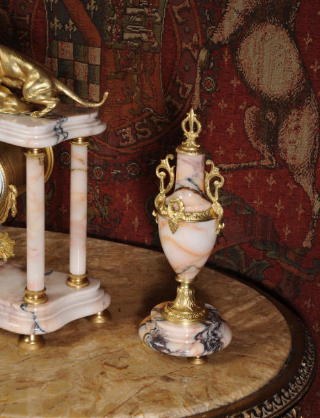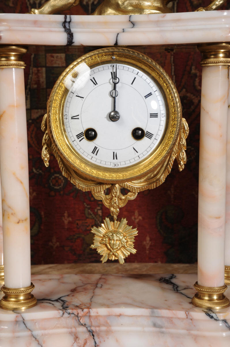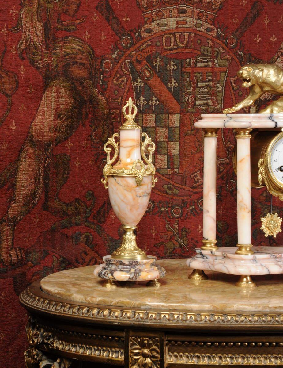 Condition of the case is excellent, the original gilding is beautifully clean and bright with hardly any wear or discolouration and there are no losses. The marble is also in good condition with a good polish. There are some occasional tiny nibbles to the edges. One urn has some hairlining along the grain of the stone. The cover of the other urn has a small chip that is hidden by the handle. The rear left hand column on the clock has a small chip top and bottom that are hardly noticeable. The dial is in excellent condition with just some faint hairlining.
