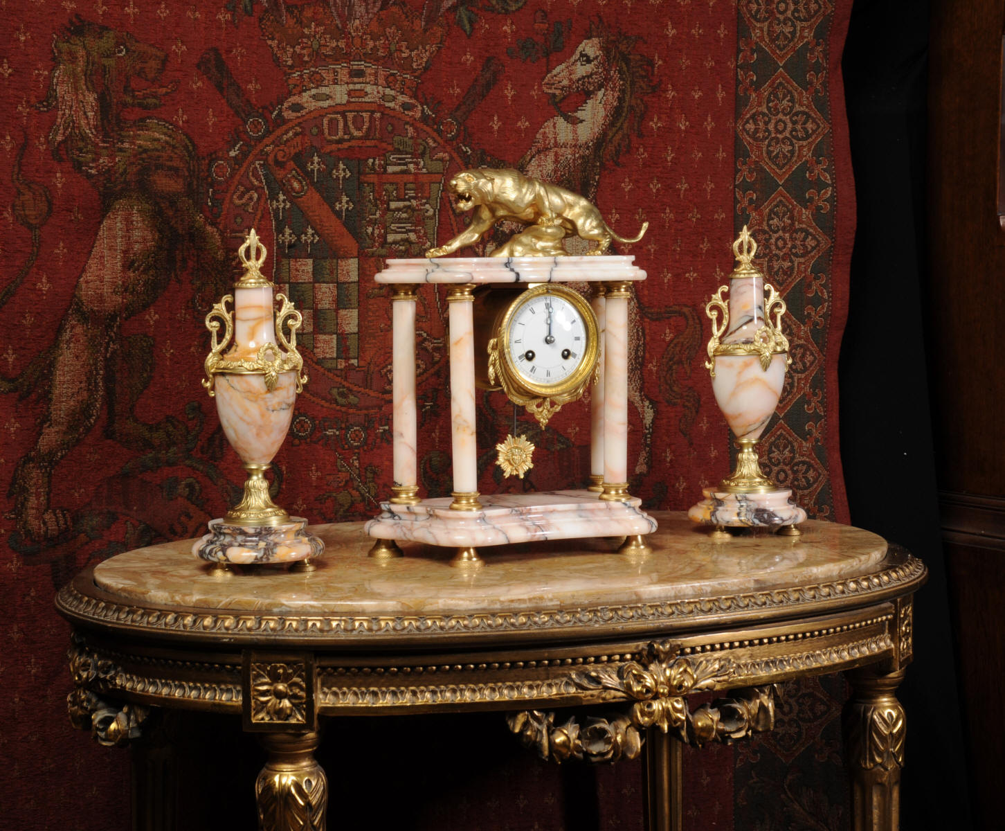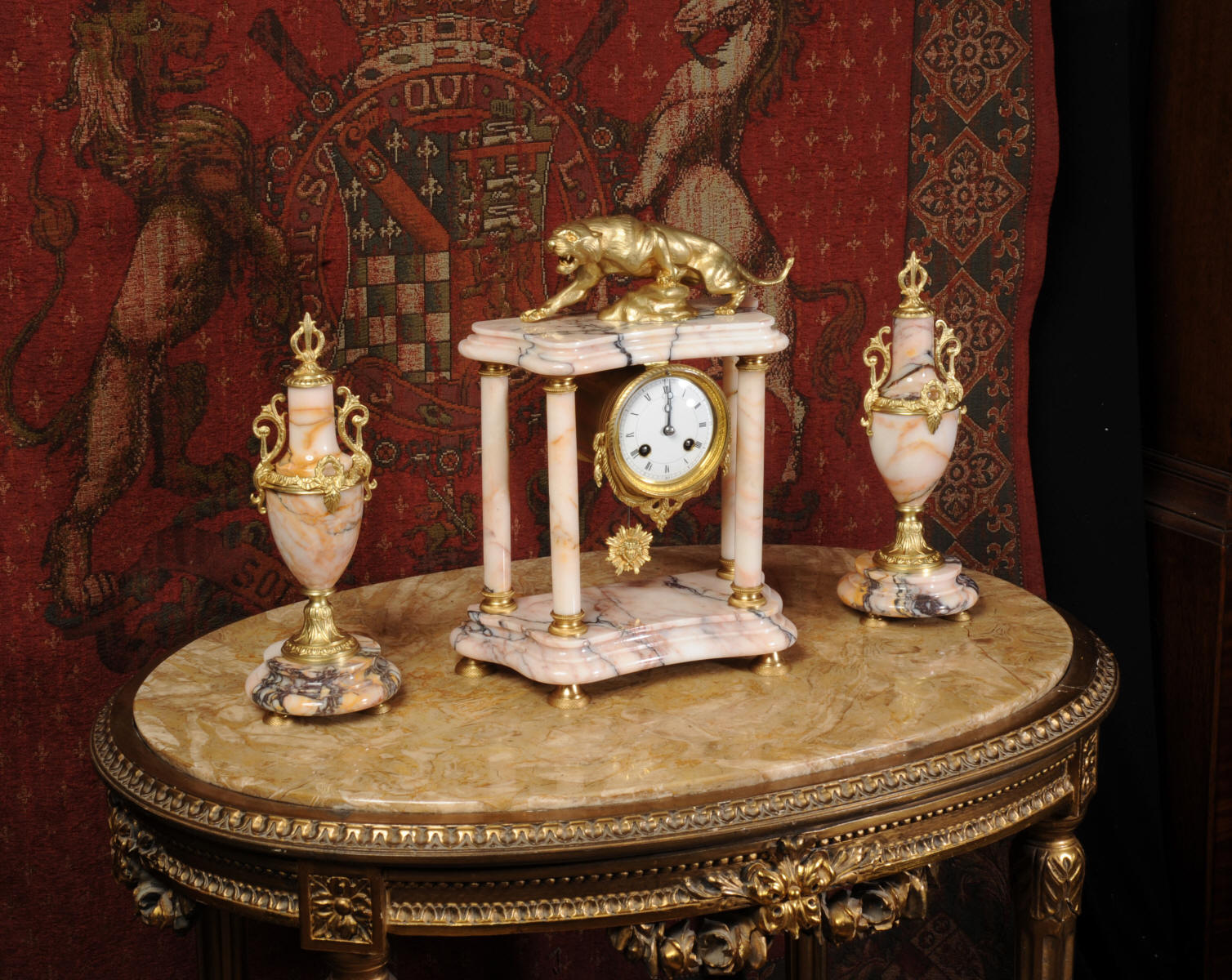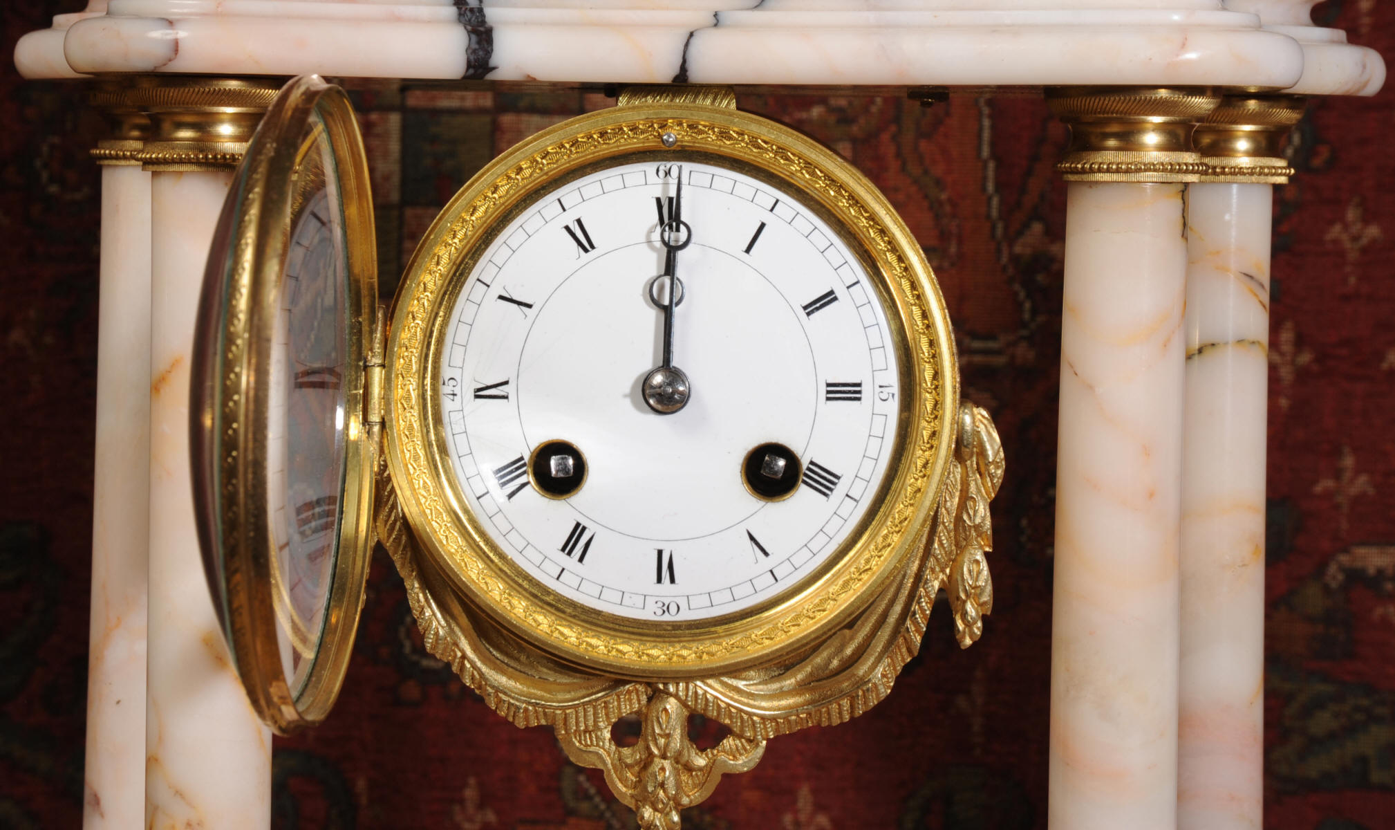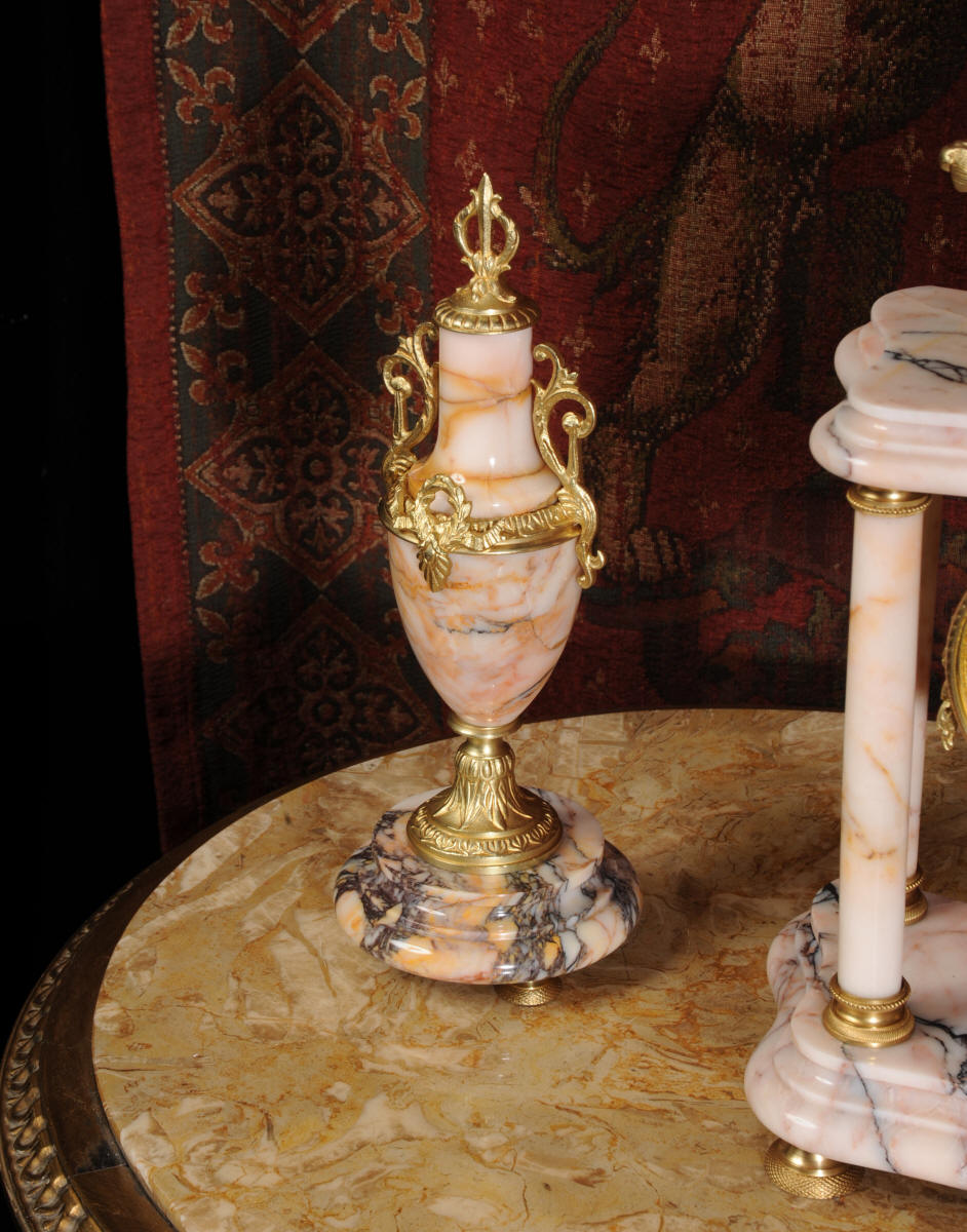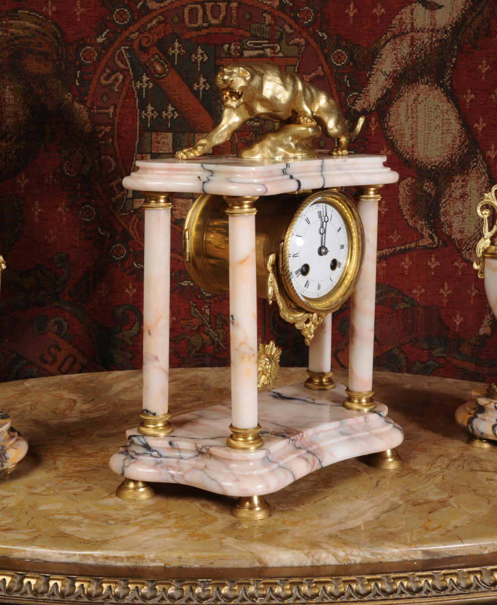 Condition of the case is excellent, the original gilding is beautifully clean and bright with hardly any wear or discolouration and there are no losses. The marble is also in good condition with a good polish. There are some occasional tiny nibbles to the edges. One urn has some hairlining along the grain of the stone. The cover of the other urn has a small chip that is hidden by the handle. The rear left hand column on the clock has a small chip top and bottom that are hardly noticeable. The dial is in excellent condition with just some faint hairlining.
