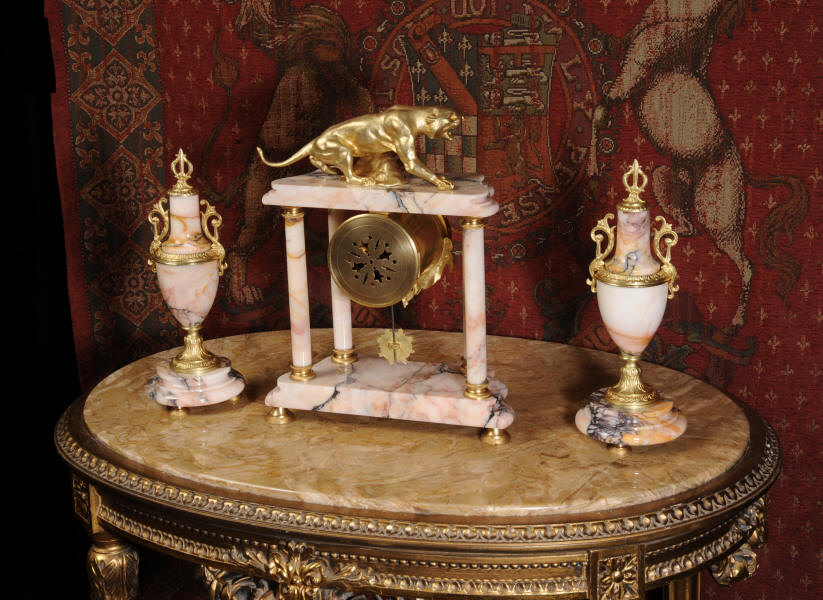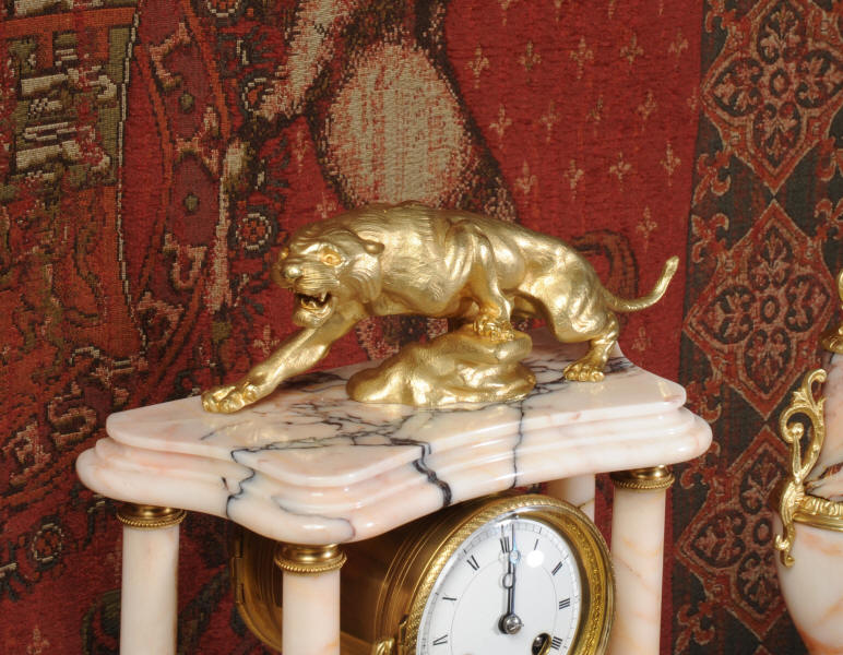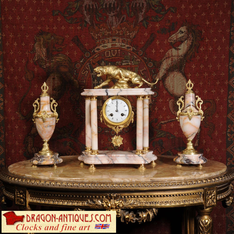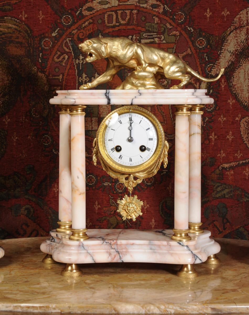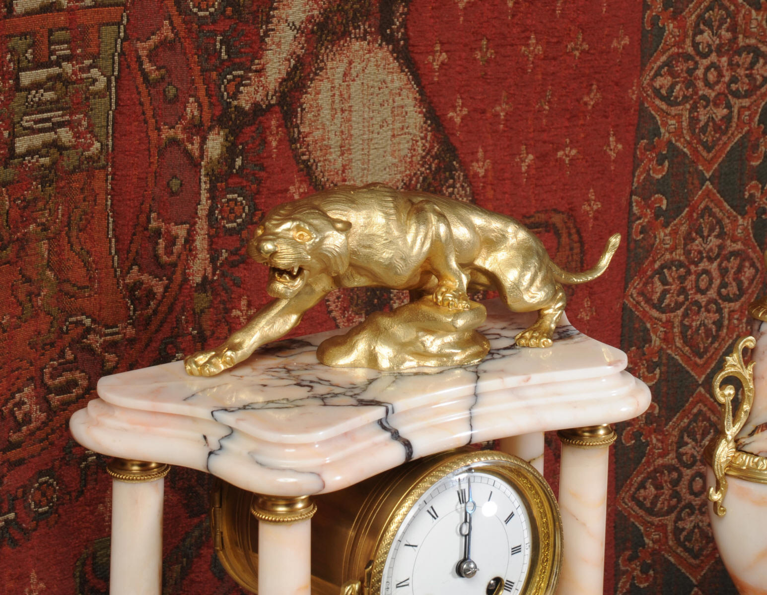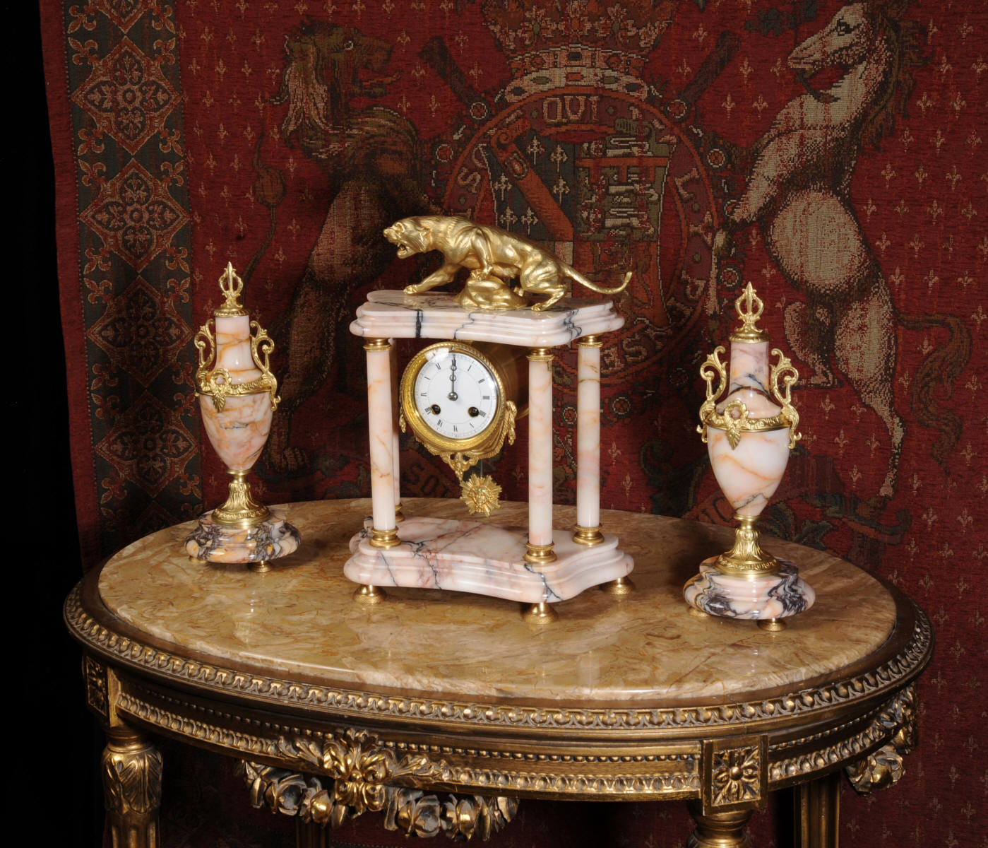 Condition of the case is excellent, the original gilding is beautifully clean and bright with hardly any wear or discolouration and there are no losses. The marble is also in good condition with a good polish. There are some occasional tiny nibbles to the edges. One urn has some hairlining along the grain of the stone. The cover of the other urn has a small chip that is hidden by the handle. The rear left hand column on the clock has a small chip top and bottom that are hardly noticeable. The dial is in excellent condition with just some faint hairlining.