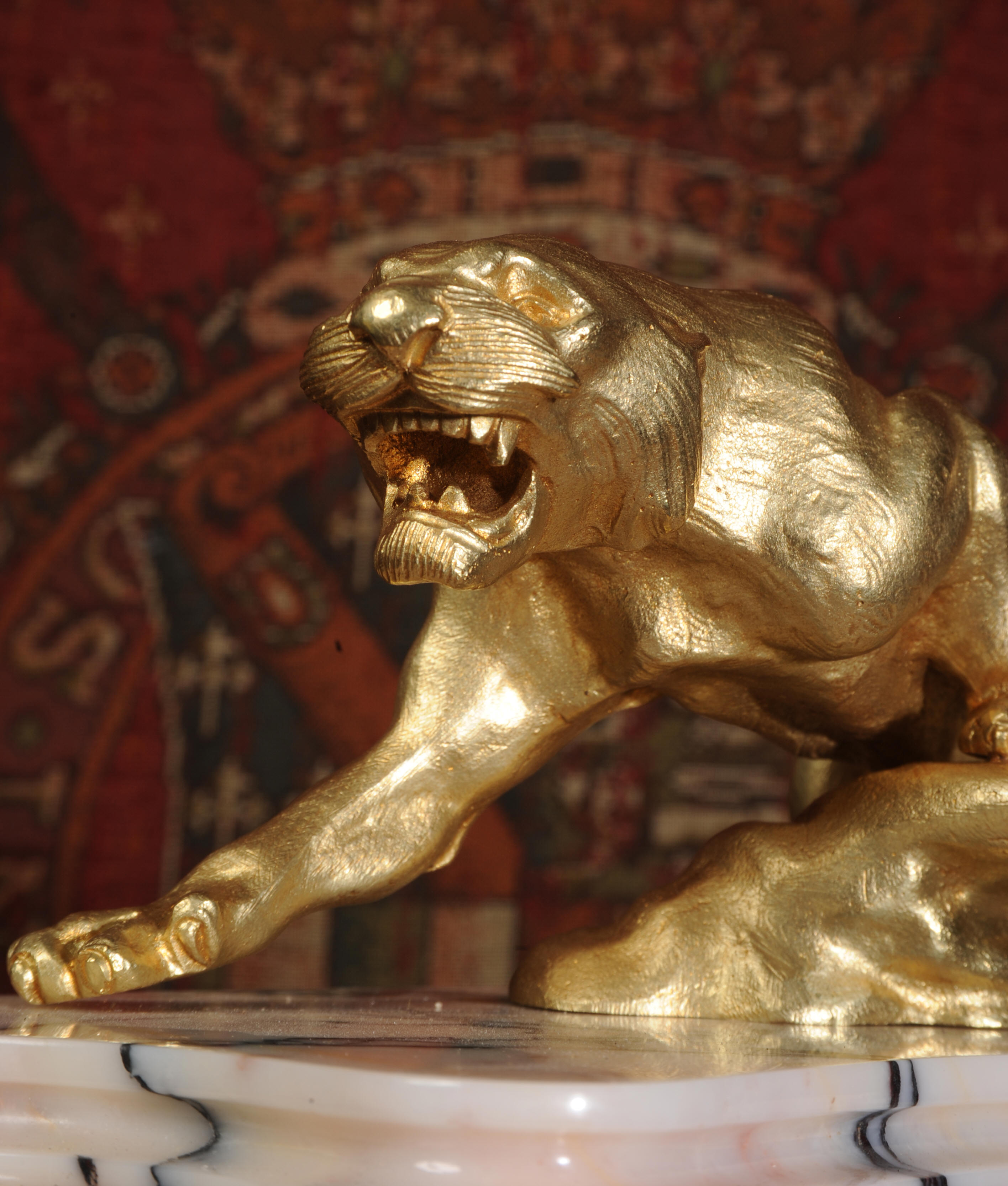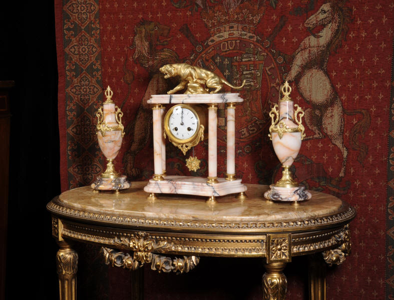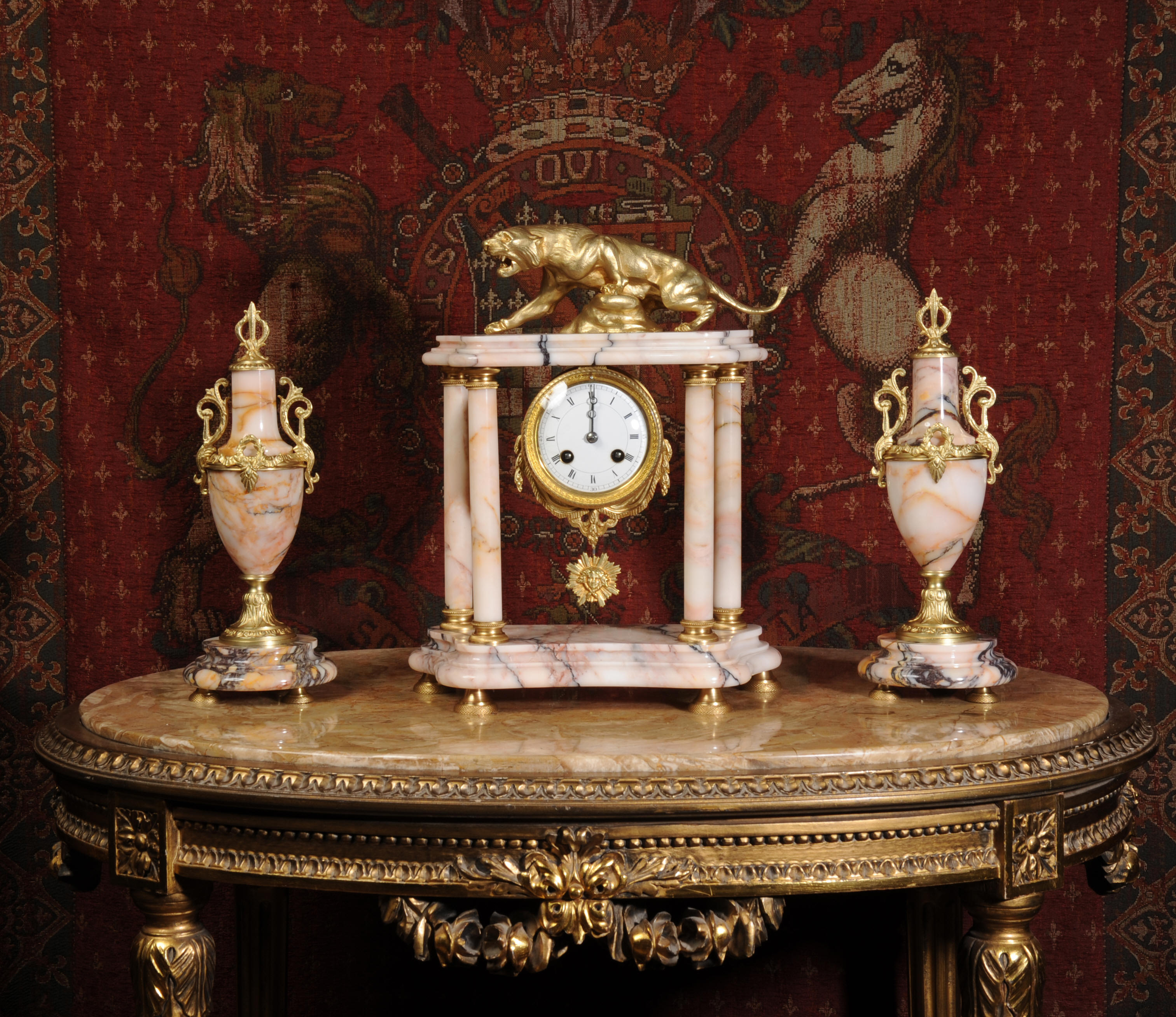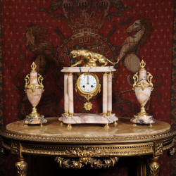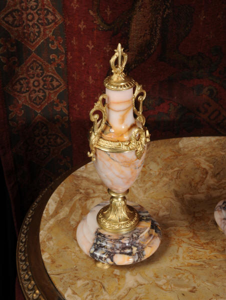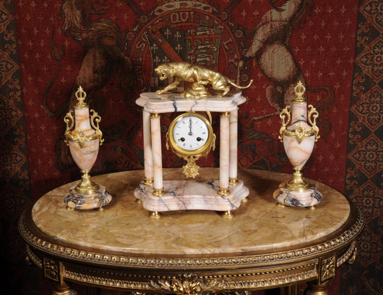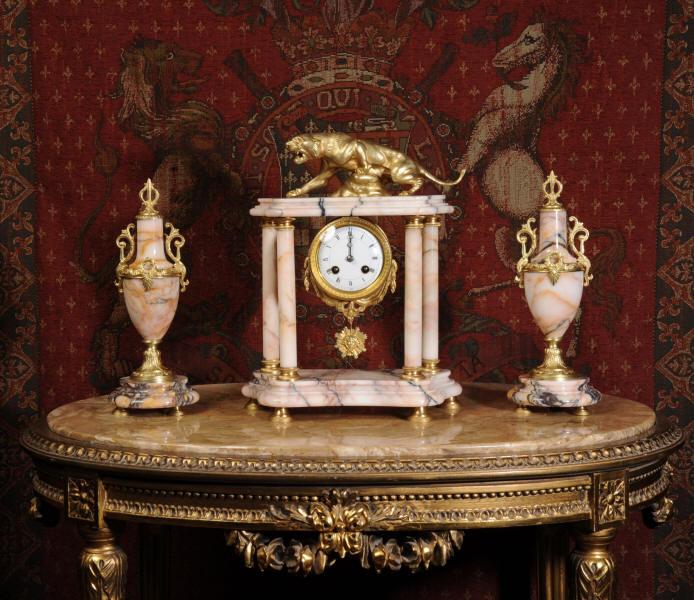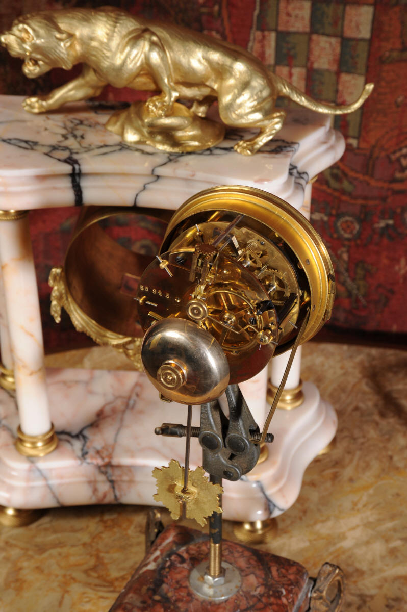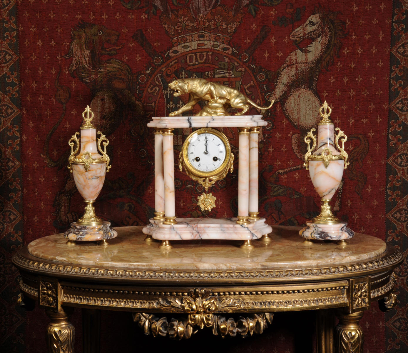 Condition of the case is excellent, the original gilding is beautifully clean and bright with hardly any wear or discolouration and there are no losses. The marble is also in good condition with a good polish. There are some occasional tiny nibbles to the edges. One urn has some hairlining along the grain of the stone. The cover of the other urn has a small chip that is hidden by the handle. The rear left hand column on the clock has a small chip top and bottom that are hardly noticeable. The dial is in excellent condition with just some faint hairlining.