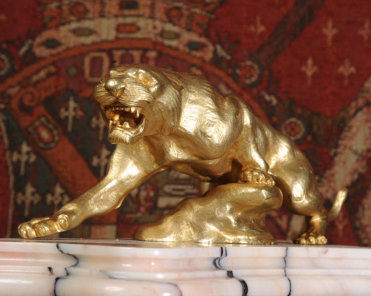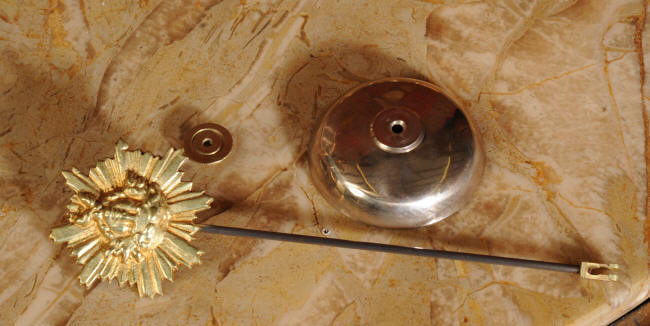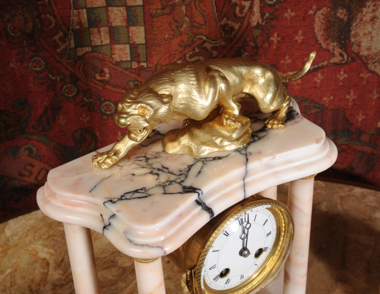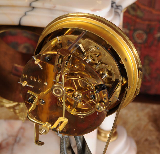 The French movement is of high quality and is in excellent clean and running condition having been fully overhauled by our clockmaker. Ormolu pendulum is original. It runs for 8 days and strikes the hours and halves on a bell. Click the video clip below to hear the bell and watch the clock running!
