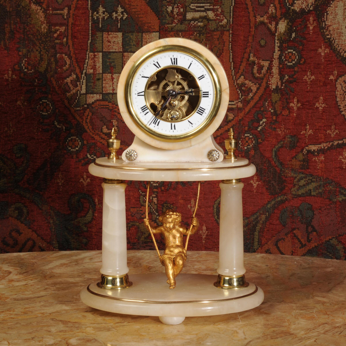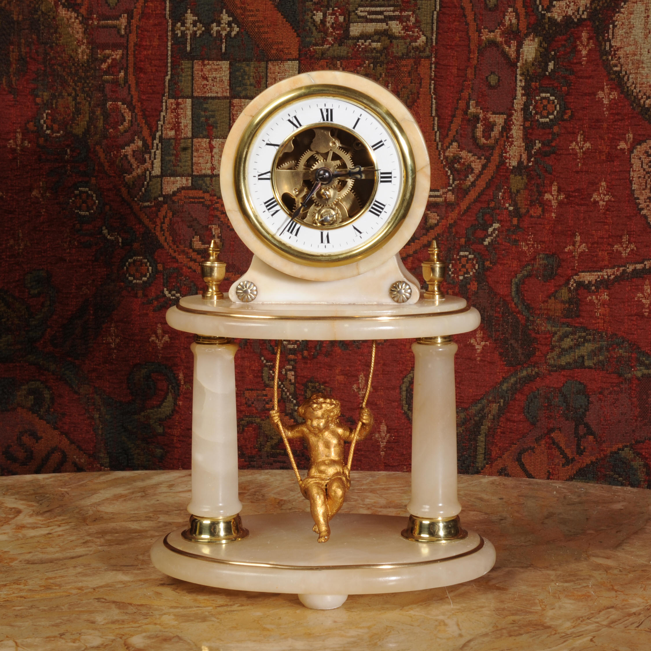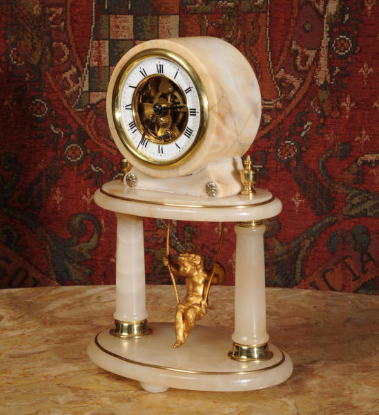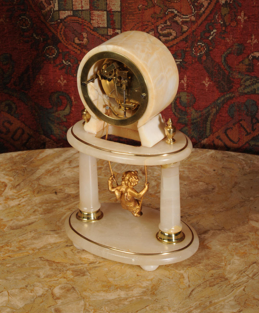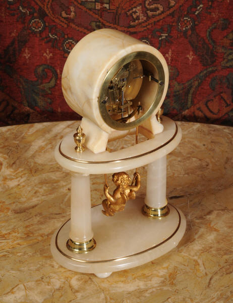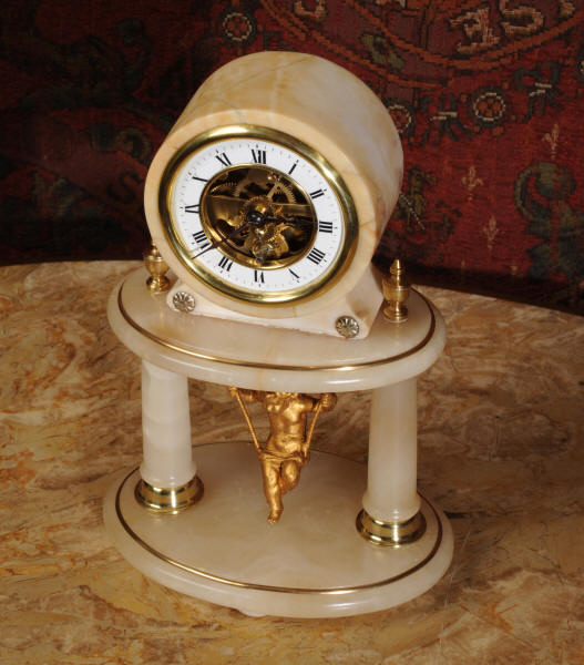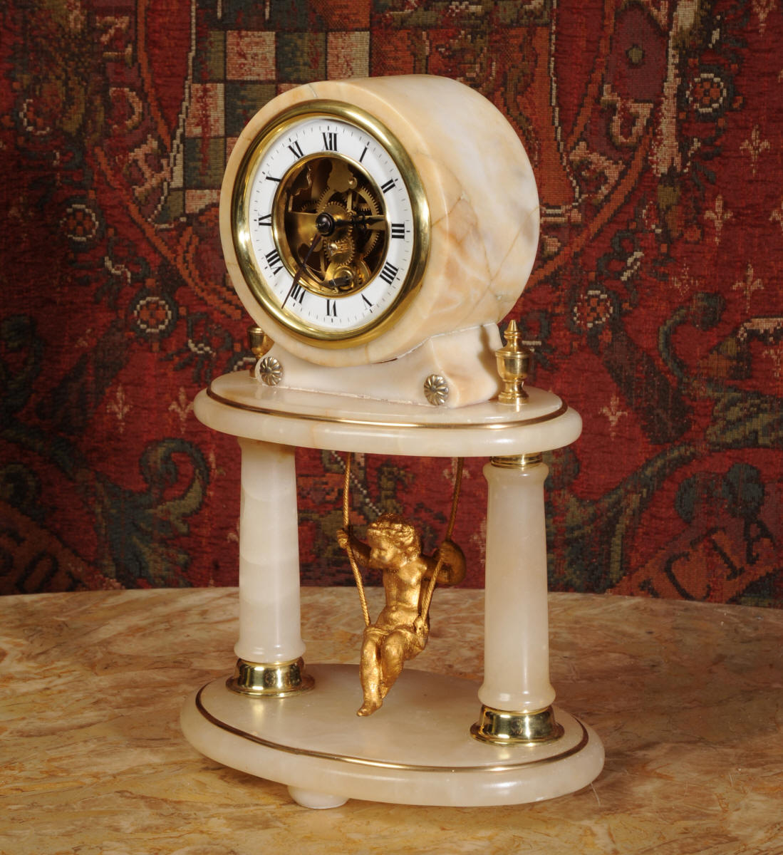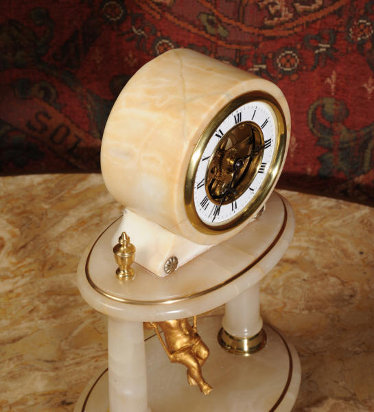 Condition of the case is good, alabaster is a delicate material and there is some old repair work to the drum and one of the pillars. This has been well carried out and is strong. There are also some marks, discolouration and nibbles to the edges, particularly to the rear of the top and around the top portion of the case. The dial is also in good condition with just some faint hailing and a small mark on the 12. The metal work including the cherub is in good clean and bright condition, there is some wear to the gilding on the cherub. This is a rare and delightful clock to add to your collection.