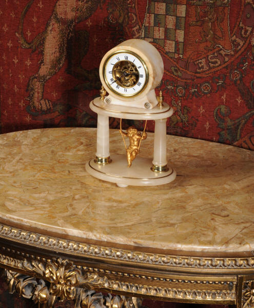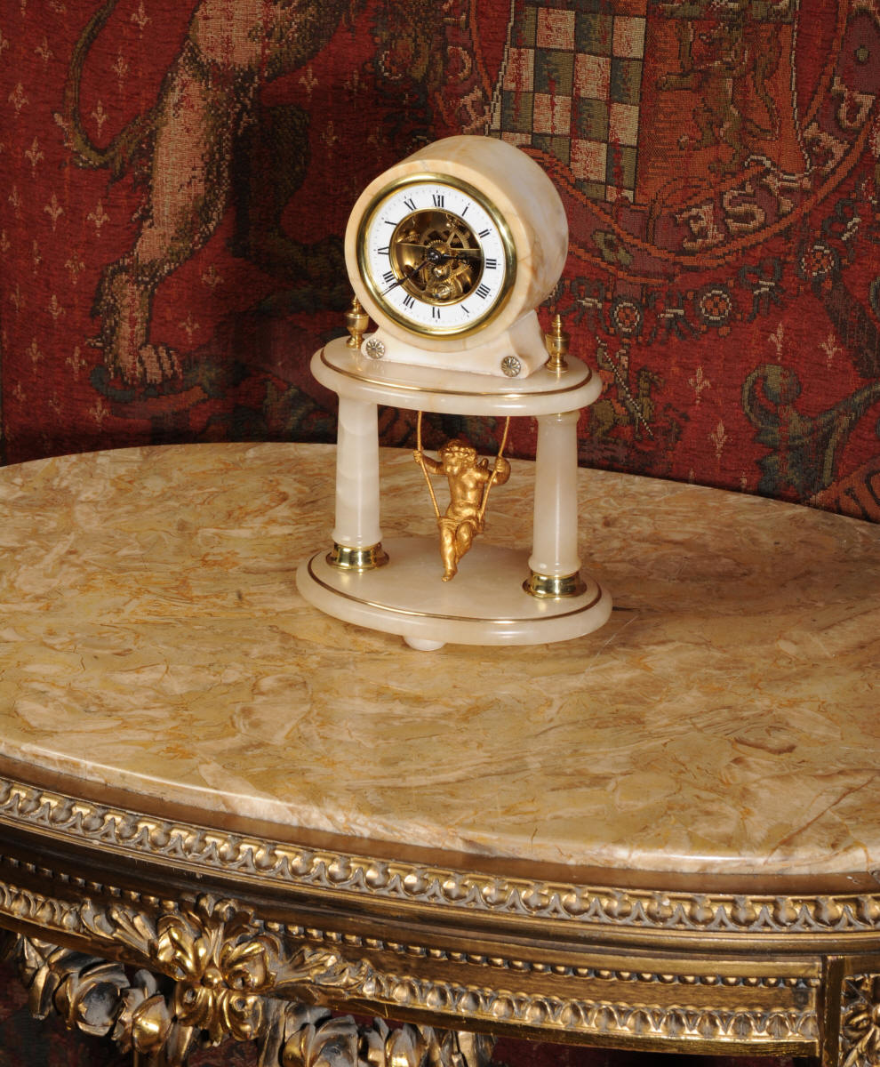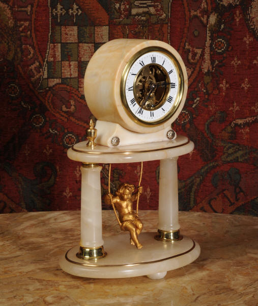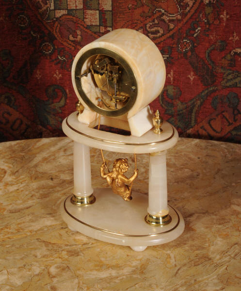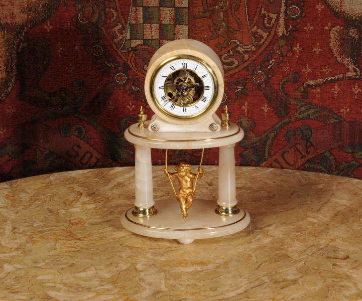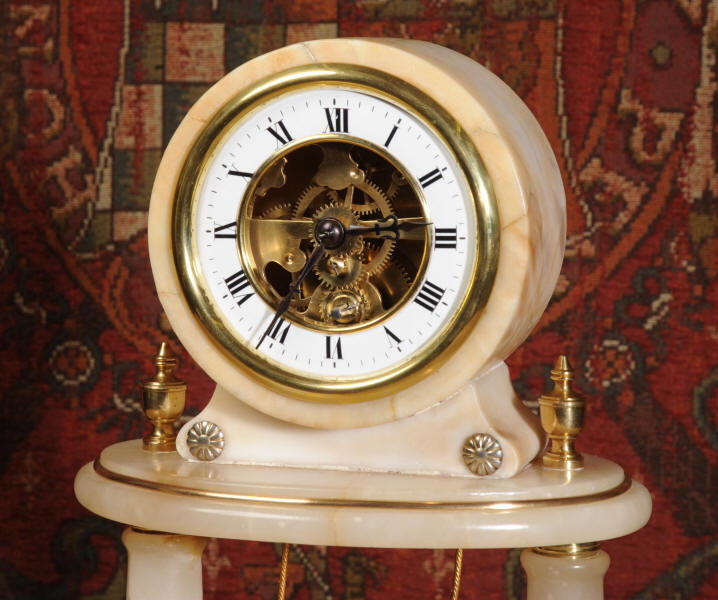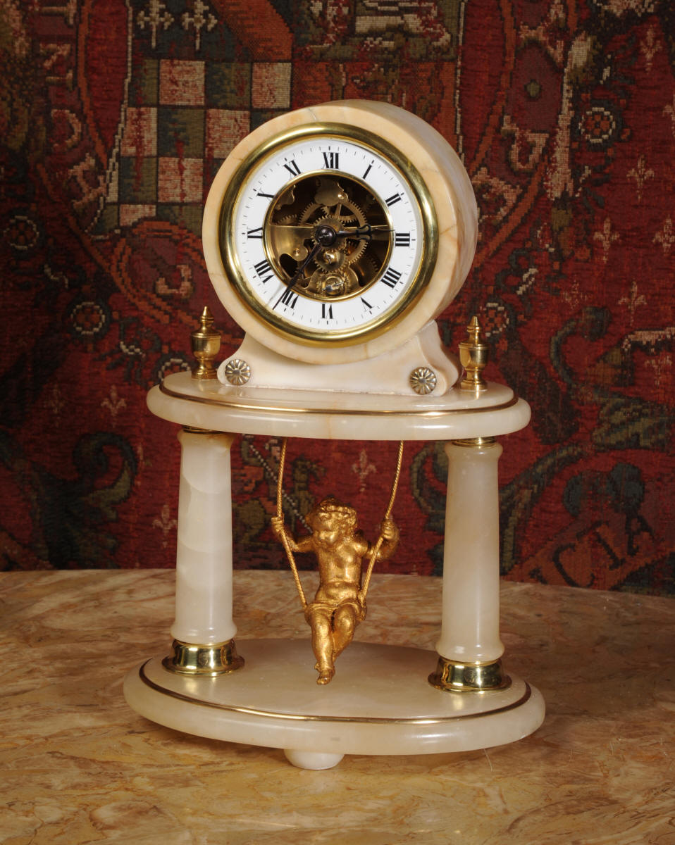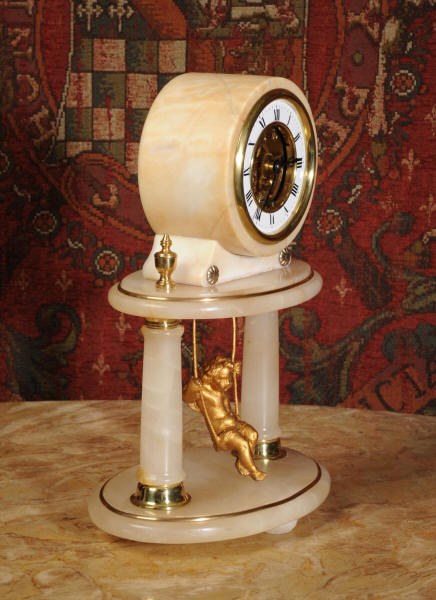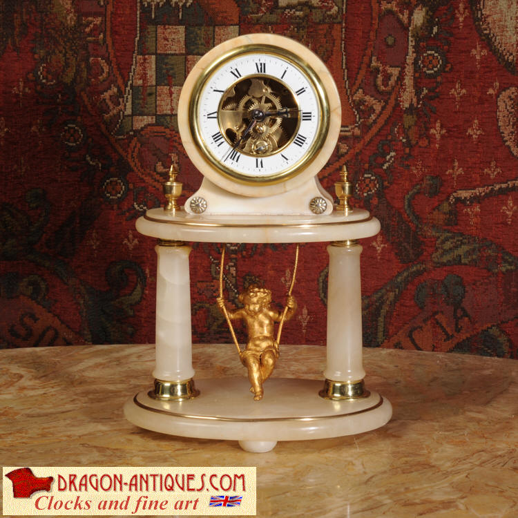 Condition of the case is good, alabaster is a delicate material and there is some old repair work to the drum and one of the pillars. This has been well carried out and is strong. There are also some marks, discolouration and nibbles to the edges, particularly to the rear of the top and around the top portion of the case. The dial is also in good condition with just some faint hailing and a small mark on the 12. The metal work including the cherub is in good clean and bright condition, there is some wear to the gilding on the cherub. This is a rare and delightful clock to add to your collection.
