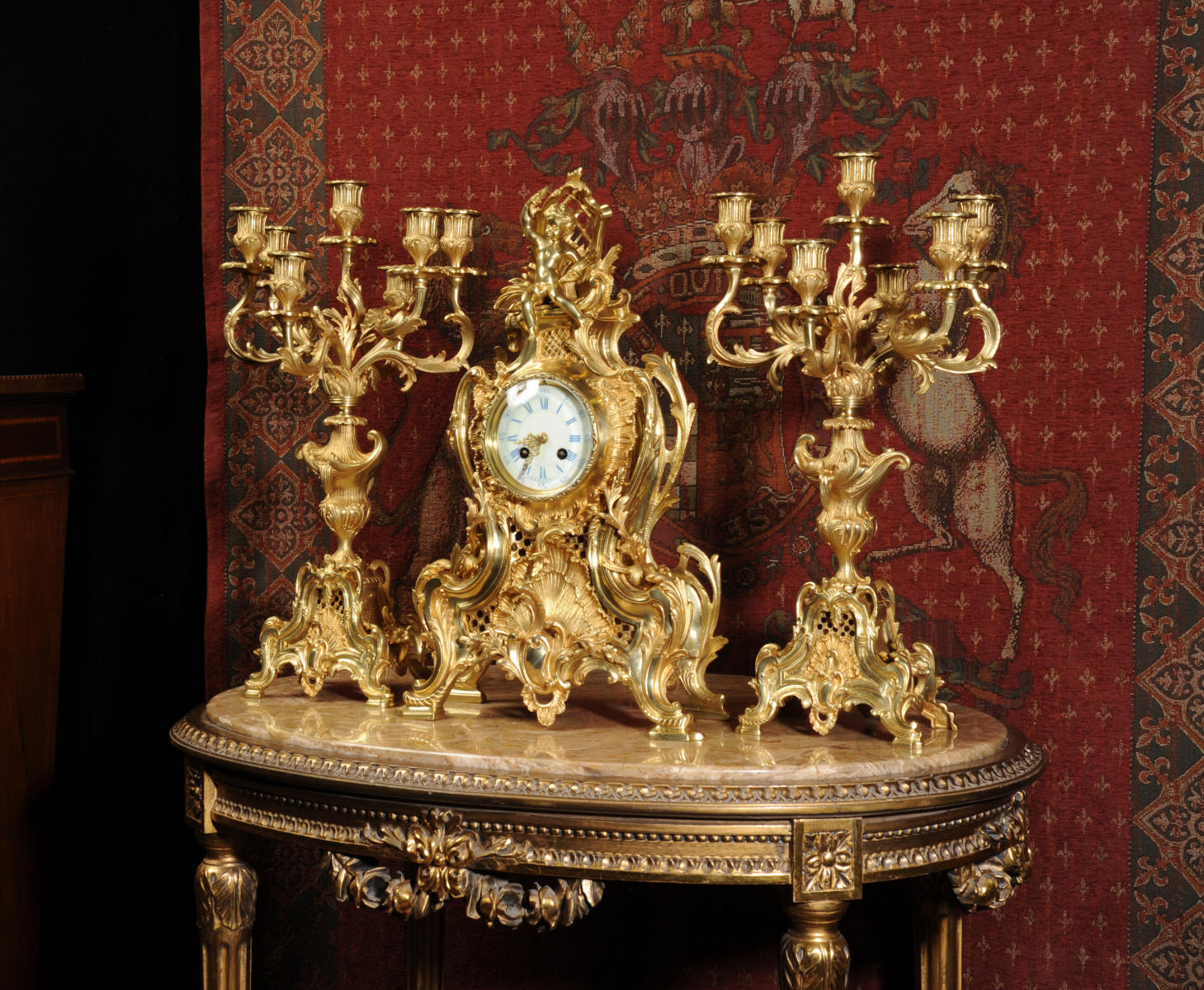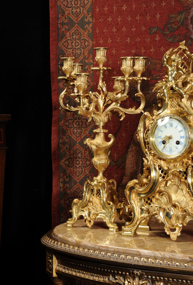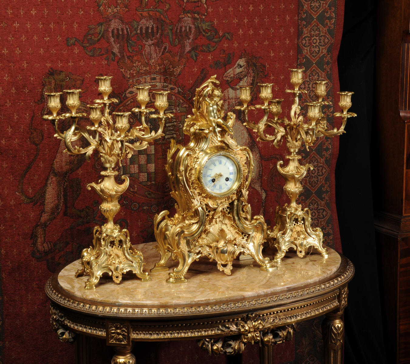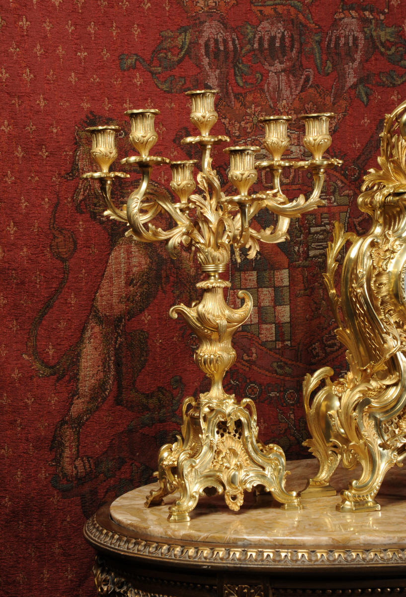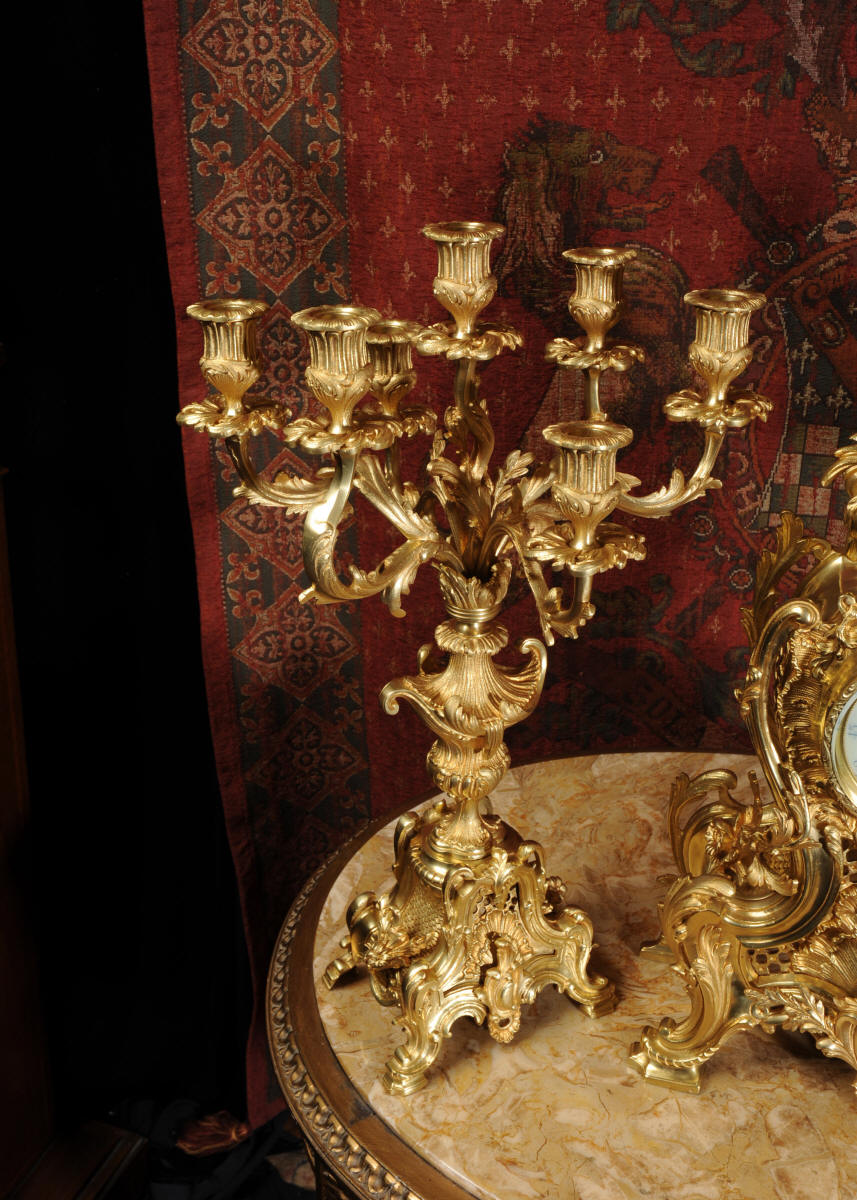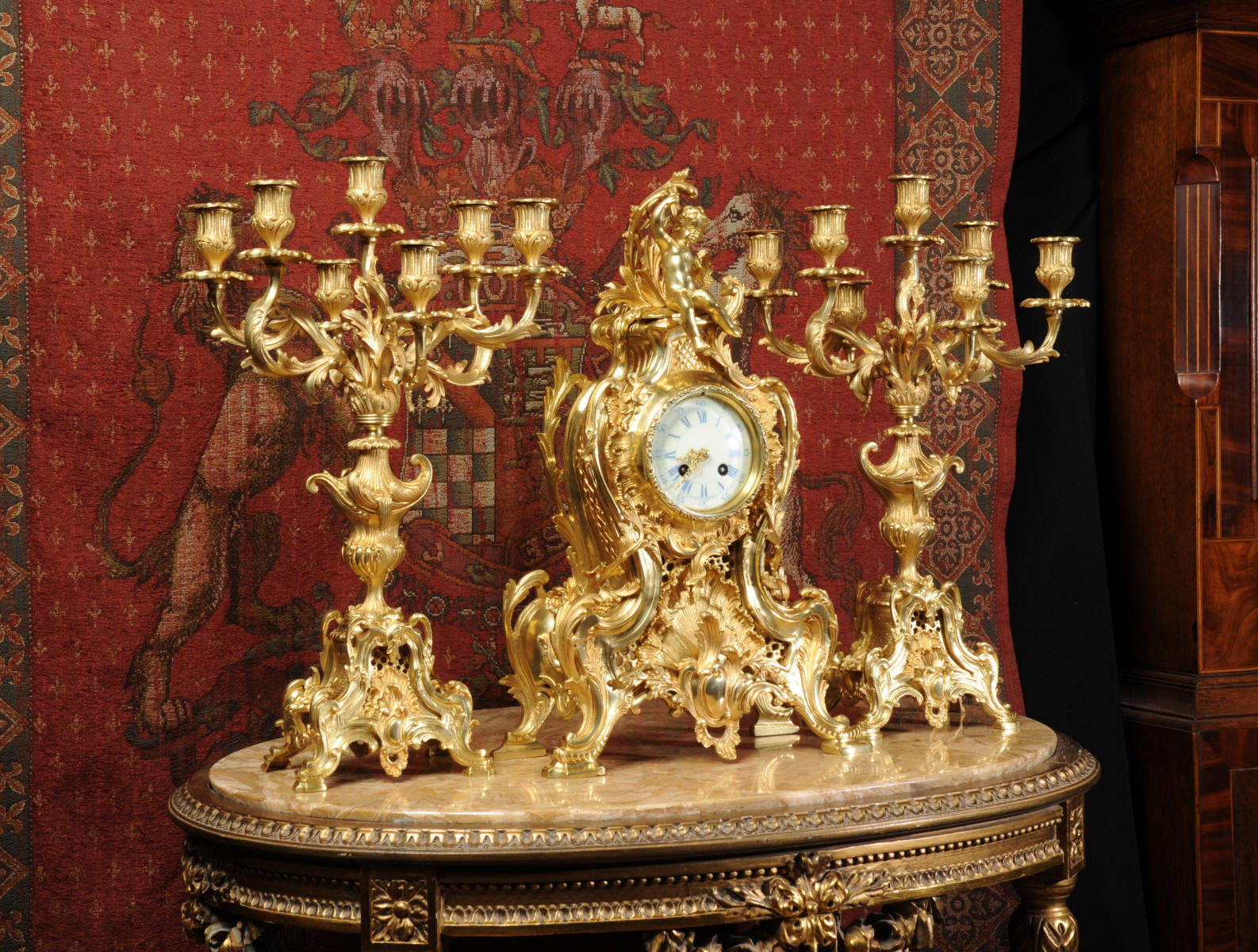 Condition of the case is excellent, the original gilding is beautifully clean and bright with hardly any wear or discolouration and there are no losses. The dial is also in excellent condition just some tiny nibbles to the winding holes and a light hairline. Candelabra are slightly distorted and one nozzle insert is a replacement or has been repaired. The set makes a stunning display as you can see below.