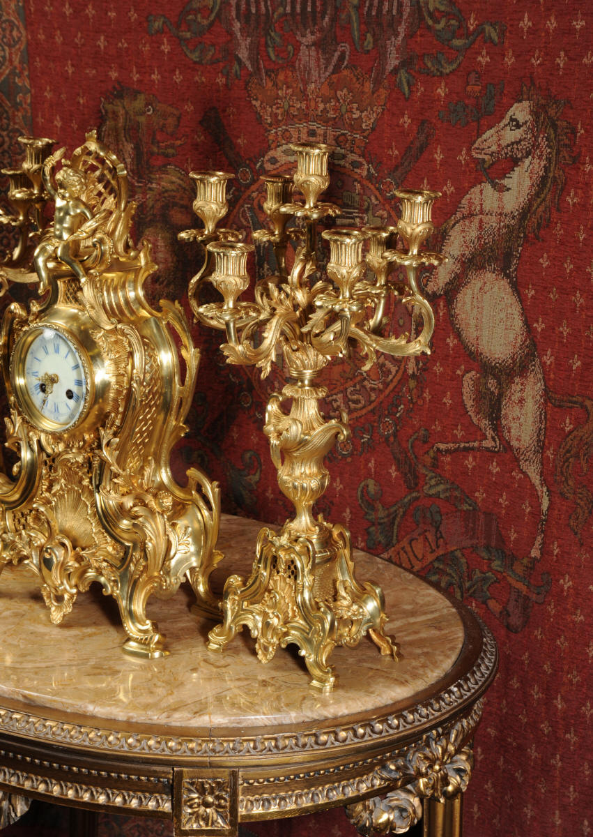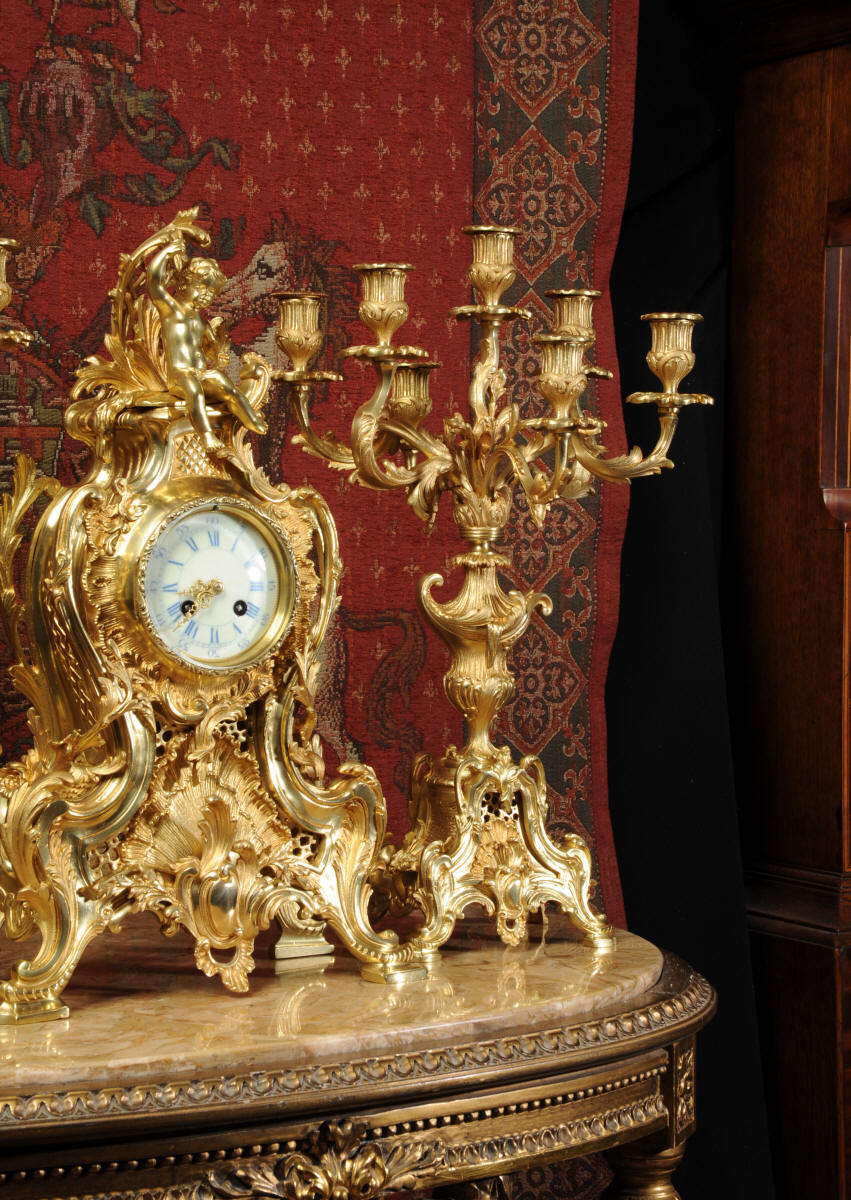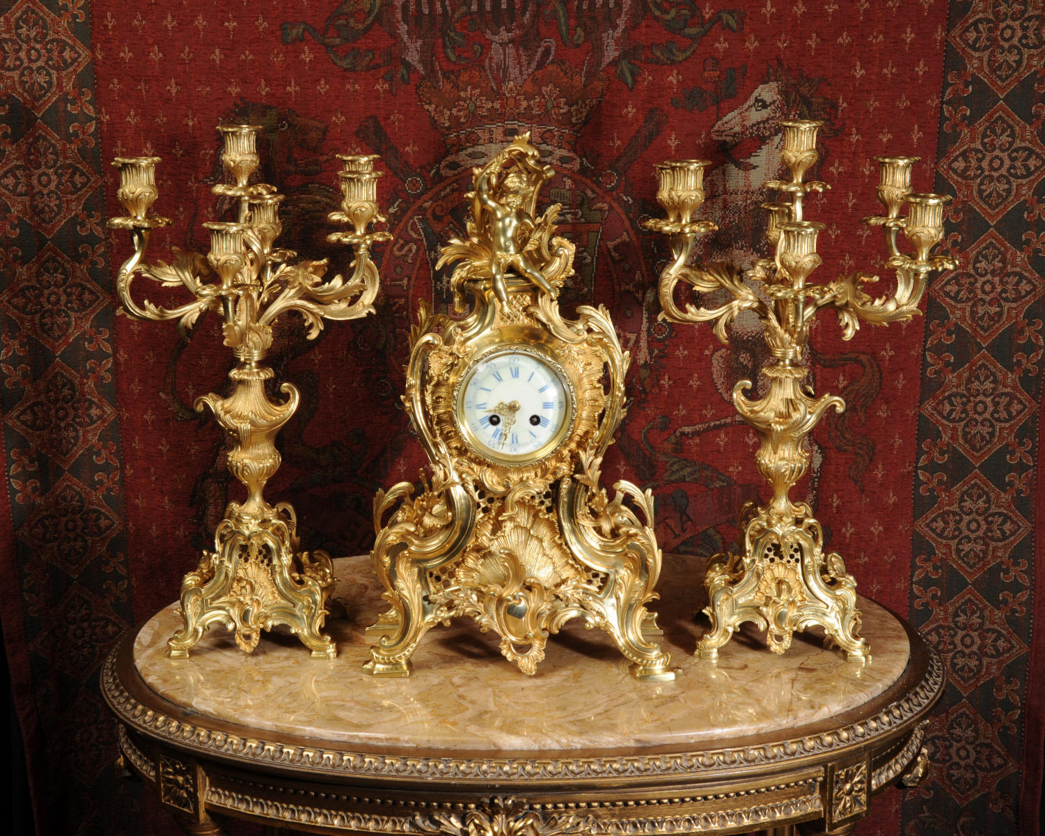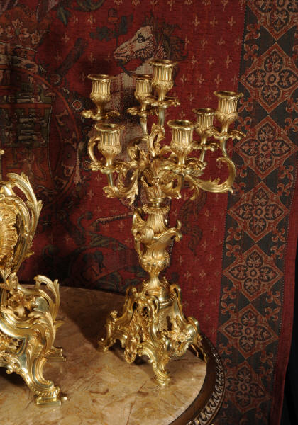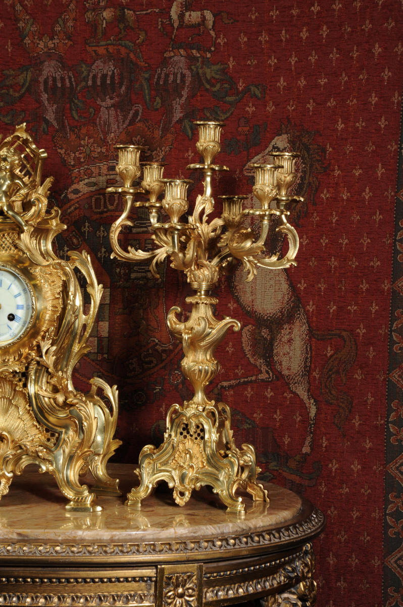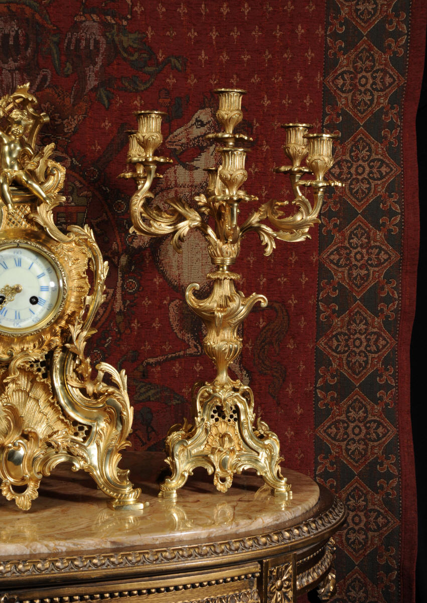 Condition of the case is excellent, the original gilding is beautifully clean and bright with hardly any wear or discolouration and there are no losses. The dial is also in excellent condition just some tiny nibbles to the winding holes and a light hairline. Candelabra are slightly distorted and one nozzle insert is a replacement or has been repaired. The set makes a stunning display as you can see below.