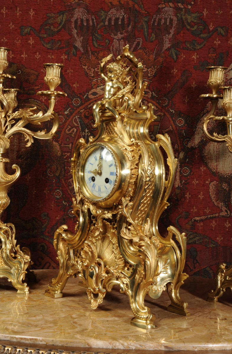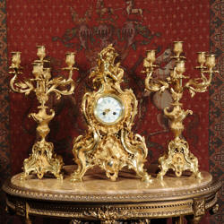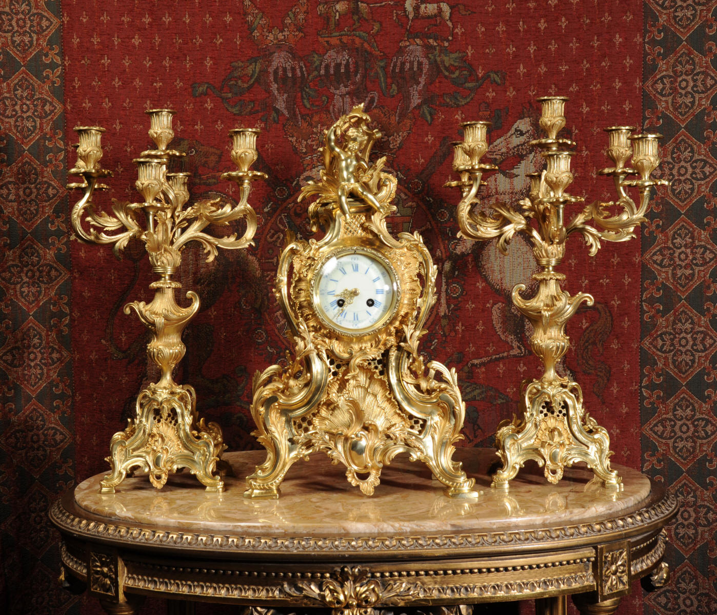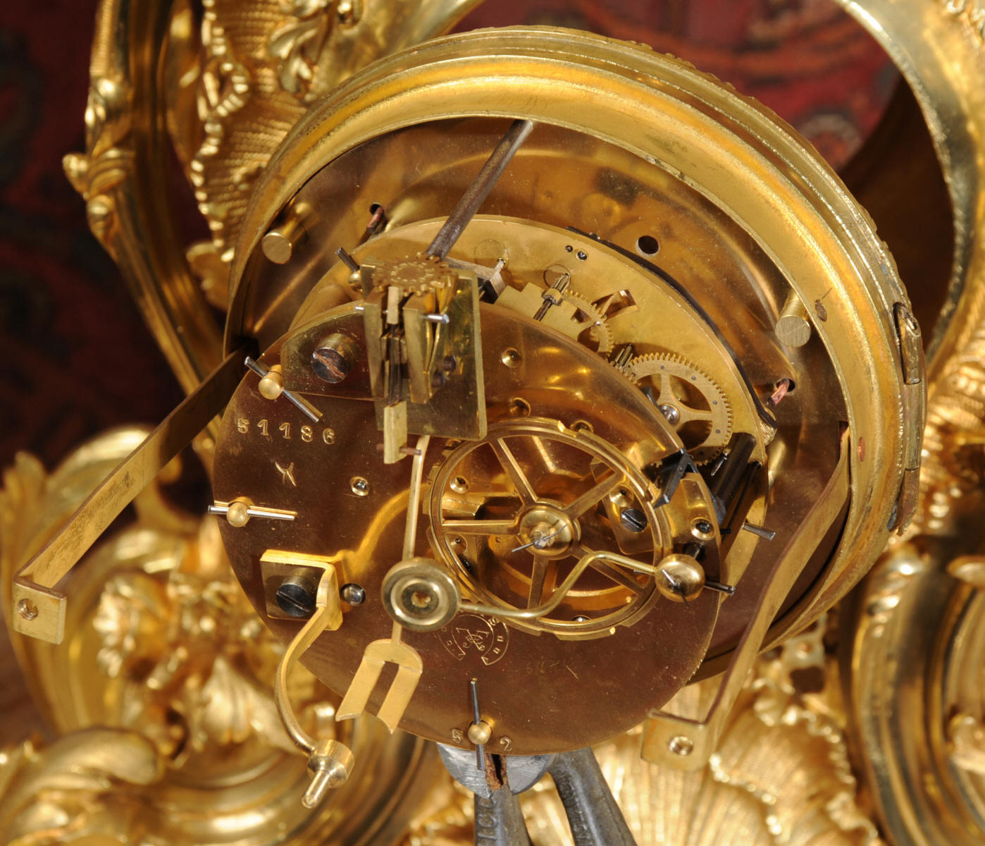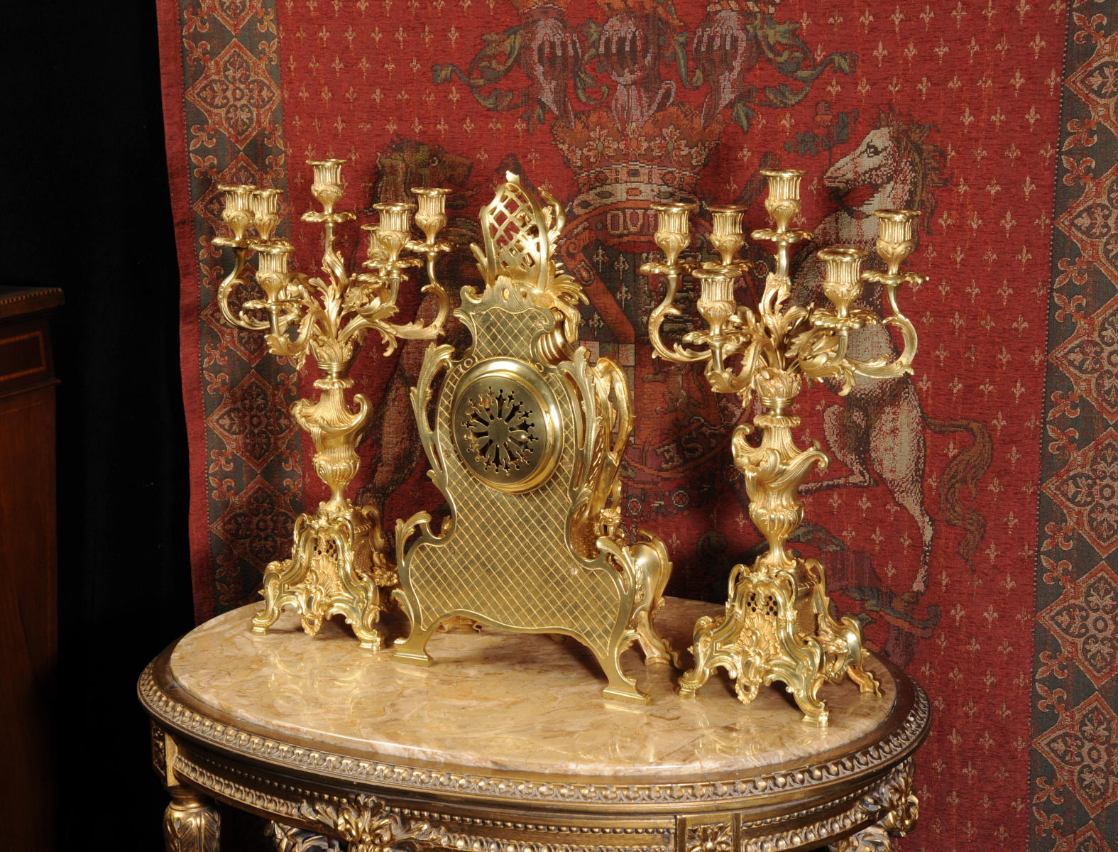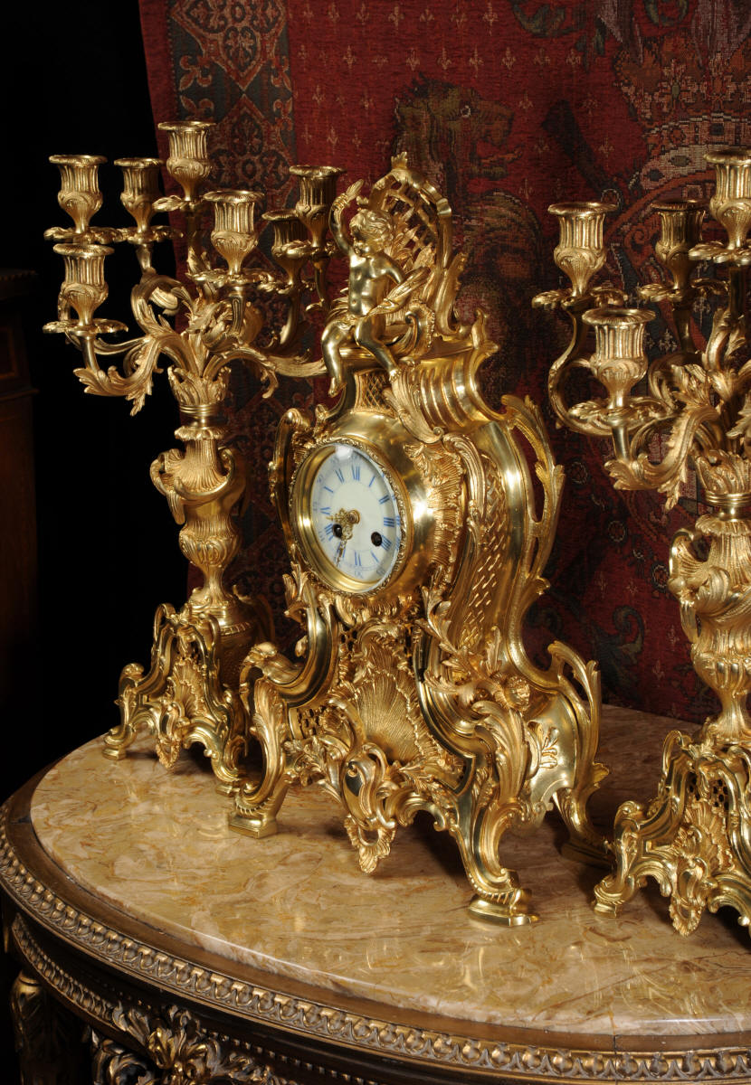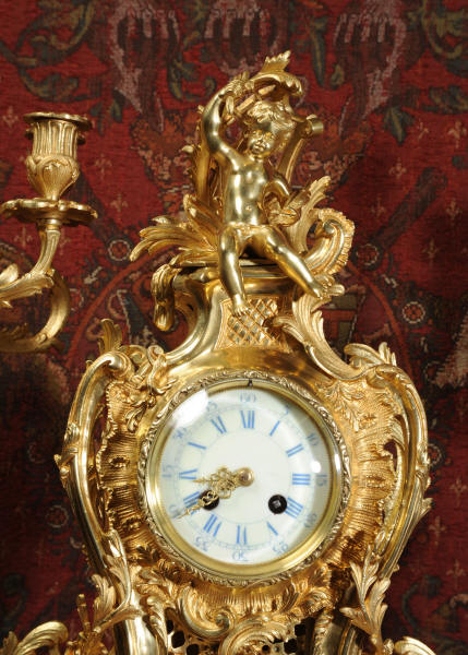 Condition of the case is excellent, the original gilding is beautifully clean and bright with hardly any wear or discolouration and there are no losses. The dial is also in excellent condition just some tiny nibbles to the winding holes and a light hairline. Candelabra are slightly distorted and one nozzle insert is a replacement or has been repaired. The set makes a stunning display as you can see below.
