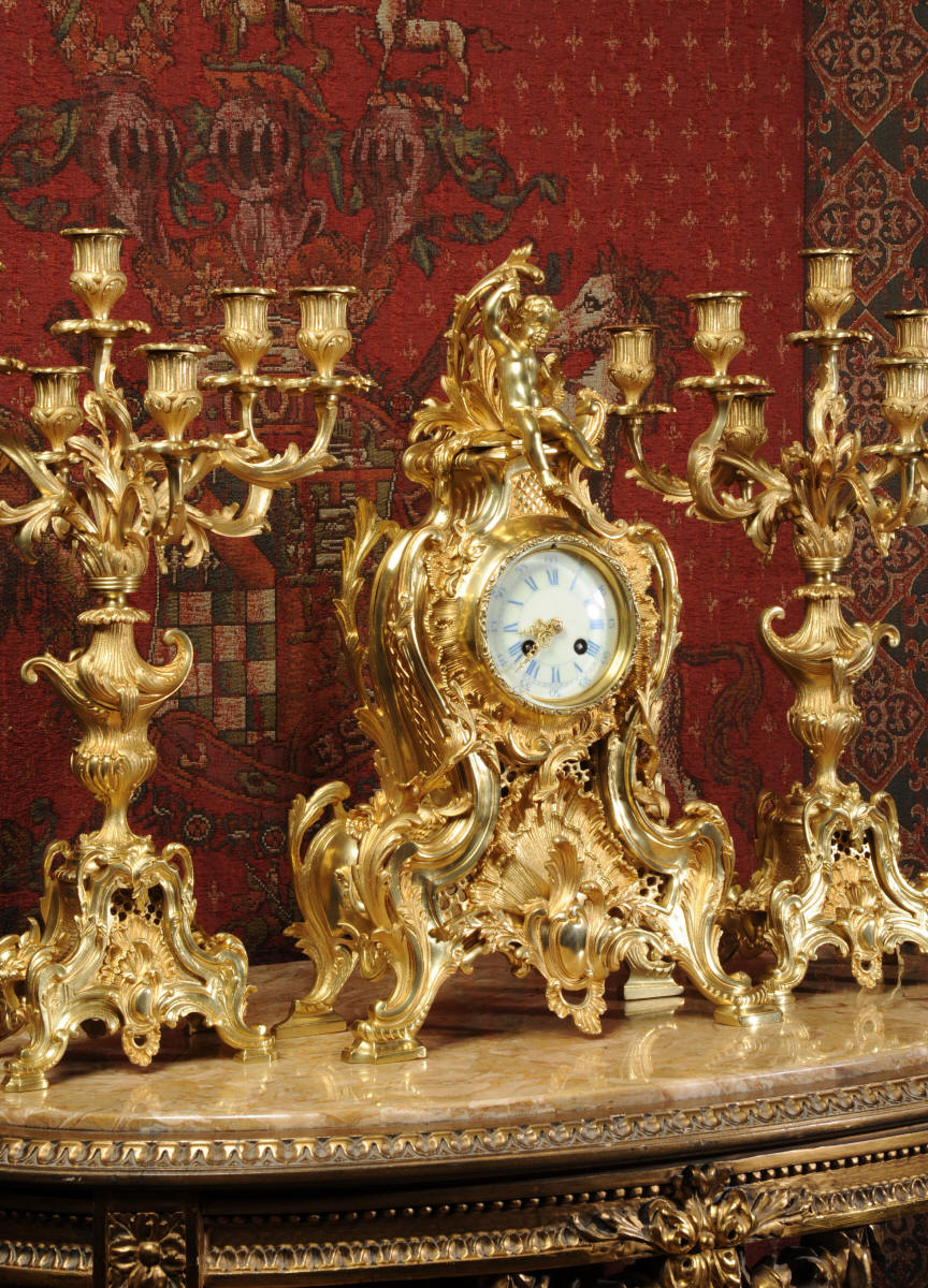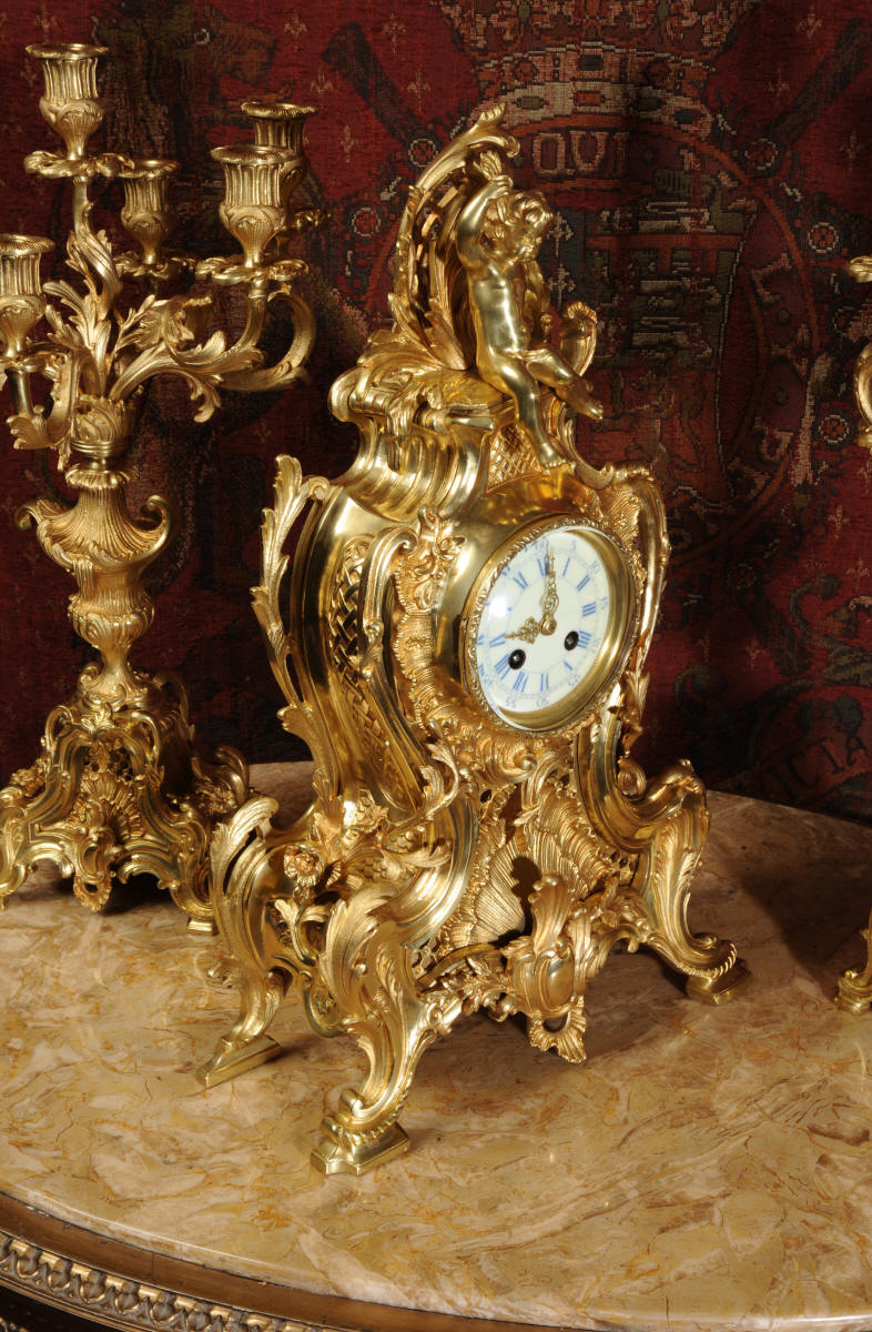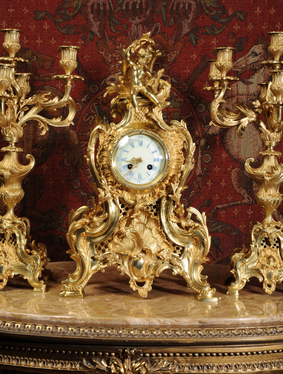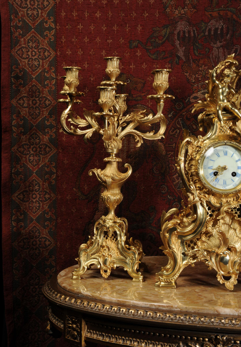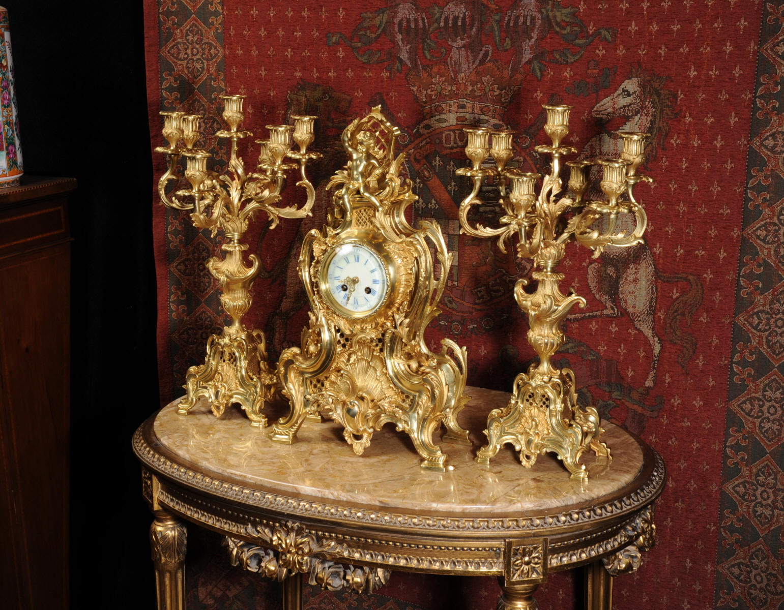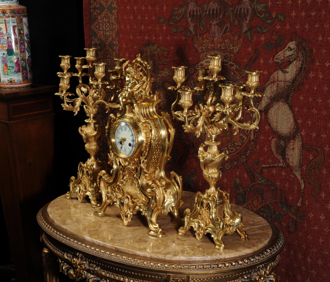 Condition of the case is excellent, the original gilding is beautifully clean and bright with hardly any wear or discolouration and there are no losses. The dial is also in excellent condition just some tiny nibbles to the winding holes and a light hairline. Candelabra are slightly distorted and one nozzle insert is a replacement or has been repaired. The set makes a stunning display as you can see below.