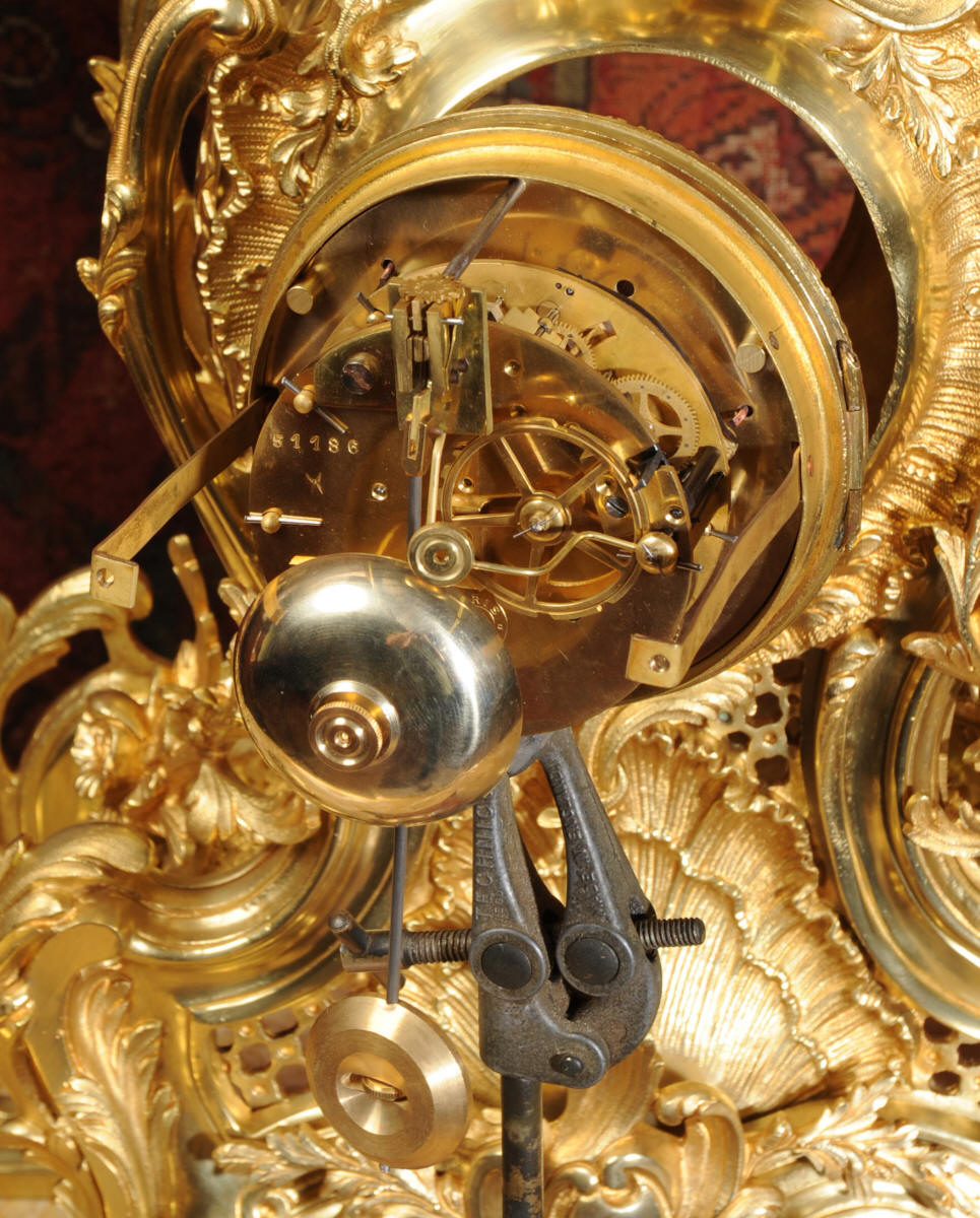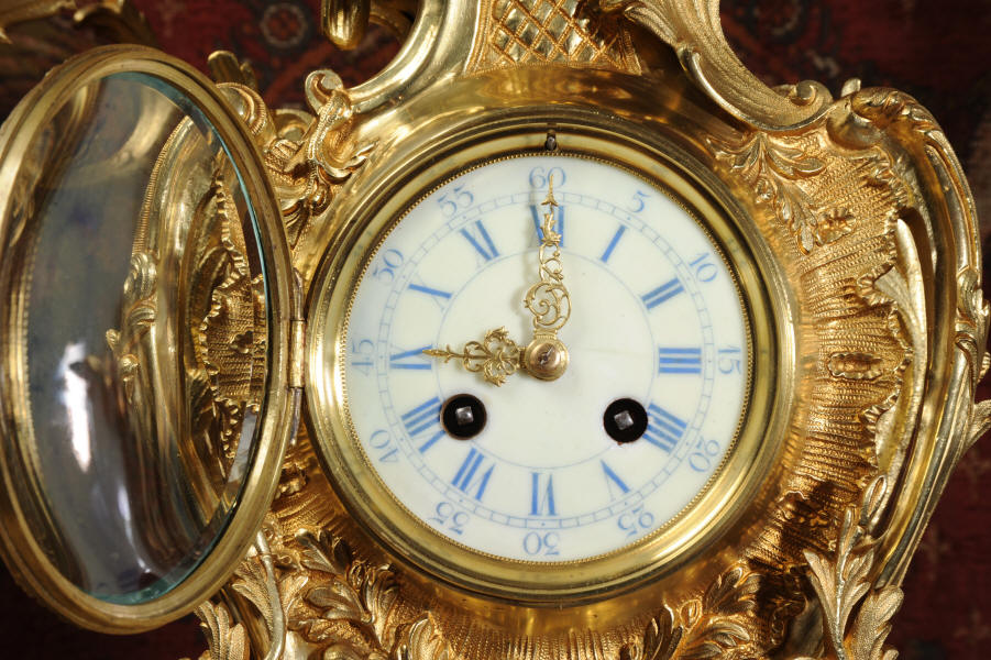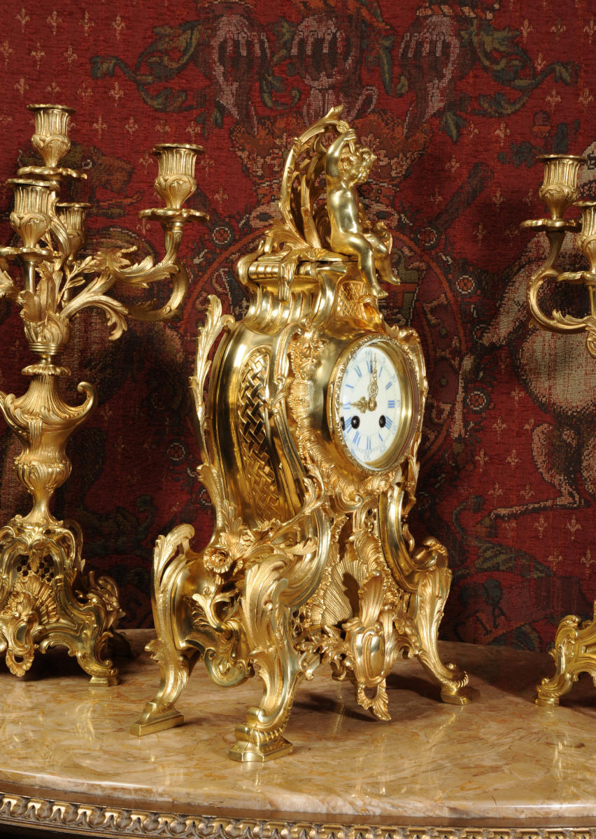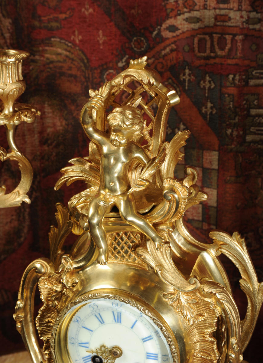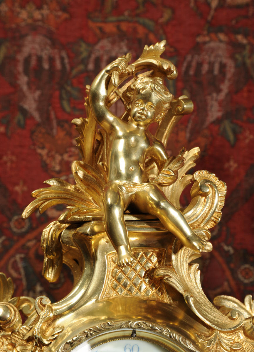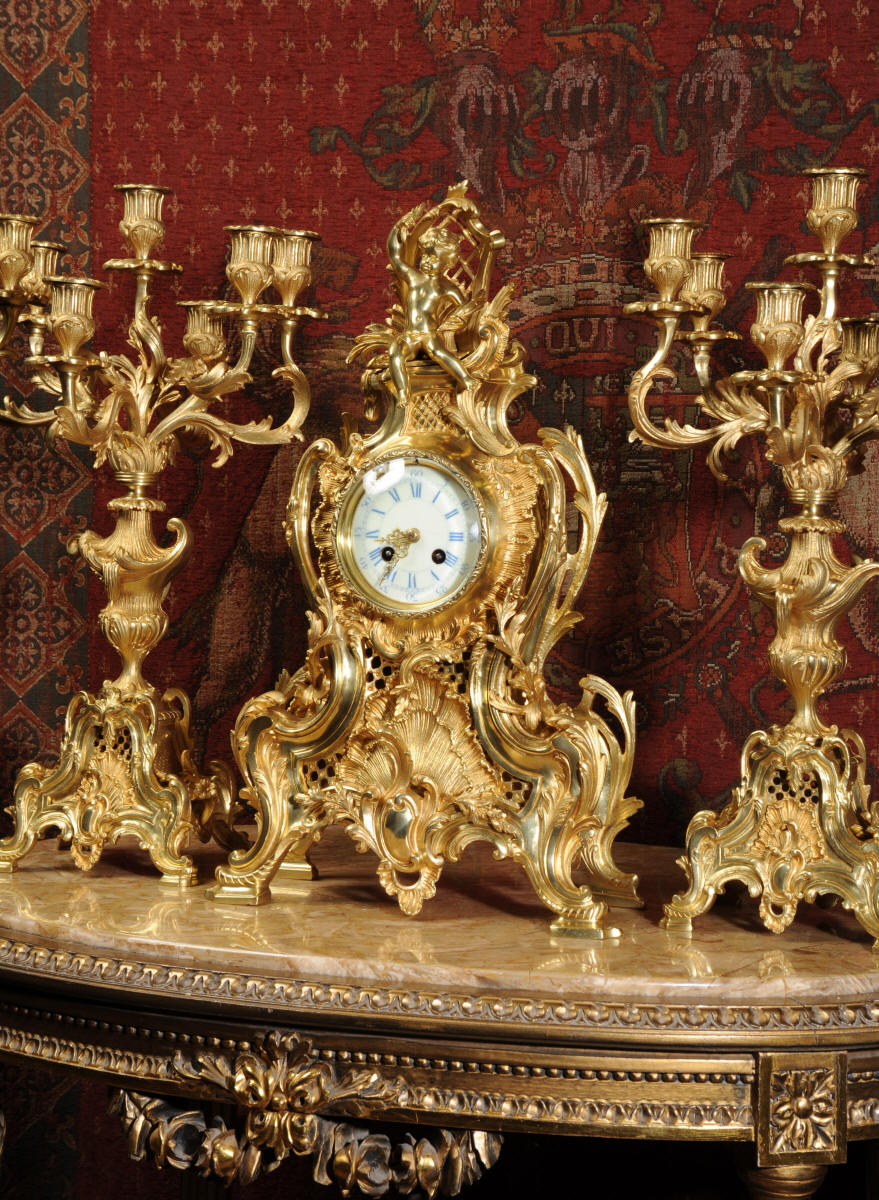 Condition of the case is excellent, the original gilding is beautifully clean and bright with hardly any wear or discolouration and there are no losses. The dial is also in excellent condition just some tiny nibbles to the winding holes and a light hairline. Candelabra are slightly distorted and one nozzle insert is a replacement or has been repaired. The set makes a stunning display as you can see below.