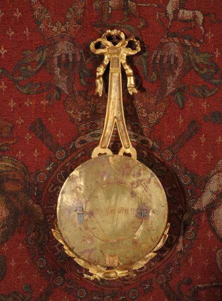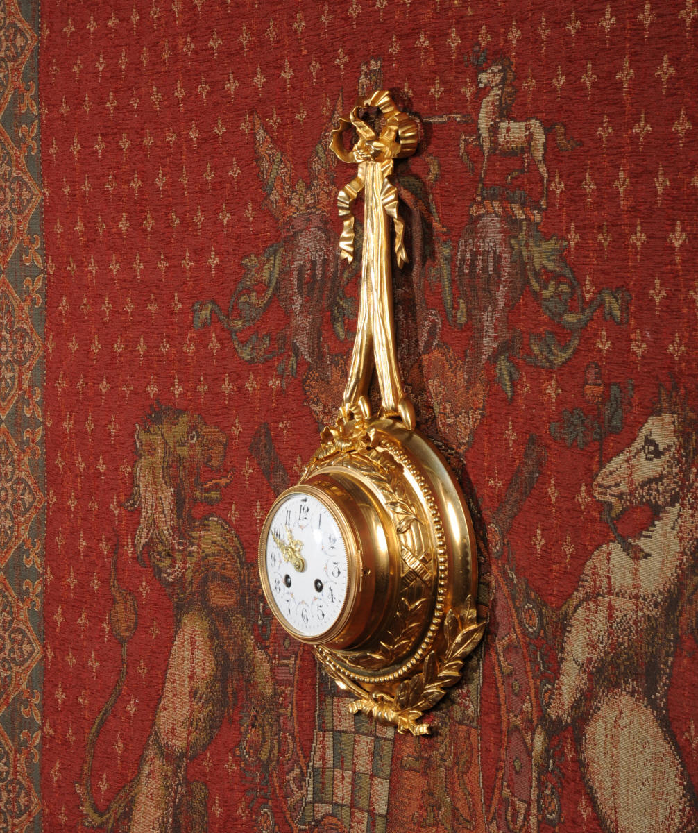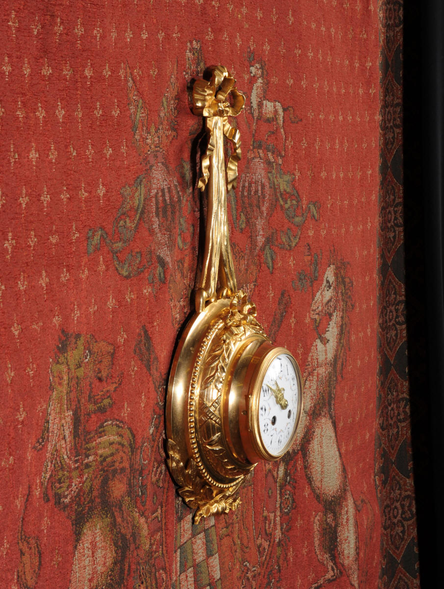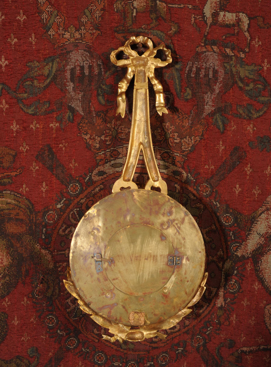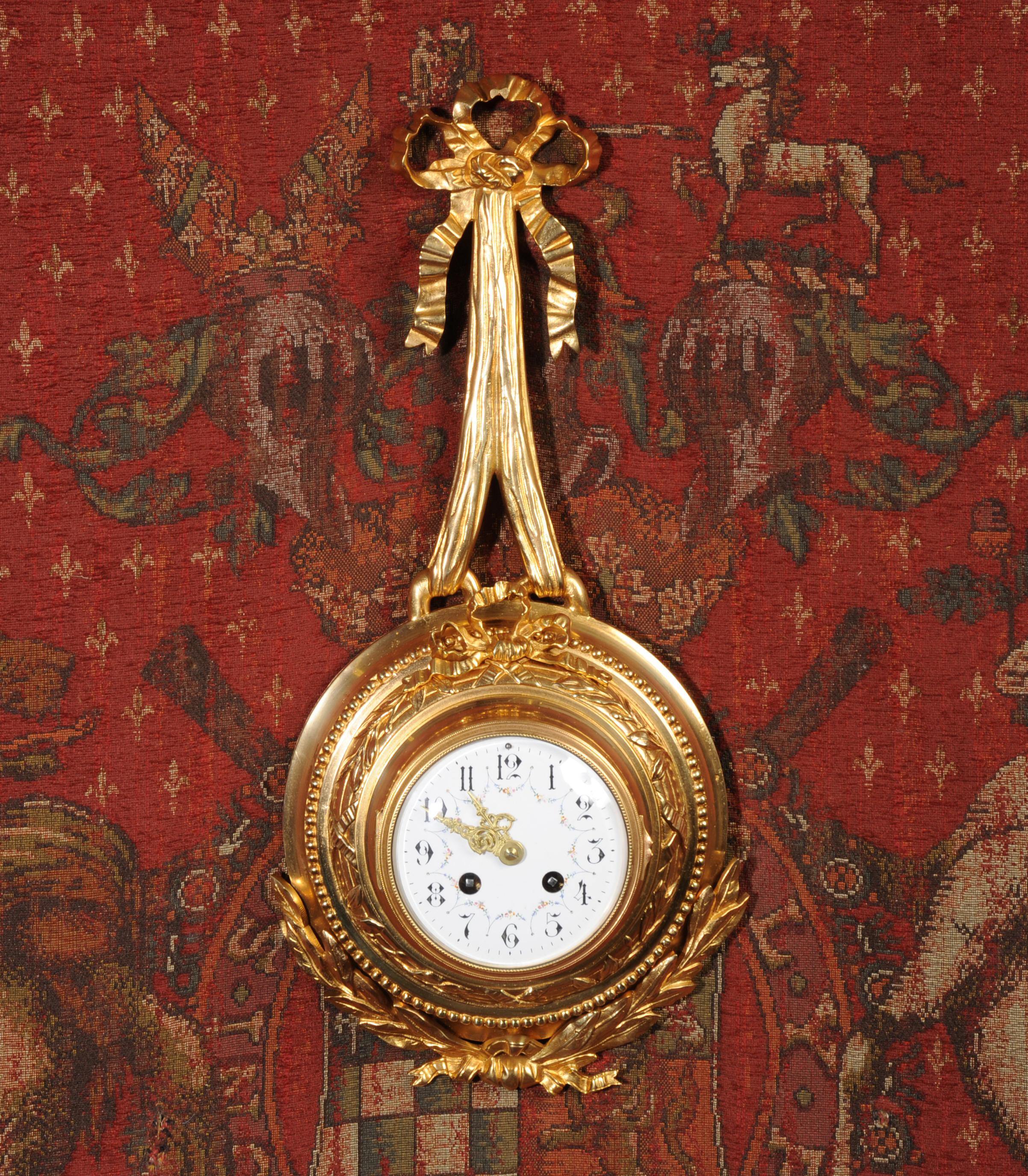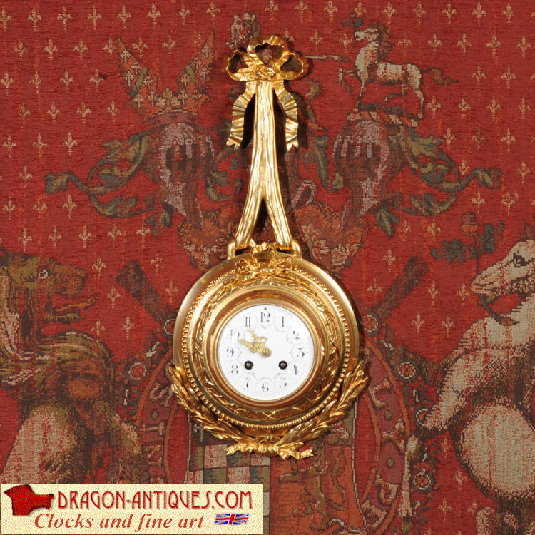 The stunning dial is enamel on copper, decorated with delicate floral swags between the numbers. The glass is convex and it is complete with it's original finely fretted gilt brass hands.