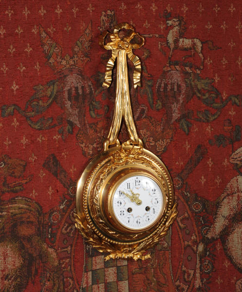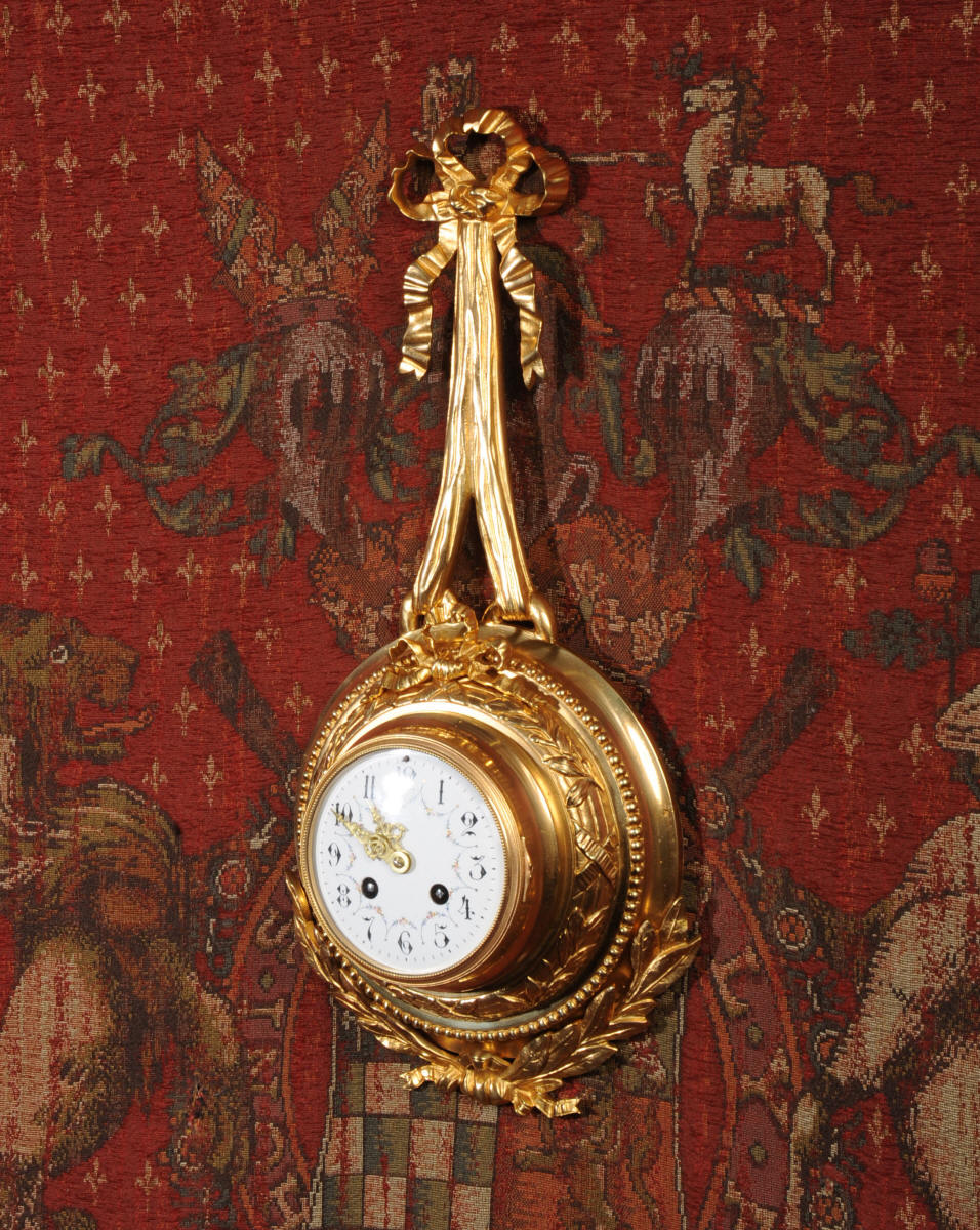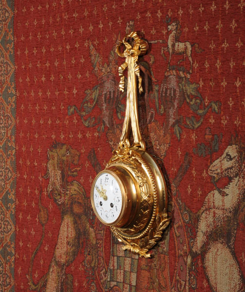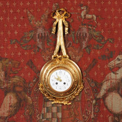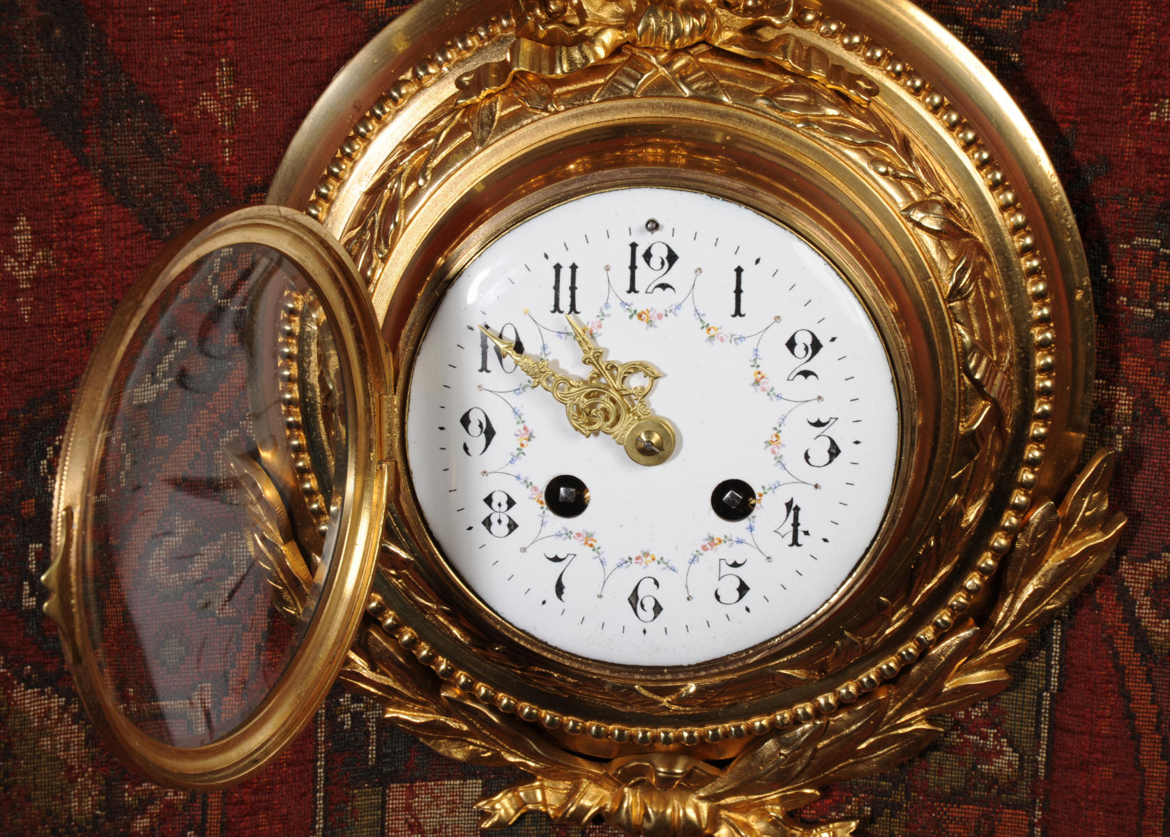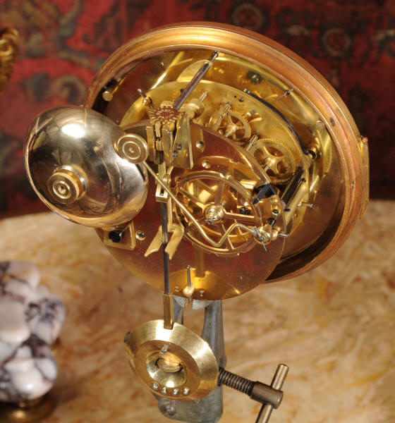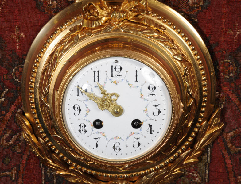 The French movement is of high quality and is in excellent clean and running condition having been fully overhauled by our clockmaker. Pendulum is original. It runs for 8 days and strikes the hours and halves on a bell. Click the video clip below to hear the bell and watch the clock running.