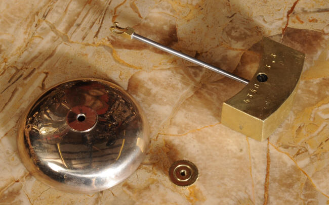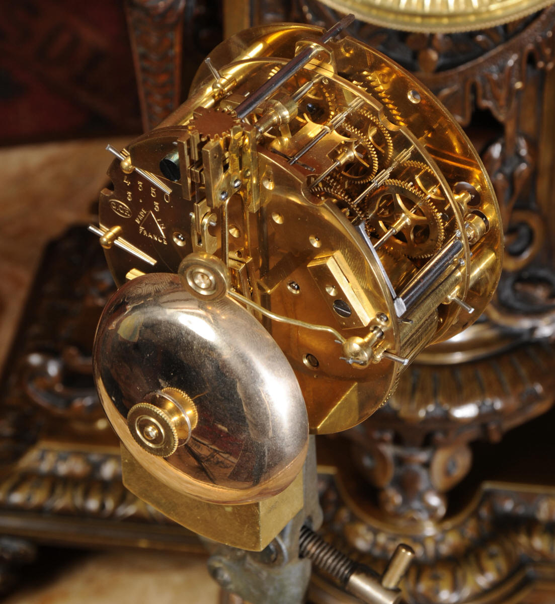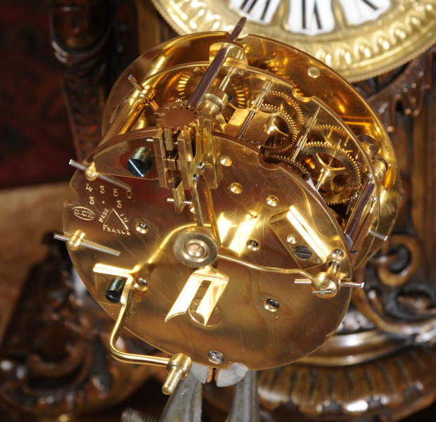 The French movement is of high quality and is by Vincenti et Cie. It in excellent clean and running condition having been fully overhauled by our clockmaker. The backplate has both the Charles Hour mark and the Vincenti mark. The special clump pendulum is original. It runs for 8 days and strikes the hours and halves on a bell. Click the video clip below to hear the bell and watch the clock running!