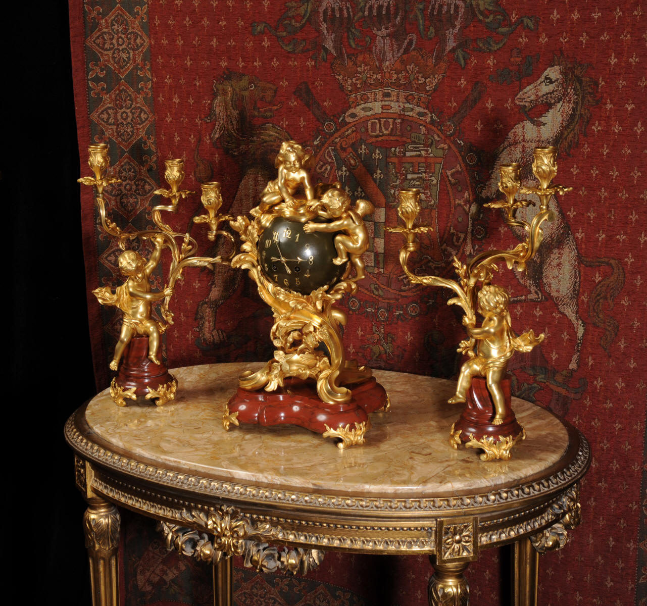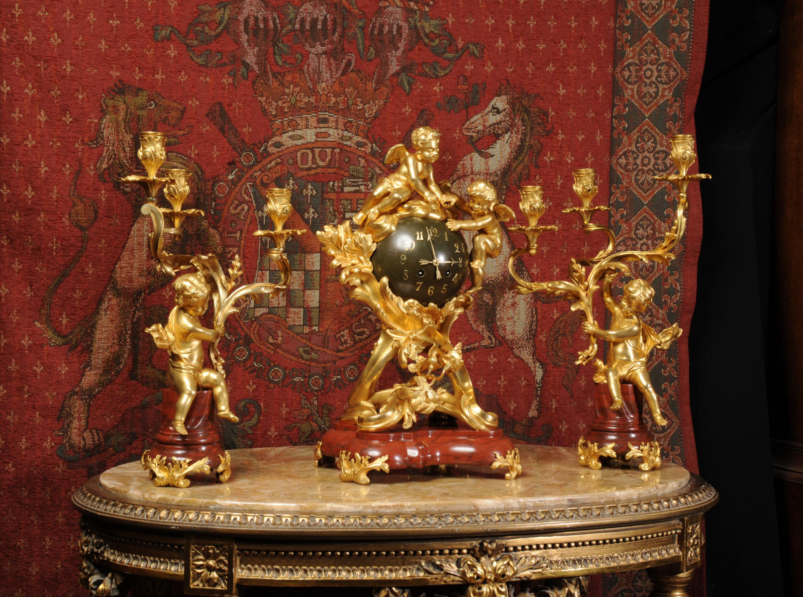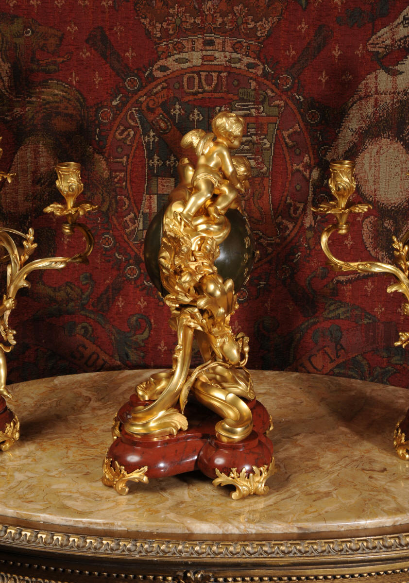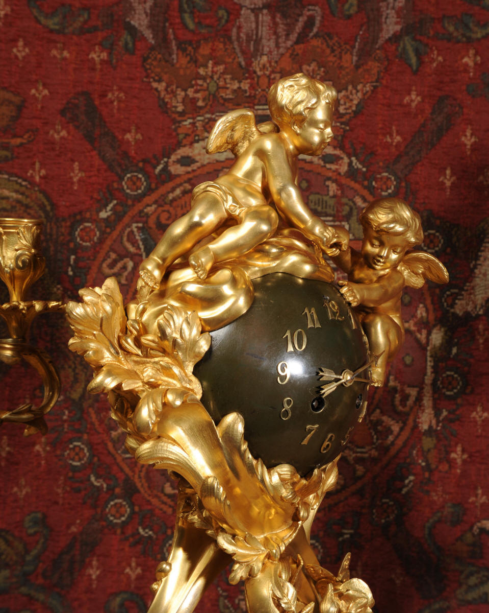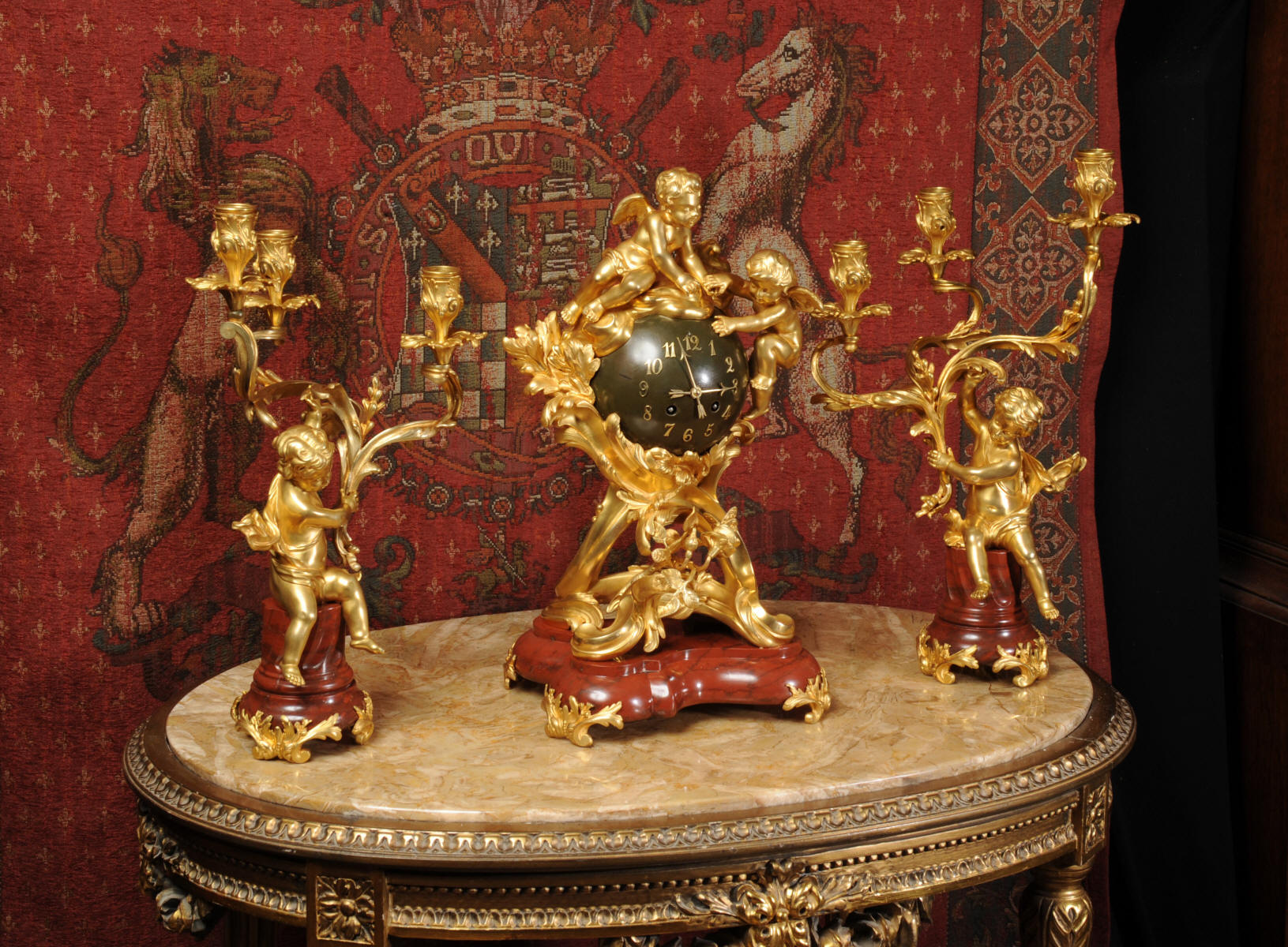 Condition of the case is excellent, the original gilding is beautifully clean and bright with hardly any wear or discolouration and there are no losses. The bronze sphere is also in excellent condition just some small marks and some wear around the winding holes. The marble is also excellent with a good polish. There may have been a repair to one of the candelabra bases at some point or it could be a natural fissure in the rock, it is not noticeable. The candelabra bases and metal work have been discretely drilled for electrical cables at some time. Candelabra are slightly distorted. The set makes a really stunning display as you can see below.