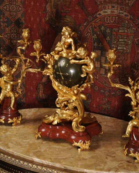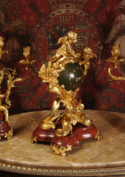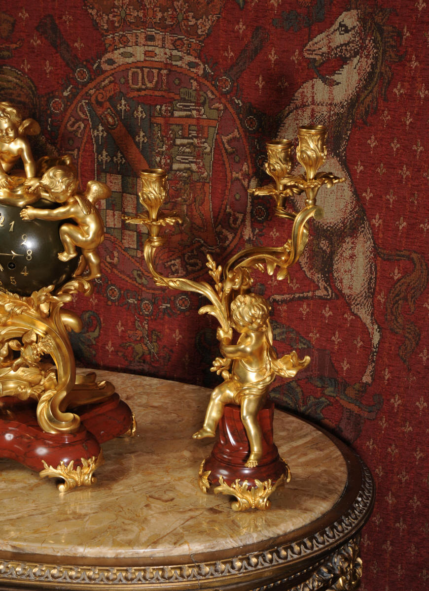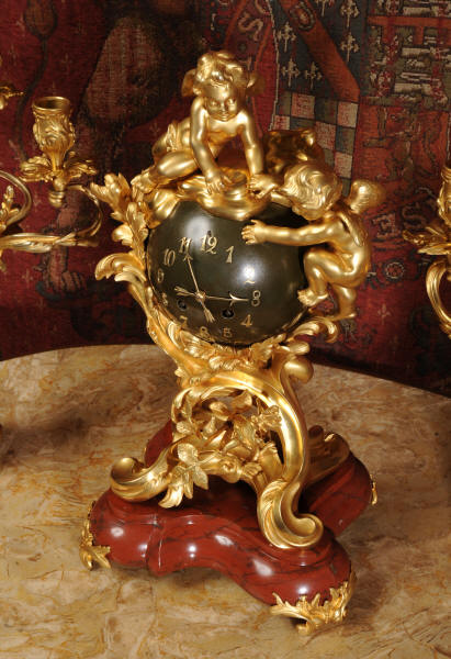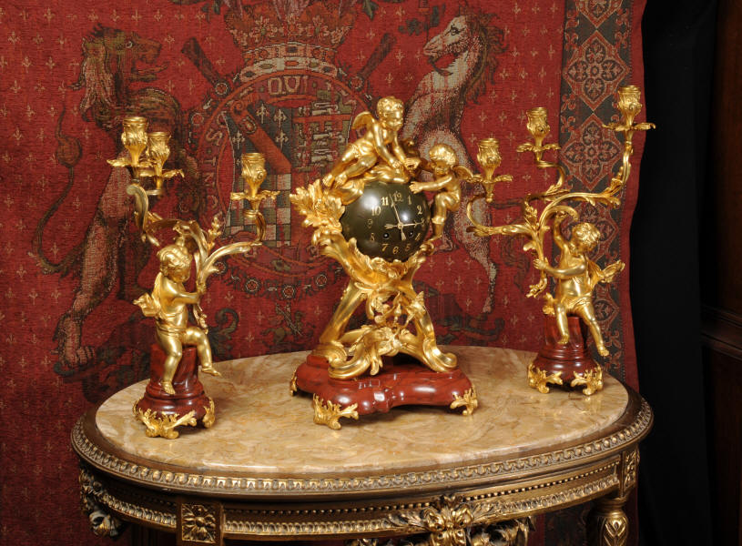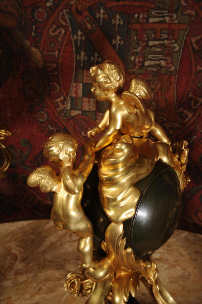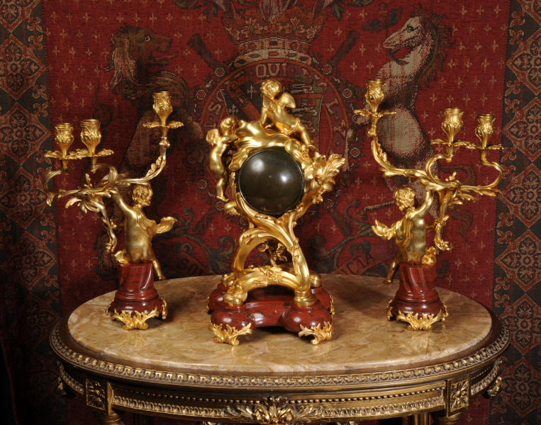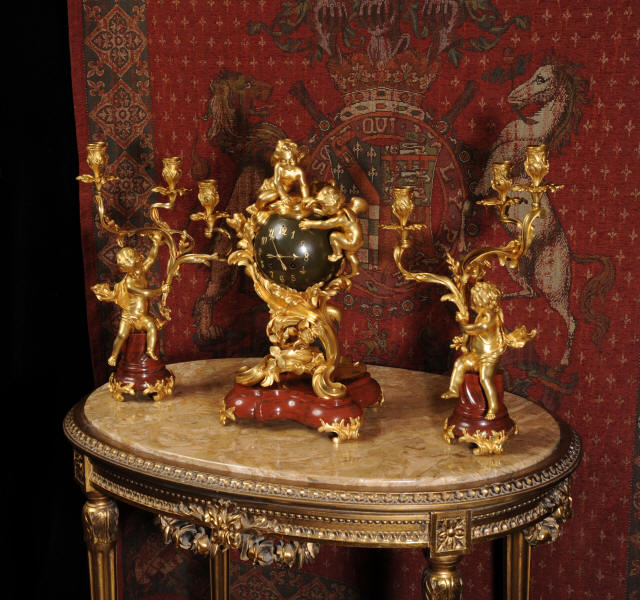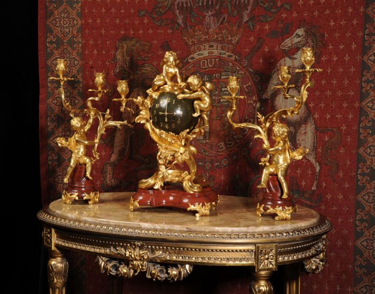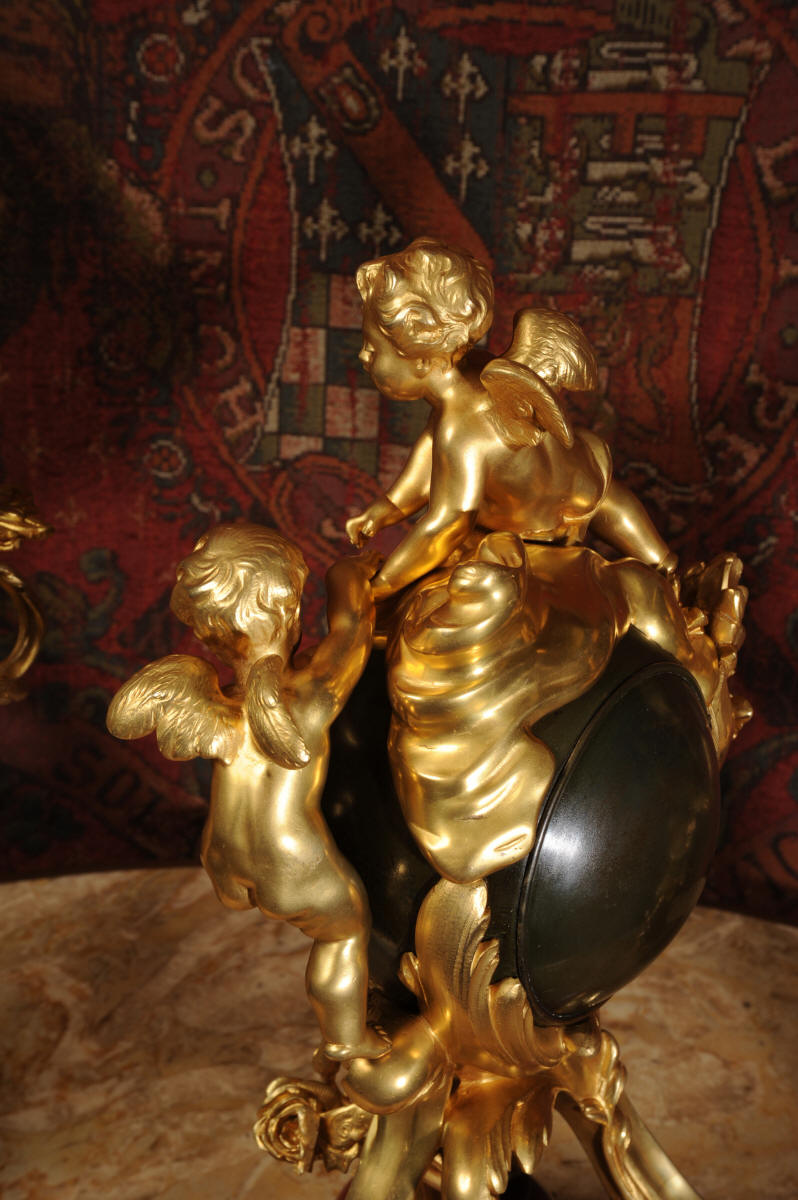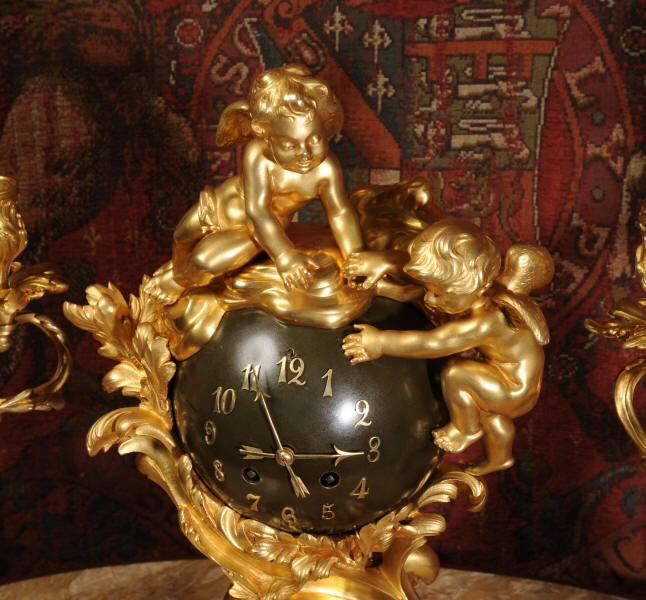 Condition of the case is excellent, the original gilding is beautifully clean and bright with hardly any wear or discolouration and there are no losses. The bronze sphere is also in excellent condition just some small marks and some wear around the winding holes. The marble is also excellent with a good polish. There may have been a repair to one of the candelabra bases at some point or it could be a natural fissure in the rock, it is not noticeable. The candelabra bases and metal work have been discretely drilled for electrical cables at some time. Candelabra are slightly distorted. The set makes a really stunning display as you can see below.