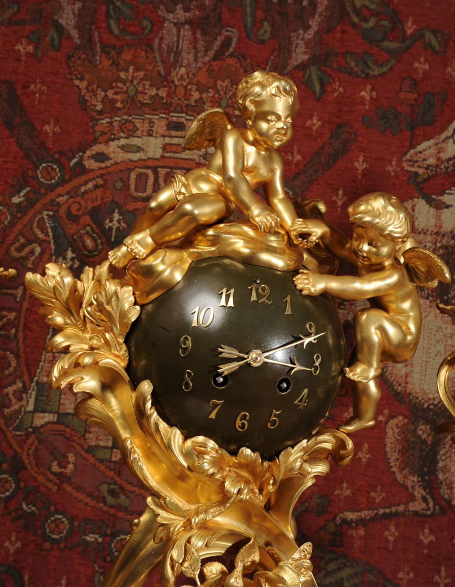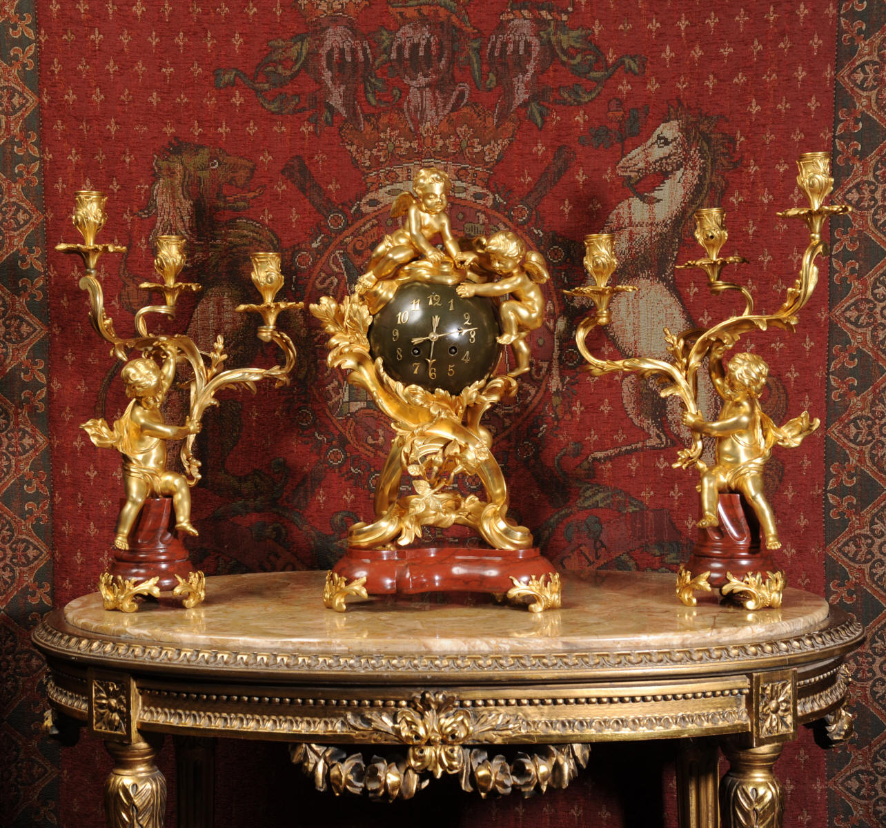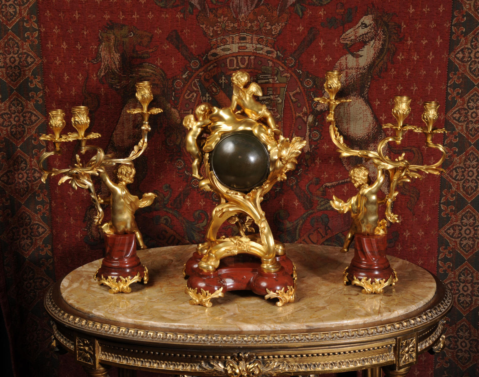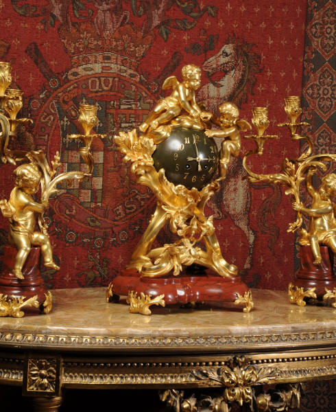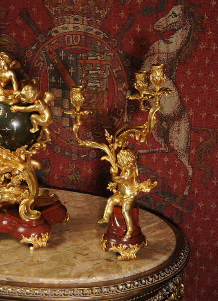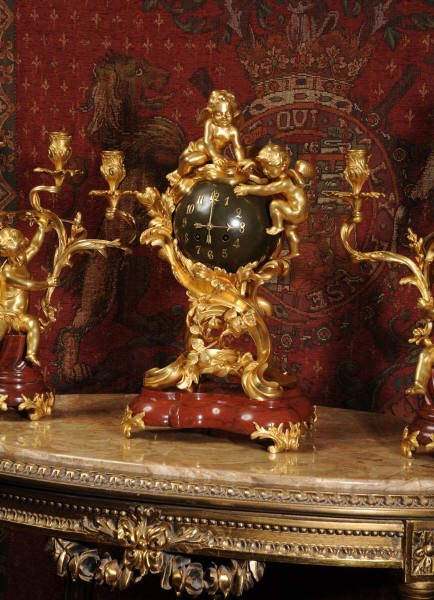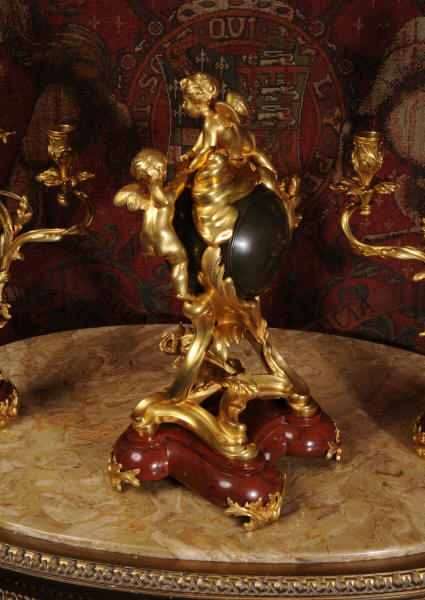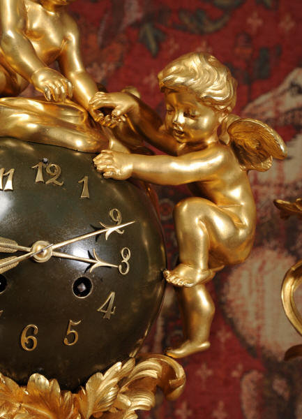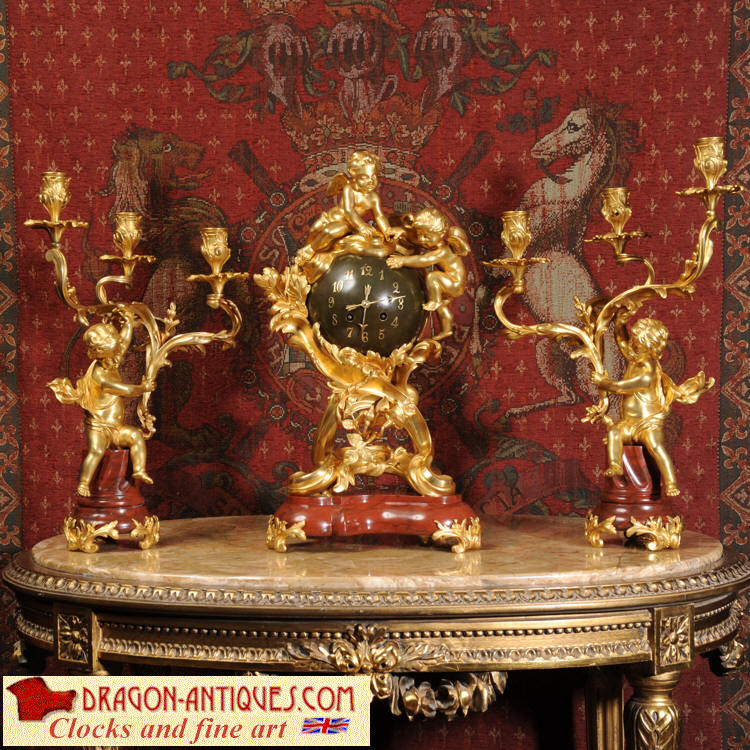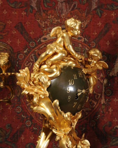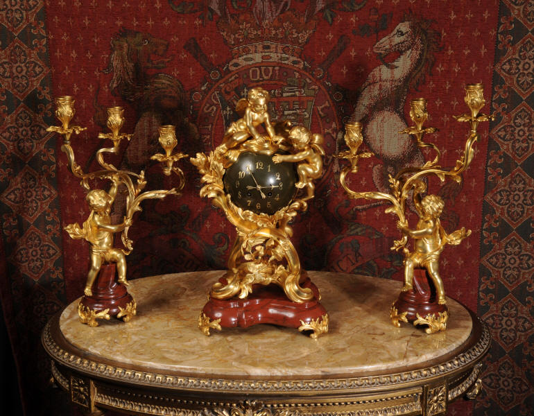 Condition of the case is excellent, the original gilding is beautifully clean and bright with hardly any wear or discolouration and there are no losses. The bronze sphere is also in excellent condition just some small marks and some wear around the winding holes. The marble is also excellent with a good polish. There may have been a repair to one of the candelabra bases at some point or it could be a natural fissure in the rock, it is not noticeable. The candelabra bases and metal work have been discretely drilled for electrical cables at some time. Candelabra are slightly distorted. The set makes a really stunning display as you can see below.