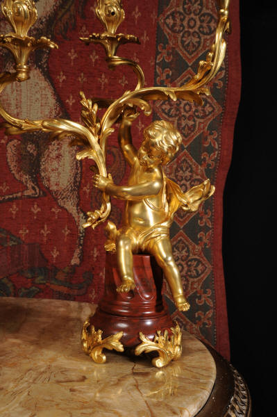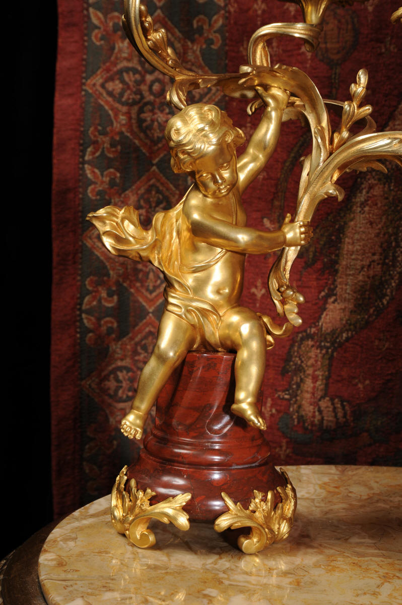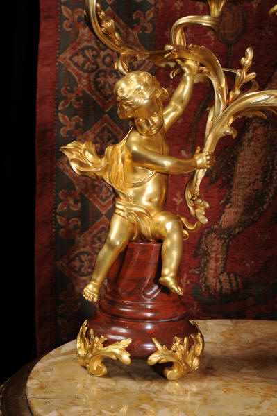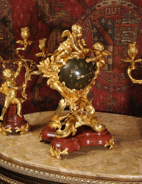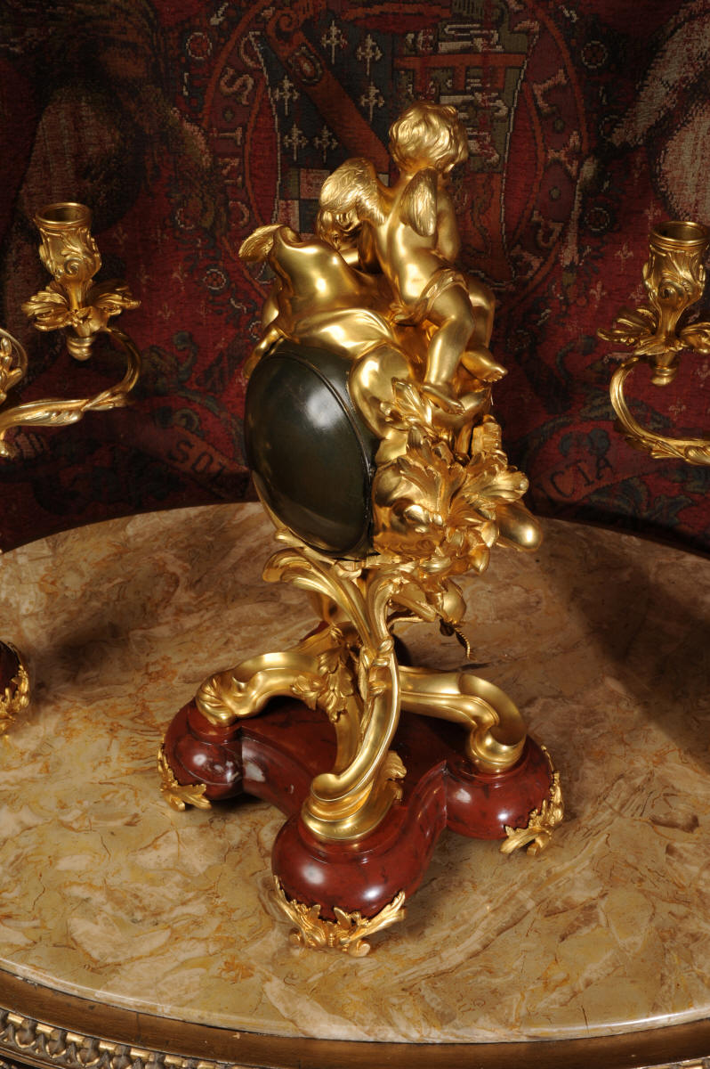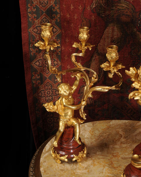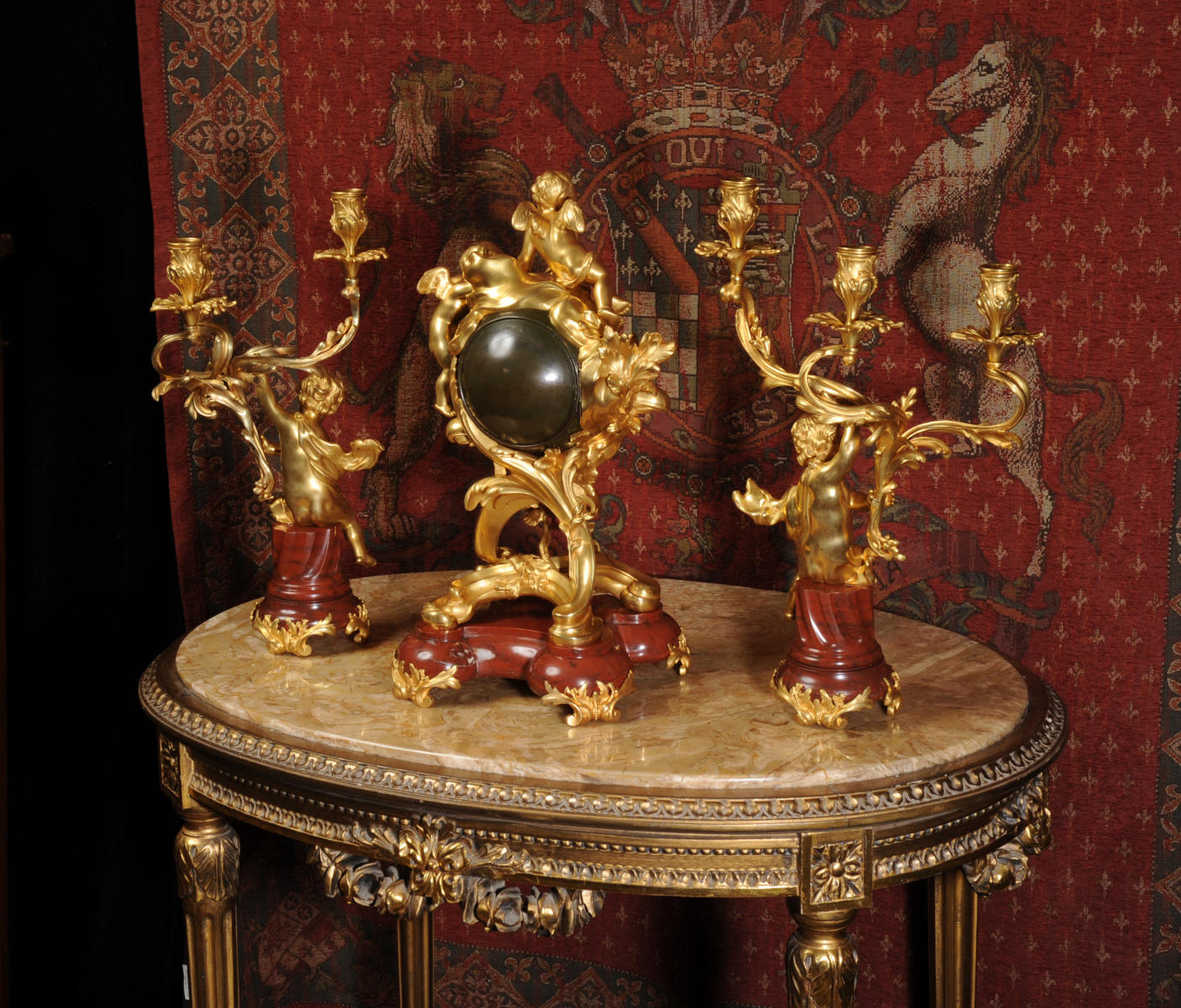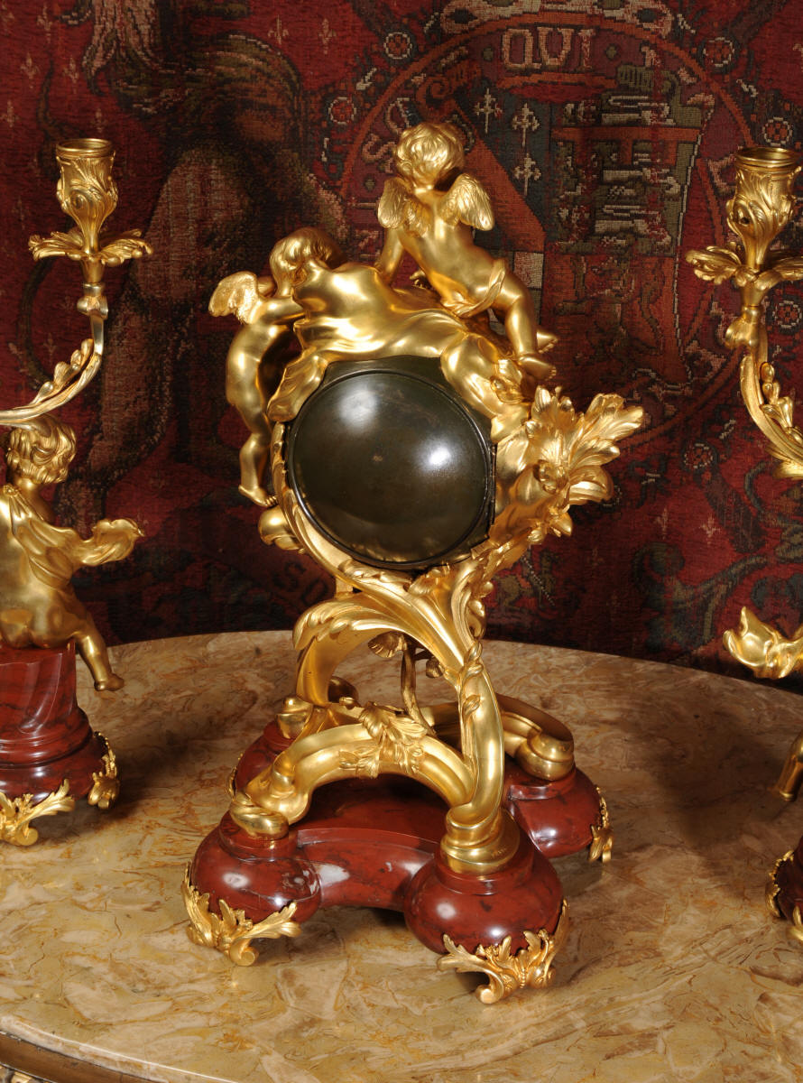 Condition of the case is excellent, the original gilding is beautifully clean and bright with hardly any wear or discolouration and there are no losses. The bronze sphere is also in excellent condition just some small marks and some wear around the winding holes. The marble is also excellent with a good polish. There may have been a repair to one of the candelabra bases at some point or it could be a natural fissure in the rock, it is not noticeable. The candelabra bases and metal work have been discretely drilled for electrical cables at some time. Candelabra are slightly distorted. The set makes a really stunning display as you can see below.
