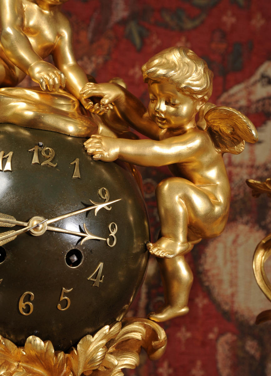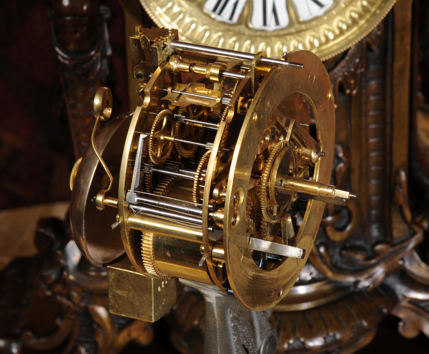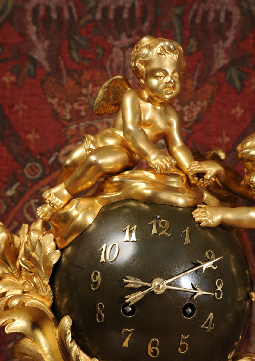 The dial is formed on the front face of the bronze sphere with individually gilt brass letters, it is complete with its original "cupid's arrows" hands also in gilt brass.