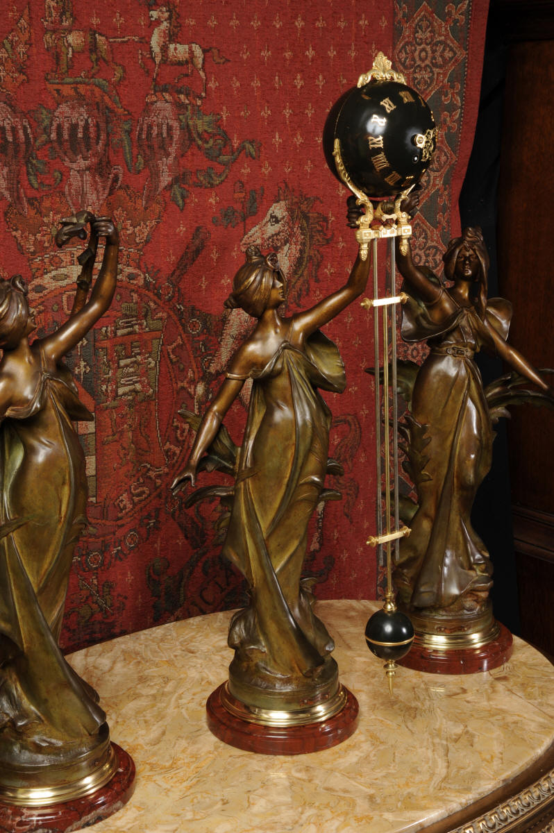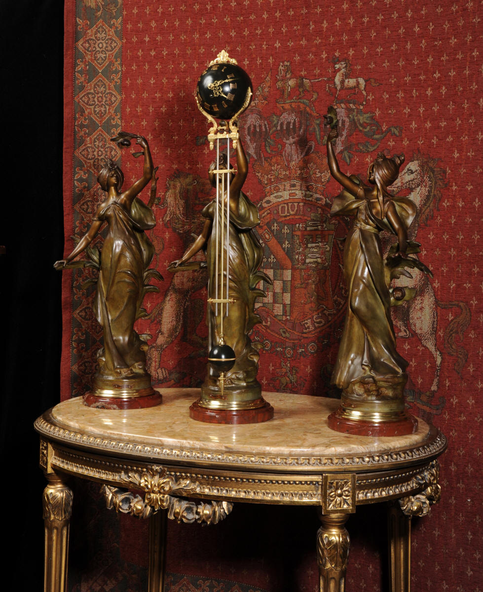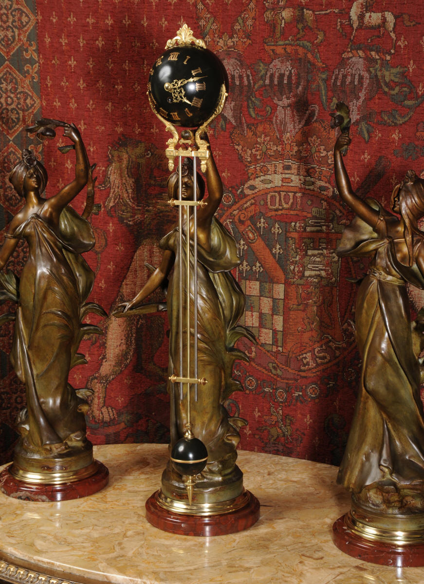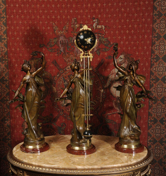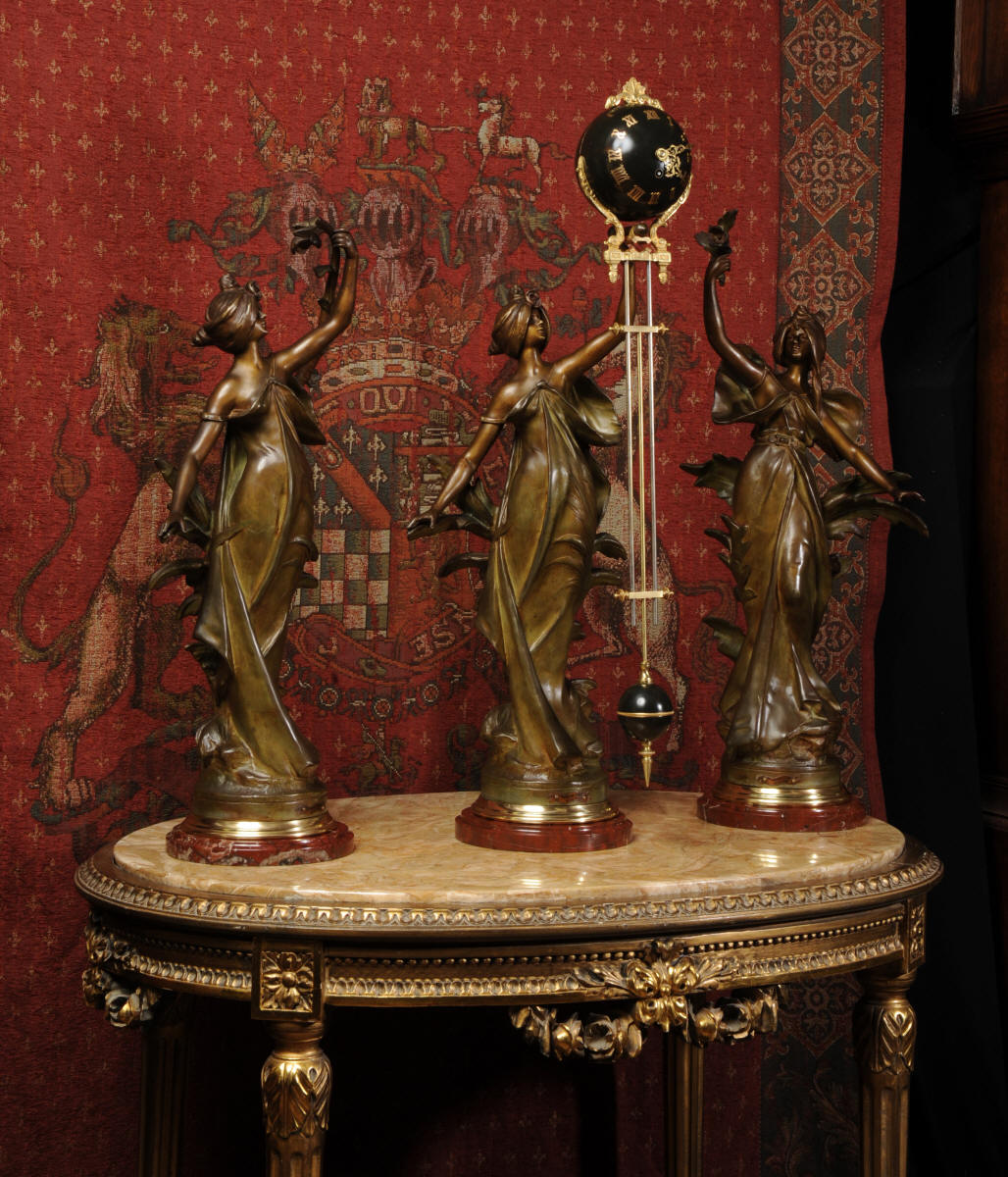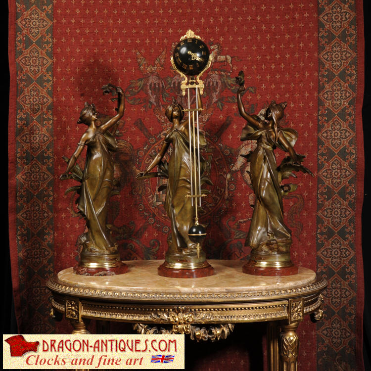 Condition is excellent, the patinated finish of the figures is in excellent original condition, just some occasional marks or discolouration and a couple of tiny areas of touching in, specifically on one arm and one hand. The bronzed finish of the pendulum is also very good, some marks and loss of finish to the upper sphere and the silver steel rods of the pendulum are very slightly pitted. Gilt brass is very good, clean and bright. The marble base of the clock has a very small chip. A stunning and rare set to add to your collection!