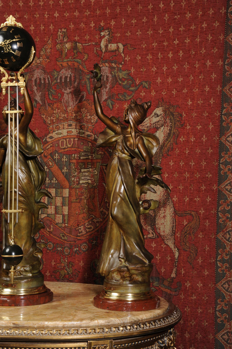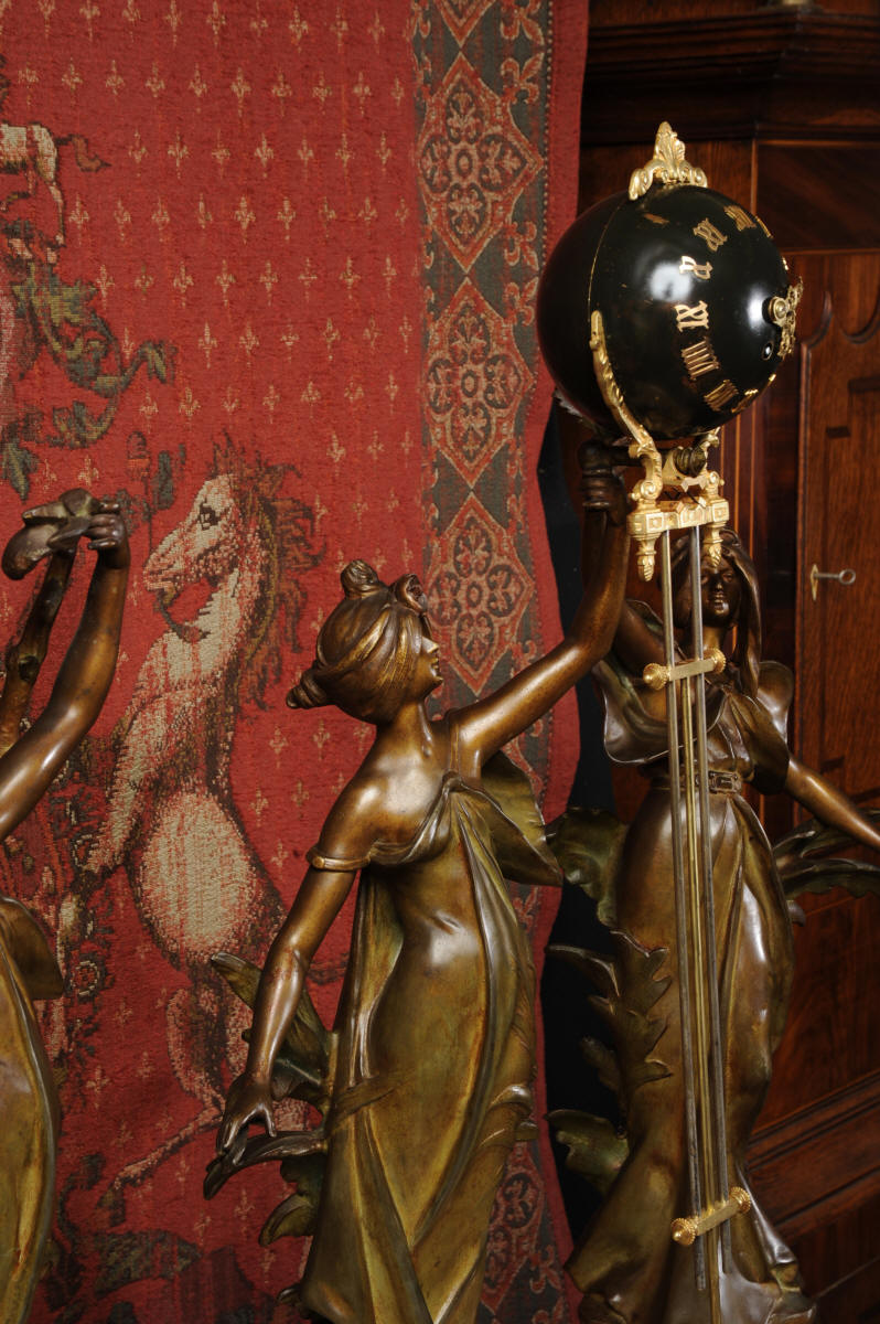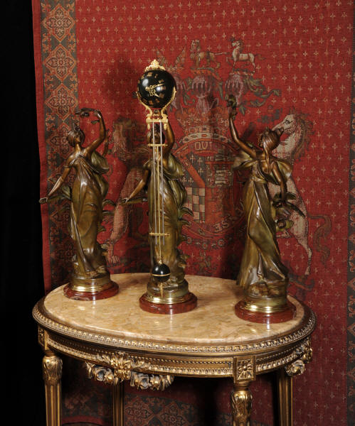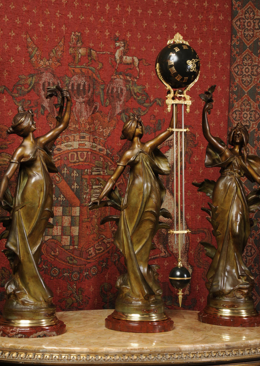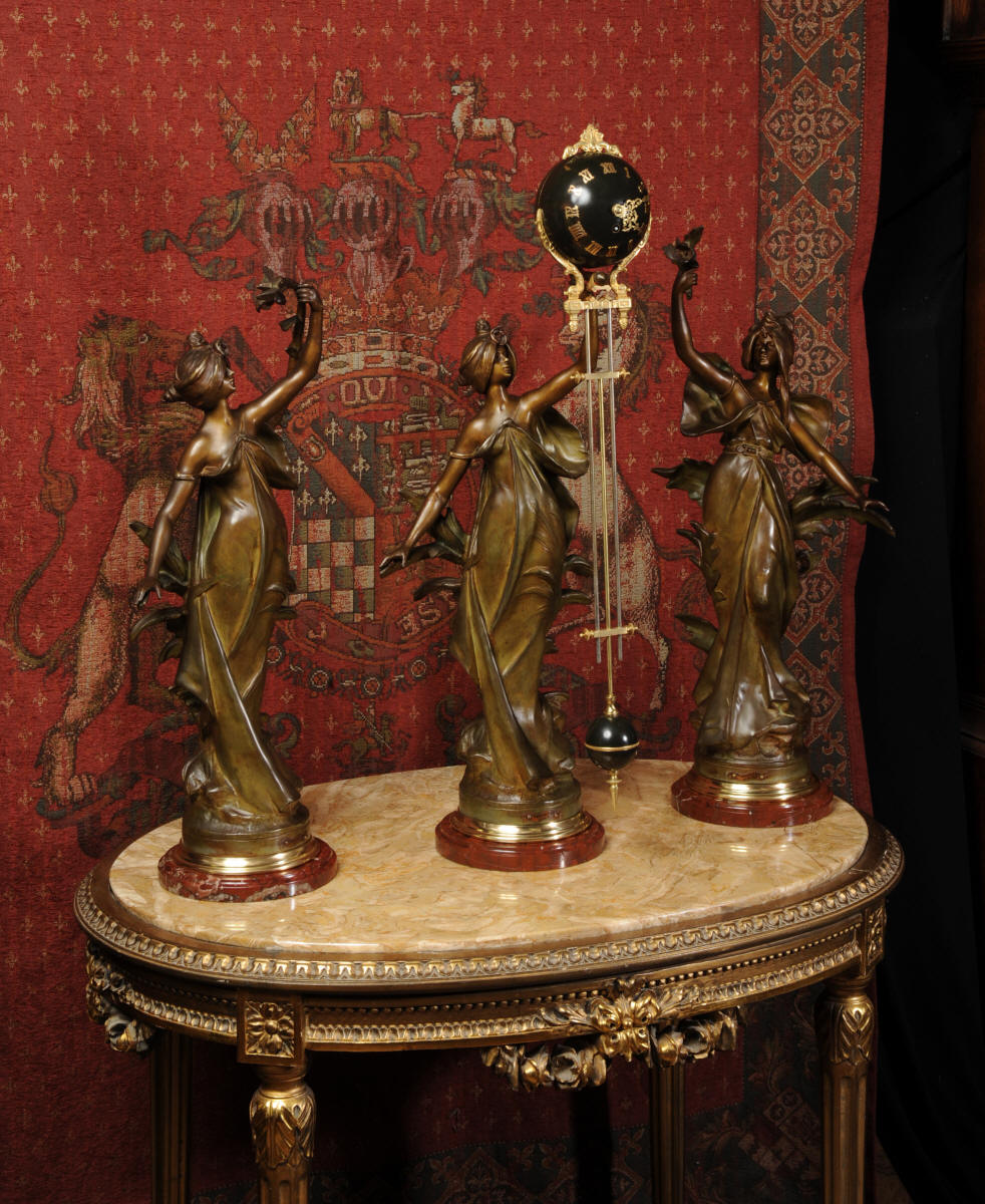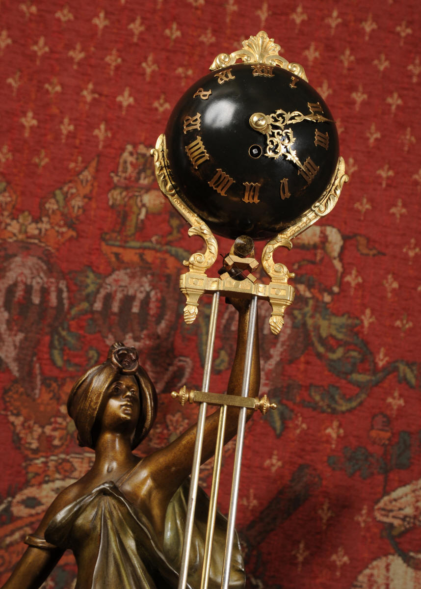 Condition is excellent, the patinated finish of the figures is in excellent original condition, just some occasional marks or discolouration and a couple of tiny areas of touching in, specifically on one arm and one hand. The bronzed finish of the pendulum is also very good, some marks and loss of finish to the upper sphere and the silver steel rods of the pendulum are very slightly pitted. Gilt brass is very good, clean and bright. The marble base of the clock has a very small chip. A stunning and rare set to add to your collection!