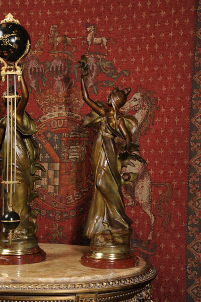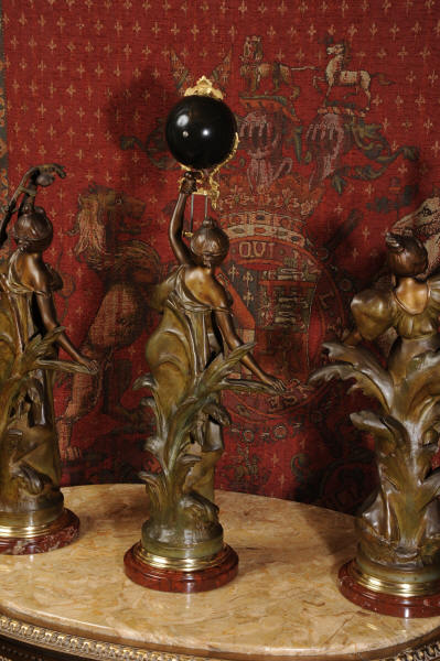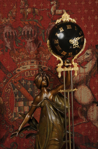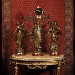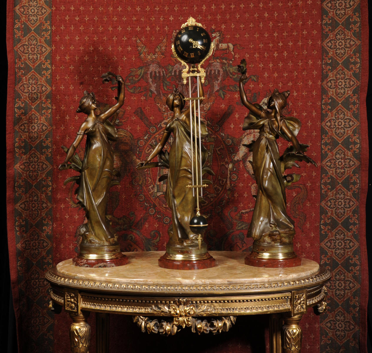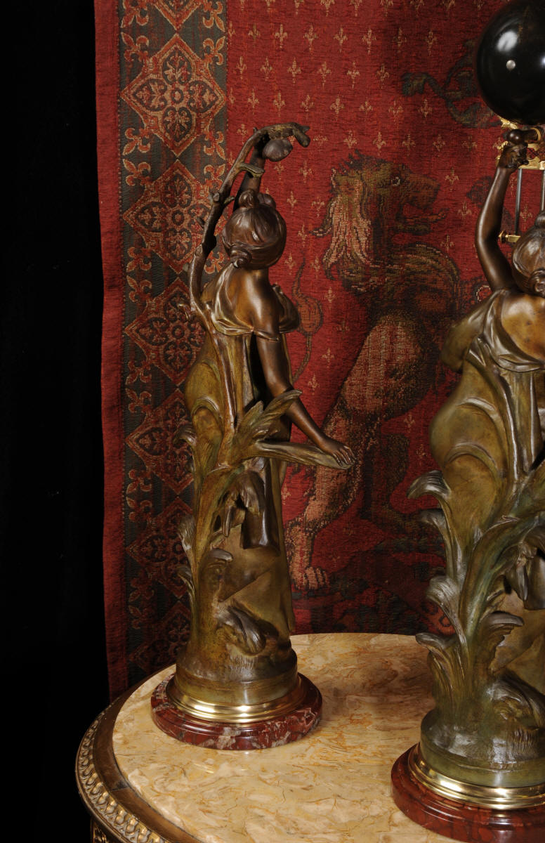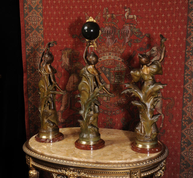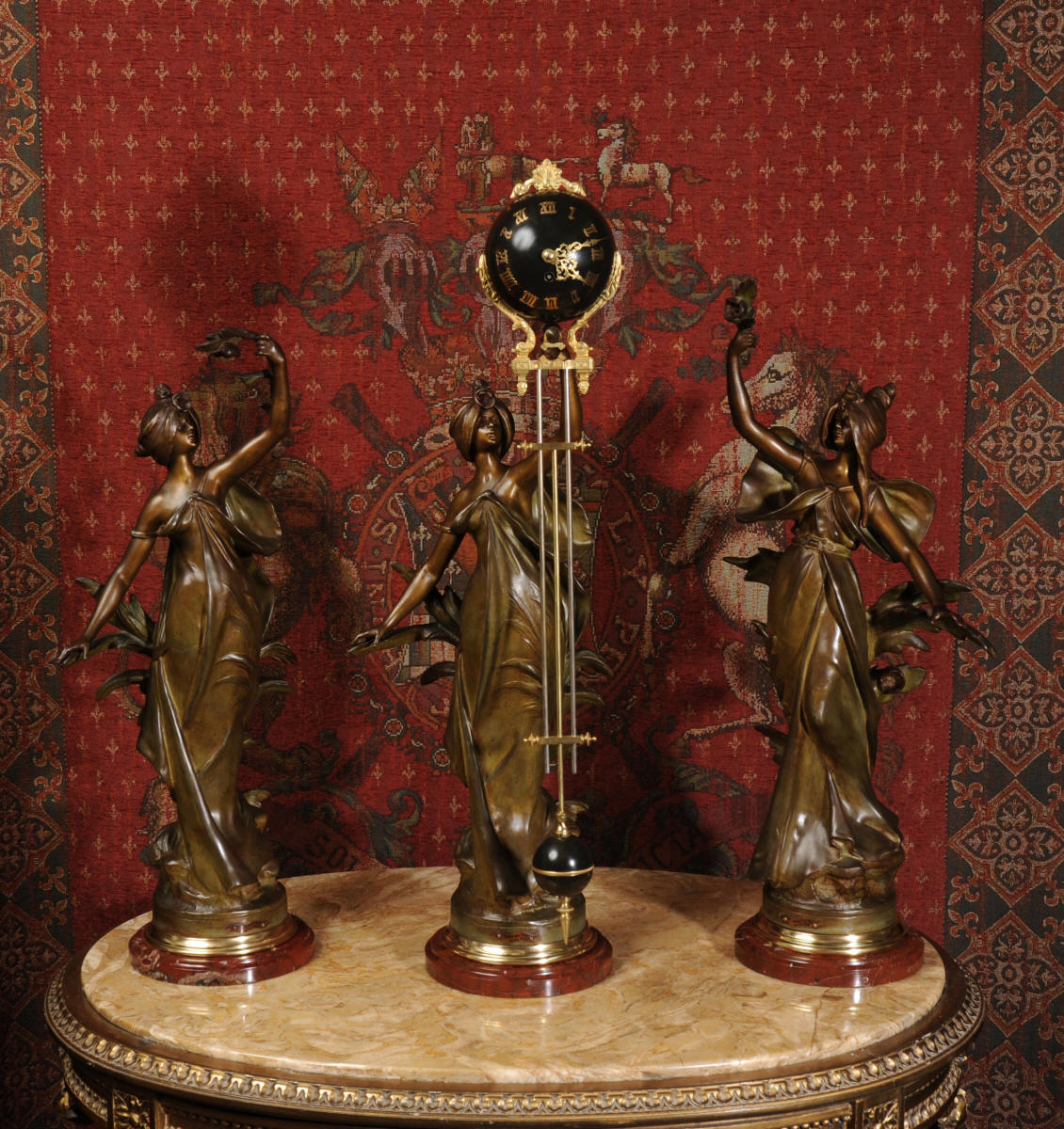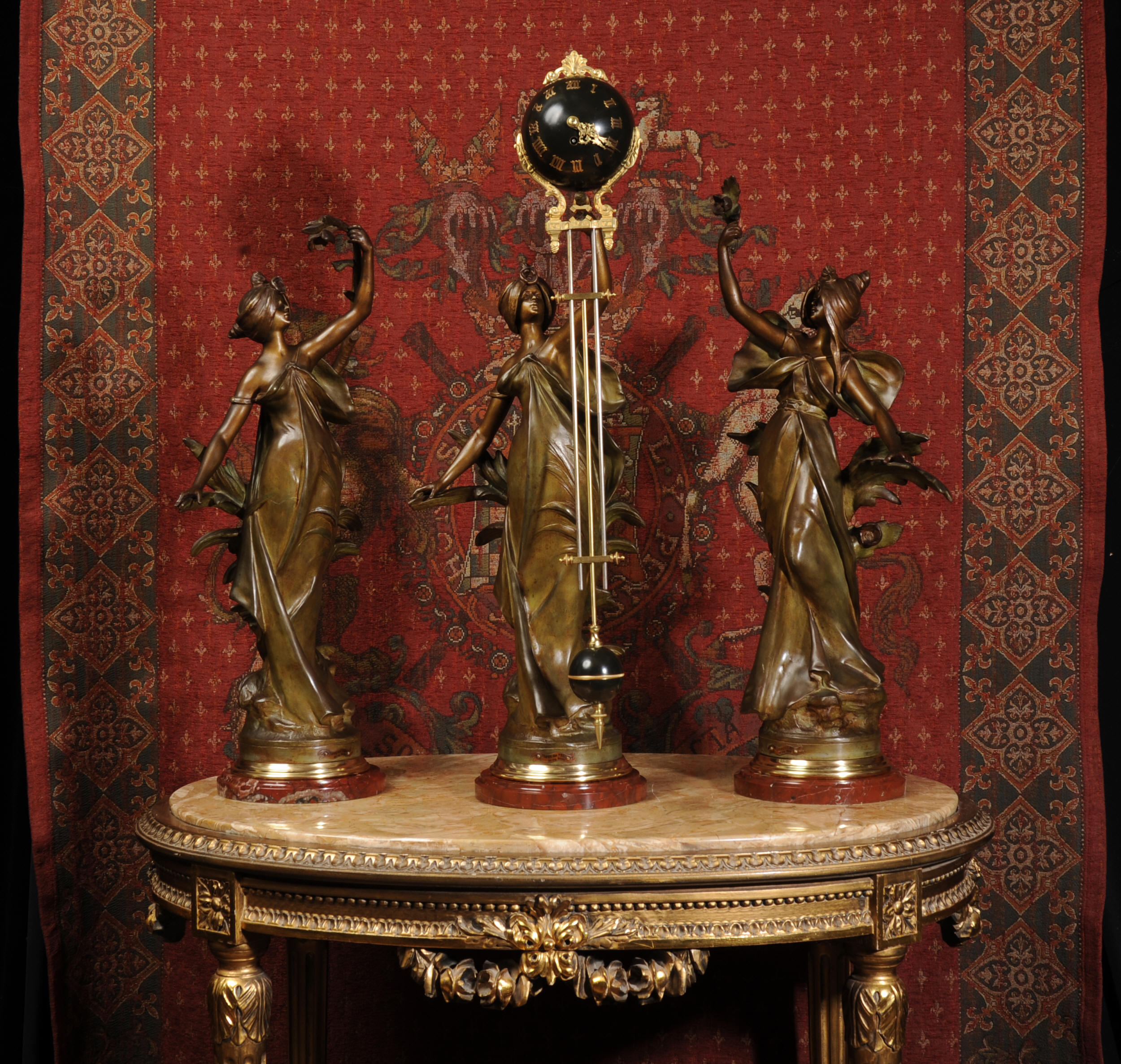 Condition is excellent, the patinated finish of the figures is in excellent original condition, just some occasional marks or discolouration and a couple of tiny areas of touching in, specifically on one arm and one hand. The bronzed finish of the pendulum is also very good, some marks and loss of finish to the upper sphere and the silver steel rods of the pendulum are very slightly pitted. Gilt brass is very good, clean and bright. The marble base of the clock has a very small chip. A stunning and rare set to add to your collection!