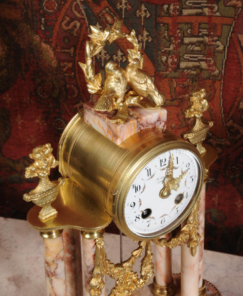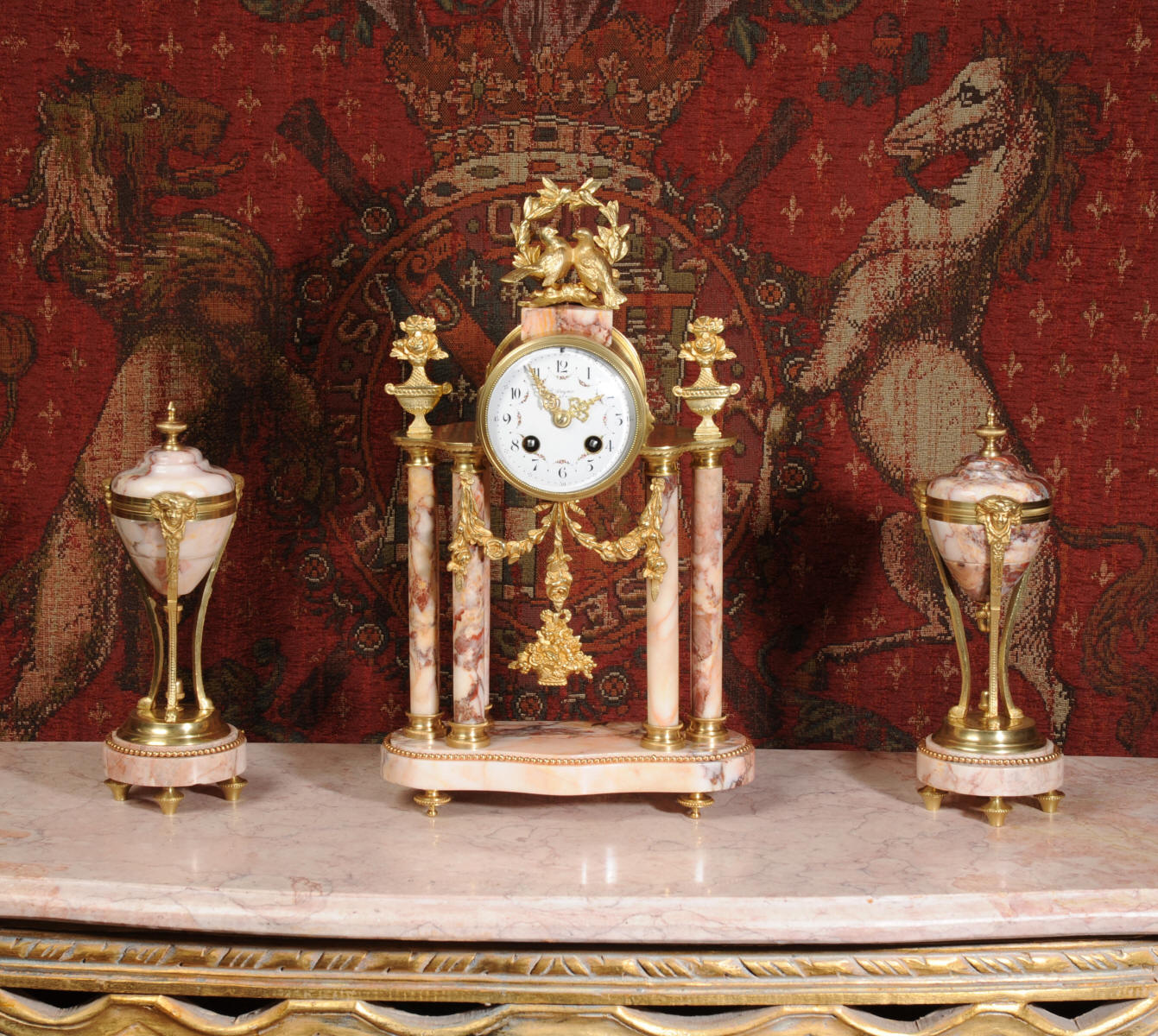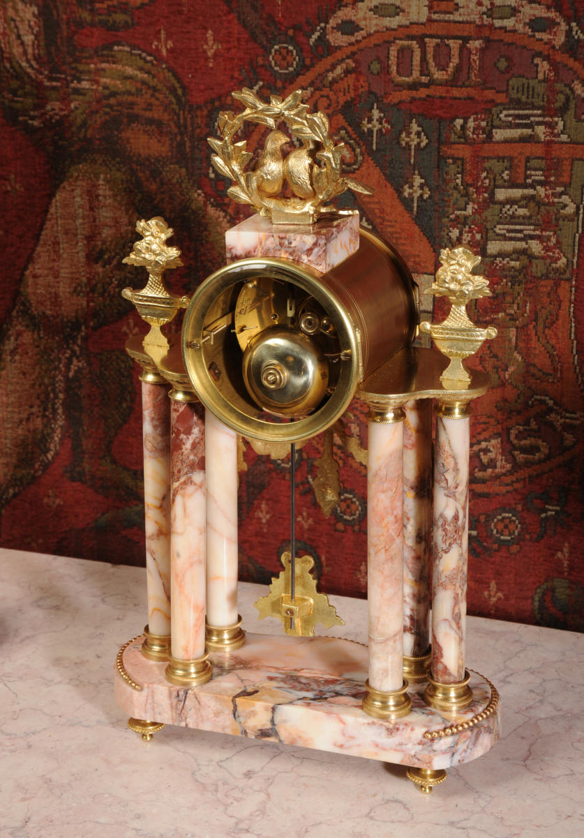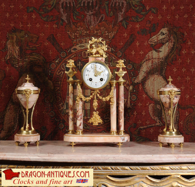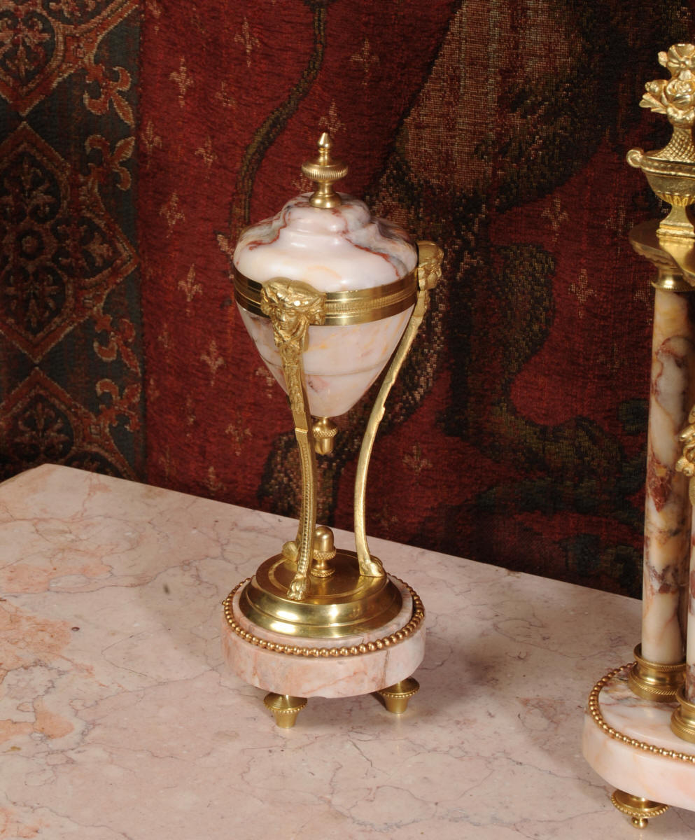 Condition of the case is excellent, the original gilding is beautifully clean and bright with hardly any wear or discolouration and there are no losses. The marble has a lovely clean and polished finish with just the usual nibbles to the edges and one or two chips here and there. One urn cover has a filled crack along a natural fault in the marble. The dial is also in excellent condition just a small chip next to the Brocot shaft above the 12 O'clock. The set makes a stunning display as you can see below.
