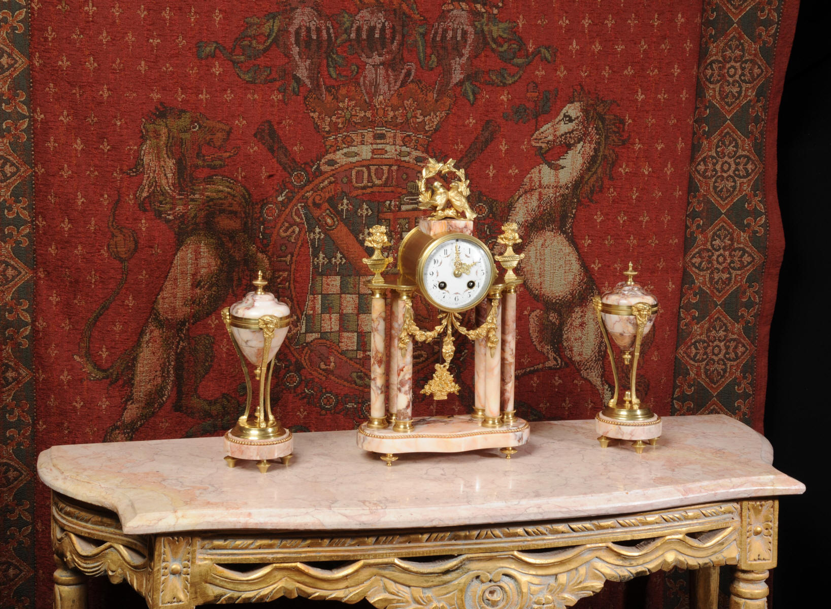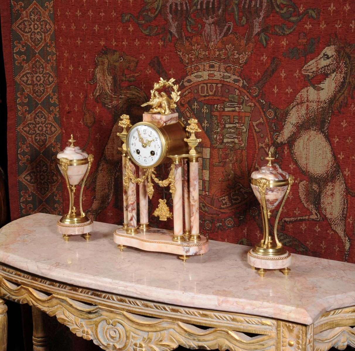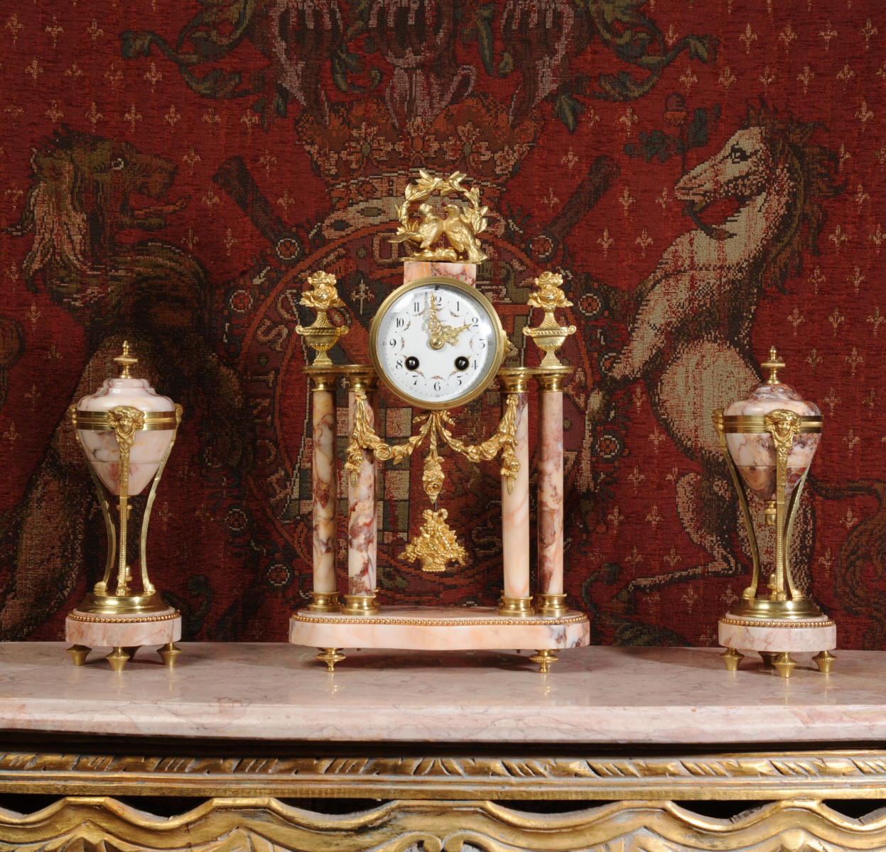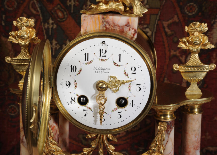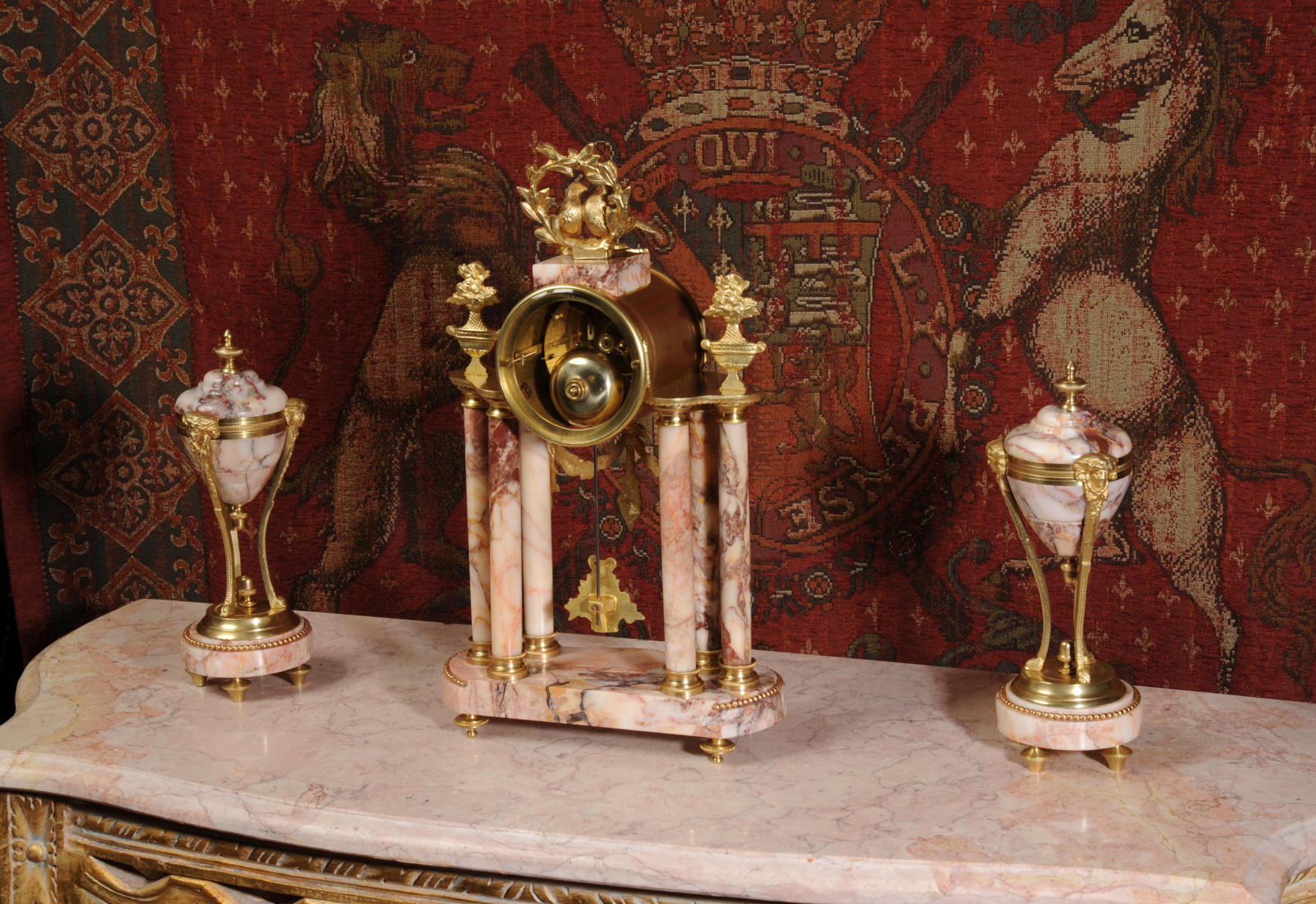 Condition of the case is excellent, the original gilding is beautifully clean and bright with hardly any wear or discolouration and there are no losses. The marble has a lovely clean and polished finish with just the usual nibbles to the edges and one or two chips here and there. One urn cover has a filled crack along a natural fault in the marble. The dial is also in excellent condition just a small chip next to the Brocot shaft above the 12 O'clock. The set makes a stunning display as you can see below.