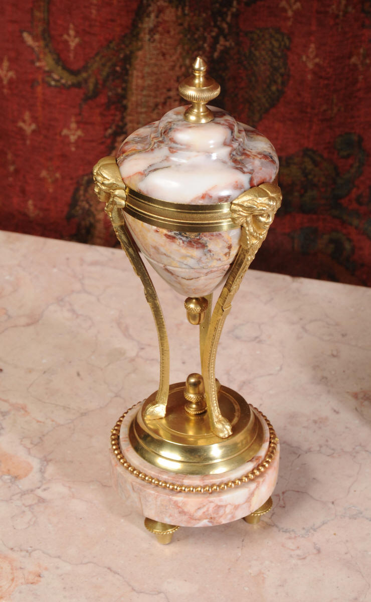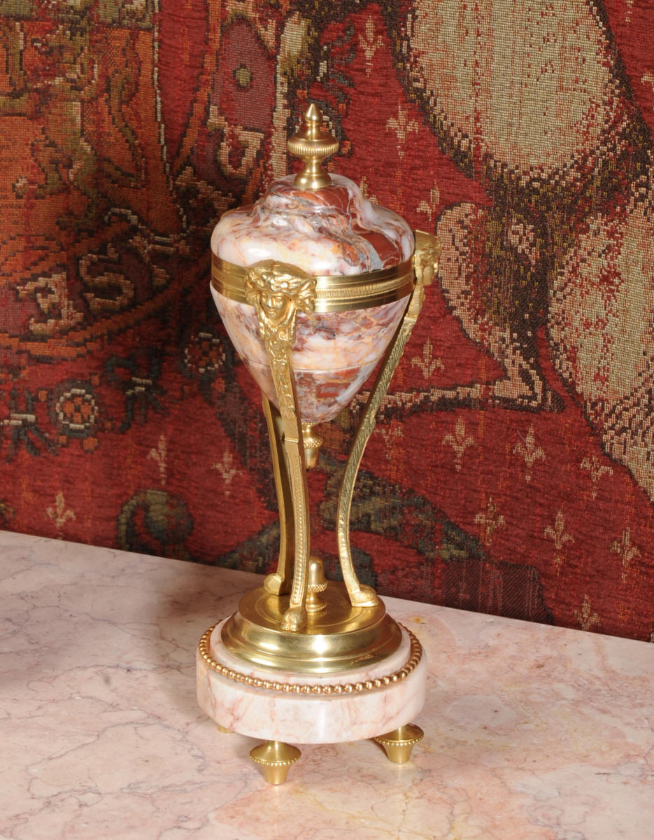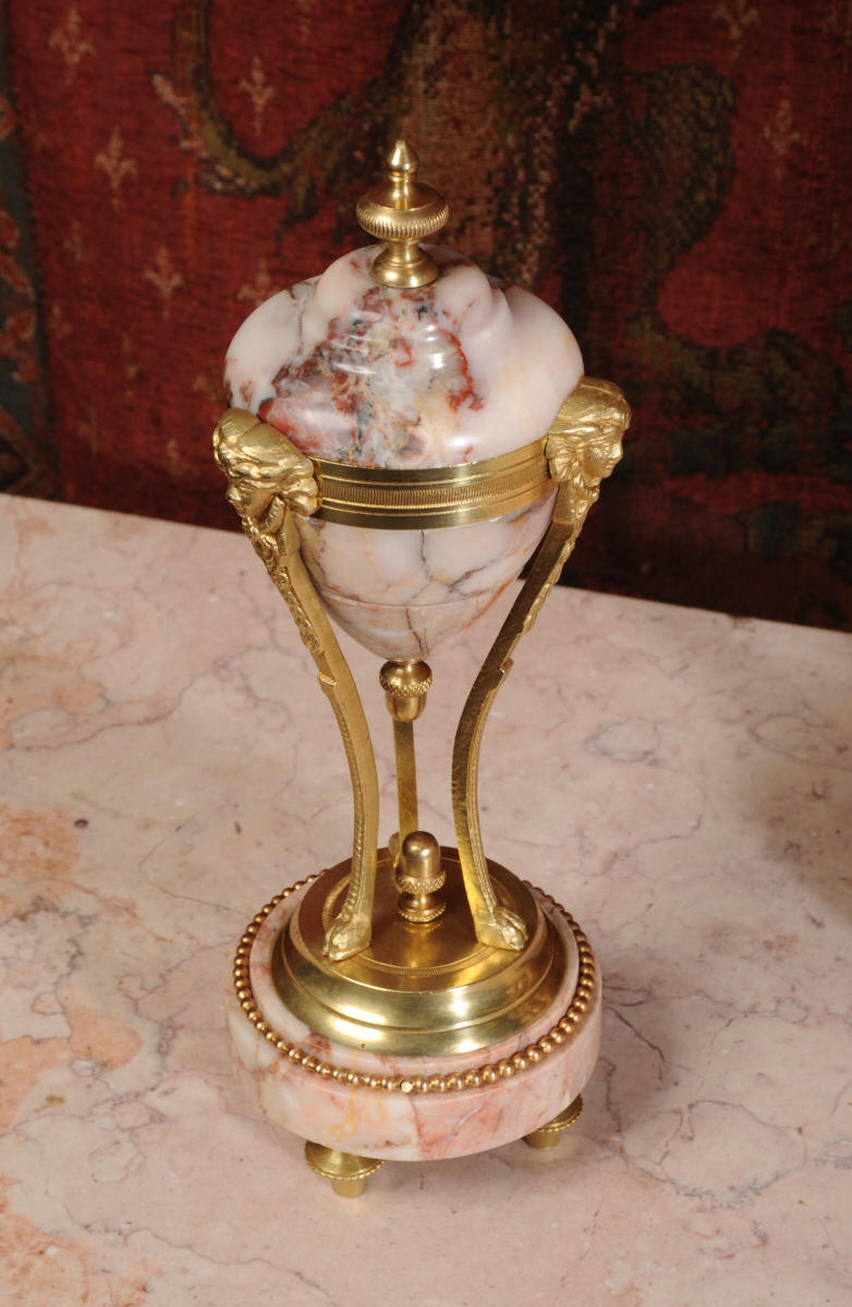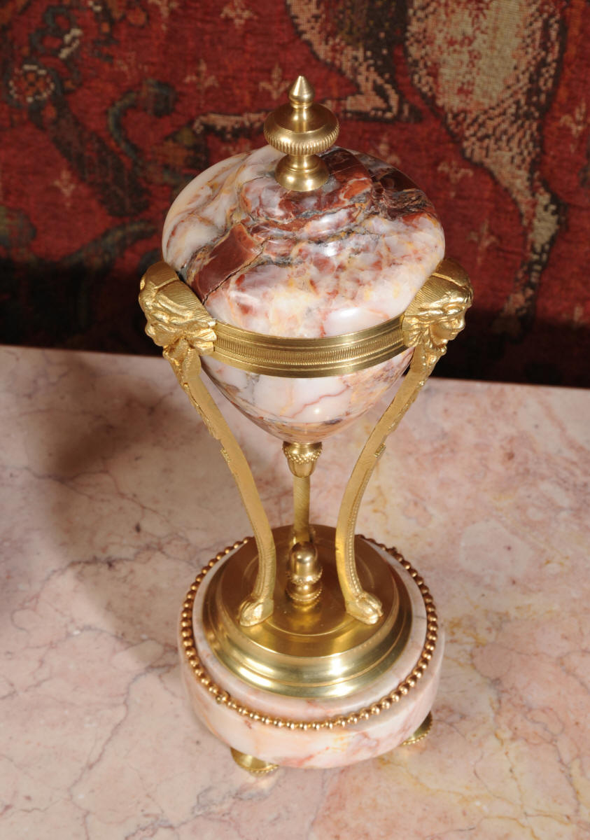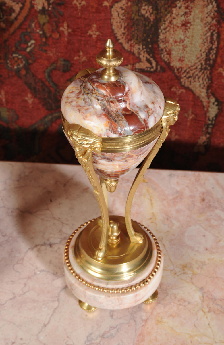 Condition of the case is excellent, the original gilding is beautifully clean and bright with hardly any wear or discolouration and there are no losses. The marble has a lovely clean and polished finish with just the usual nibbles to the edges and one or two chips here and there. One urn cover has a filled crack along a natural fault in the marble. The dial is also in excellent condition just a small chip next to the Brocot shaft above the 12 O'clock. The set makes a stunning display as you can see below.