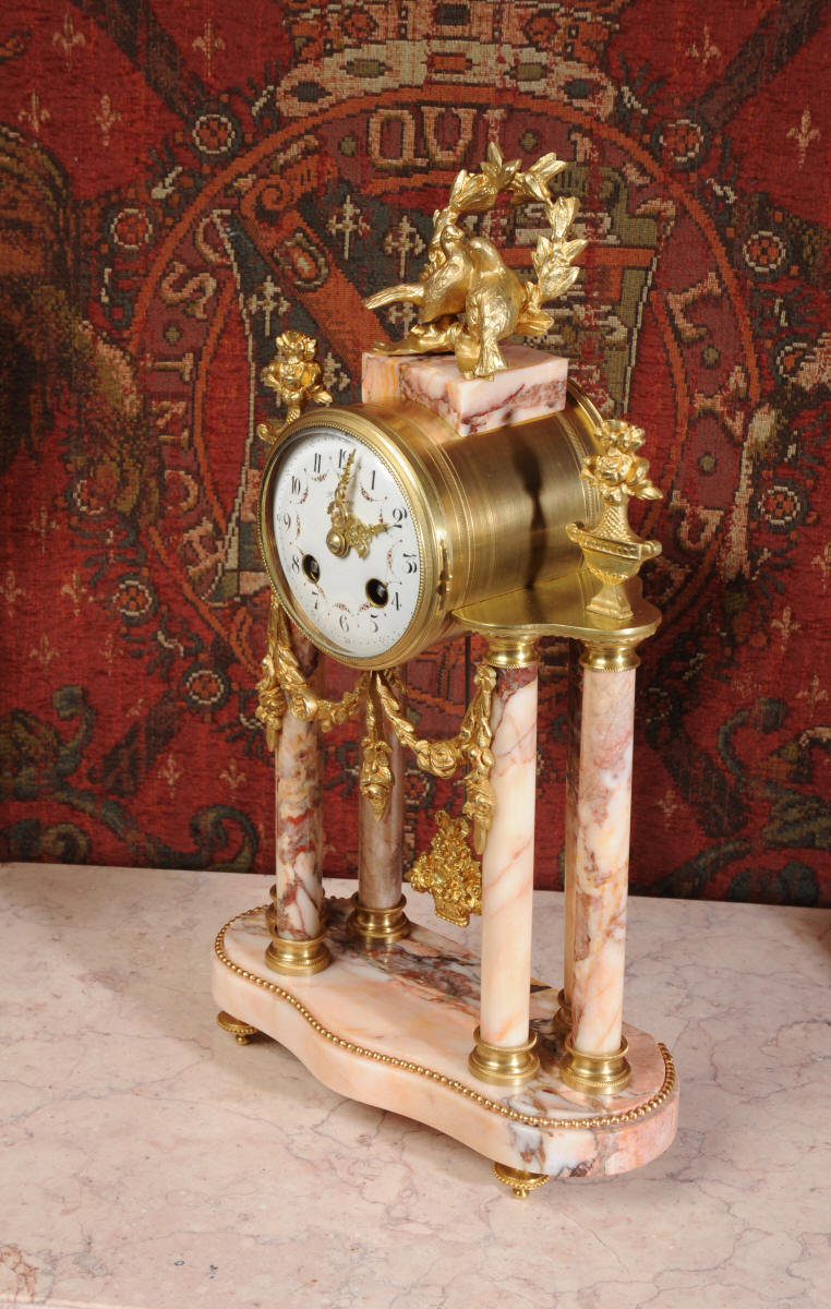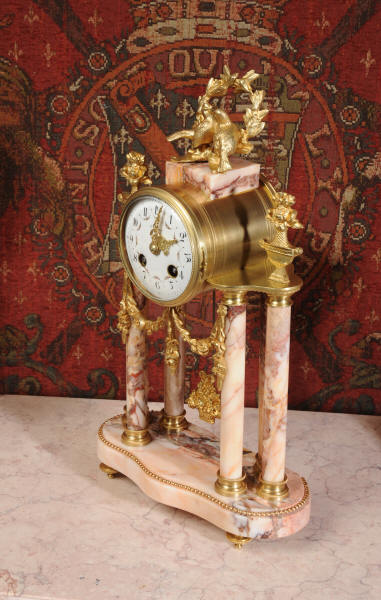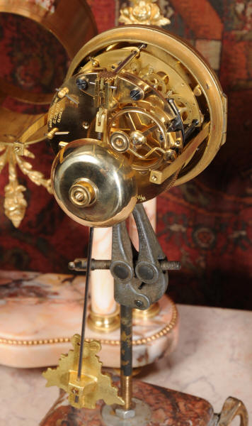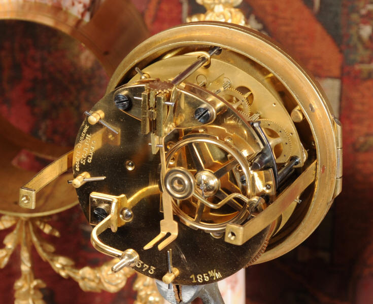 The French movement is by Société Clusienne of Cluses near the Swiss border. It is of the highest quality and is in excellent clean and running condition having been fully serviced by our clockmaker. It is complete with its original ormolu pendulum, runs for 8 days and strikes the hours and halves on a bell. Click the movie below to watch this clock running!