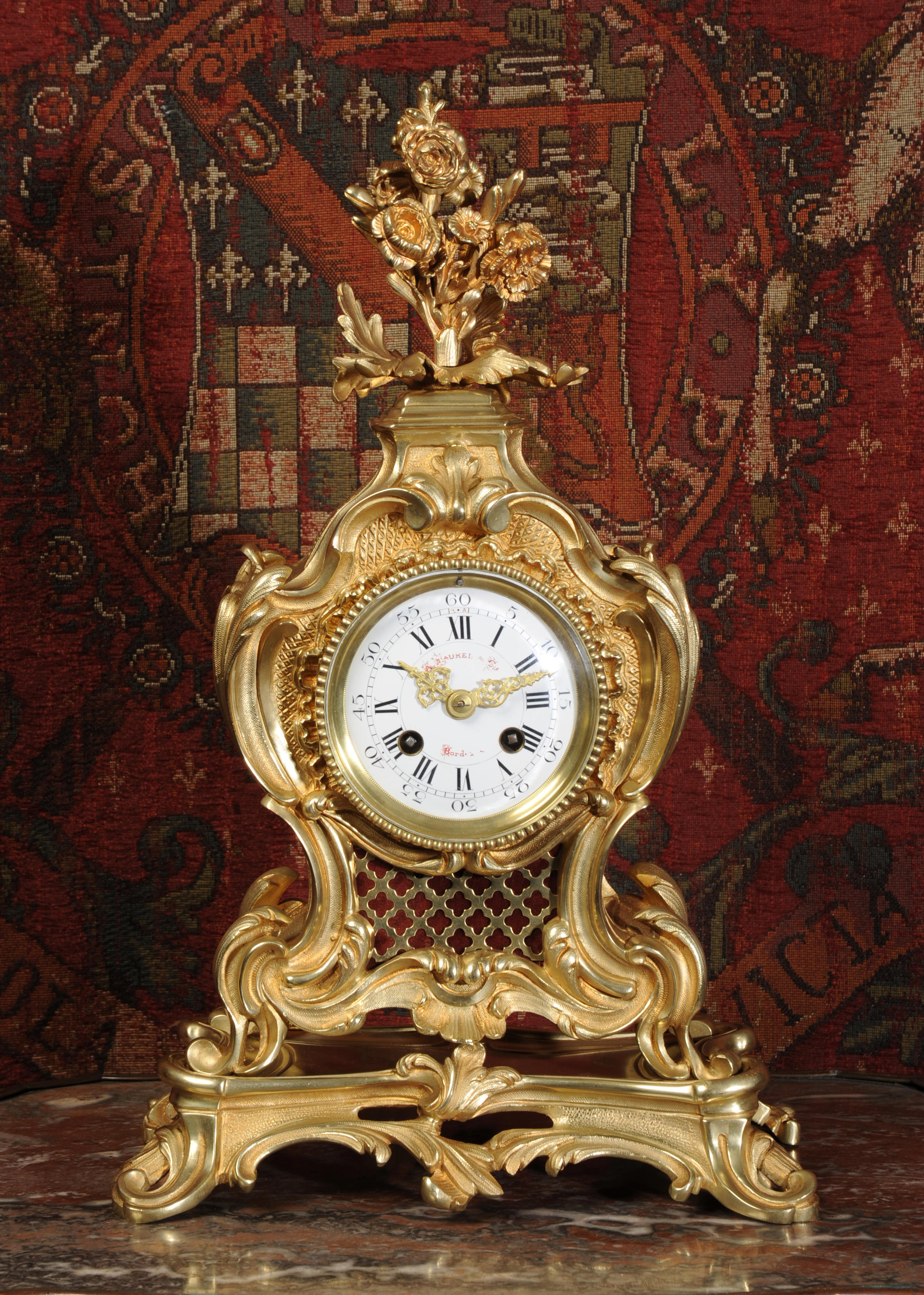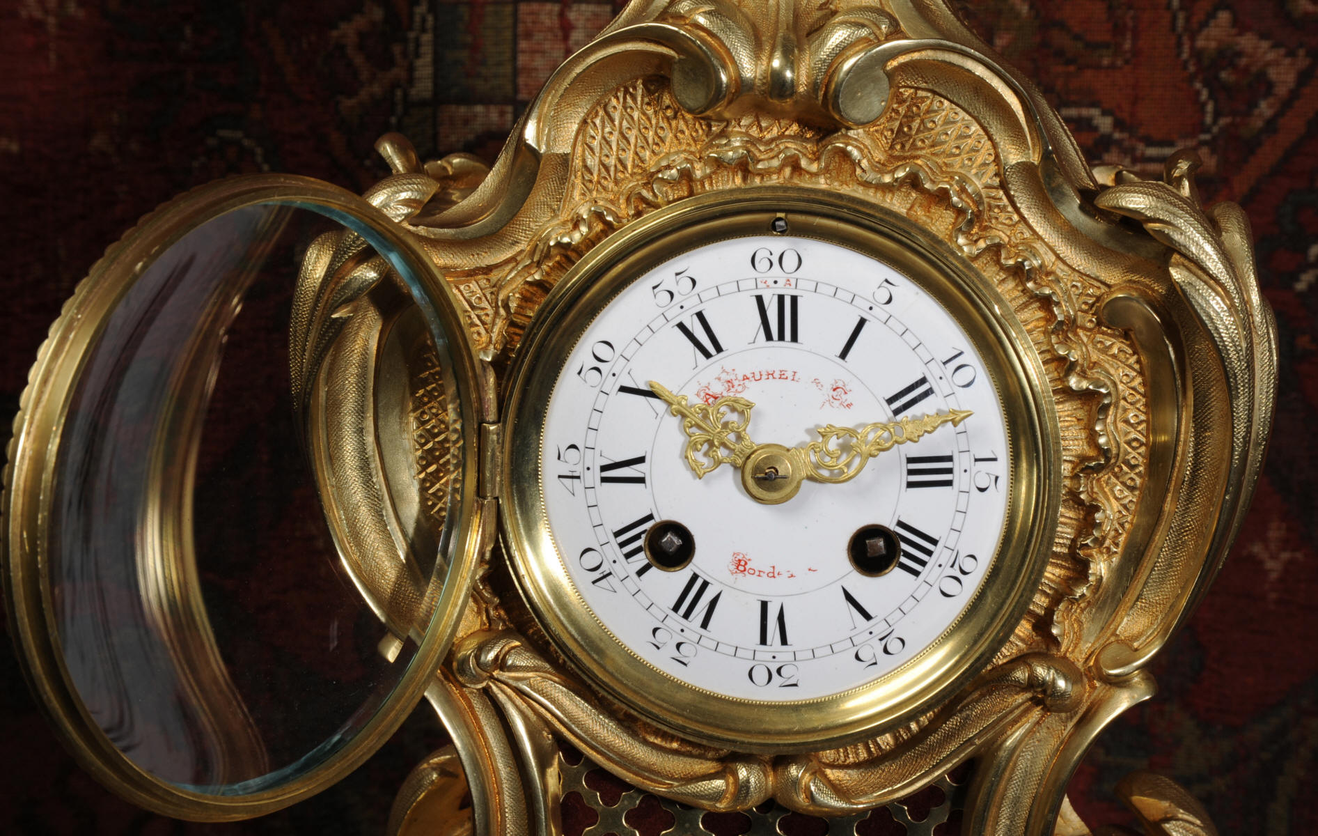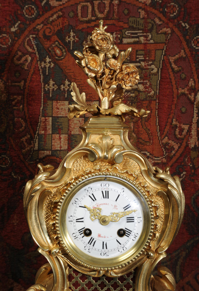 The beautiful dial is enamel on copper, a Roman hour ring and a separate outside minute ring. It is complete with its original finely fretted brass hands and convex glazed bezel. It is signed for the retailer A Maurel of Bordeaux.