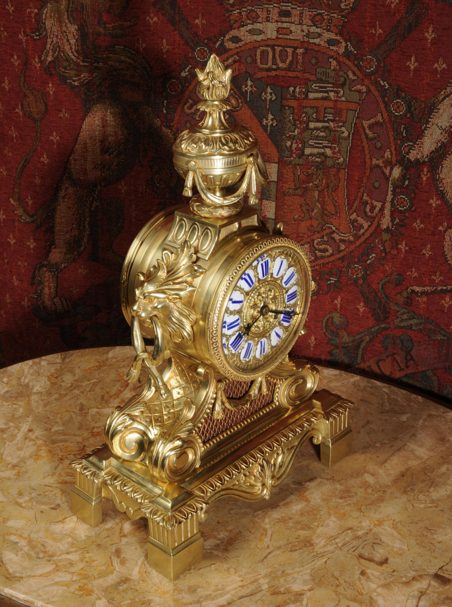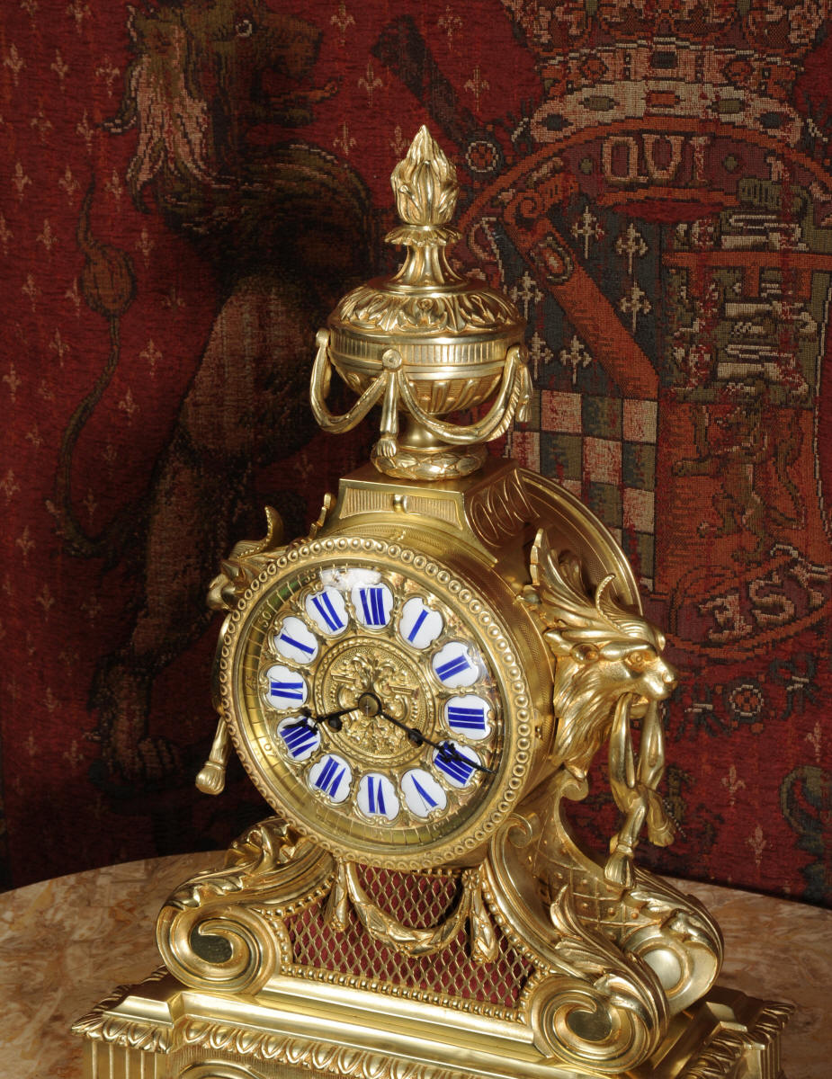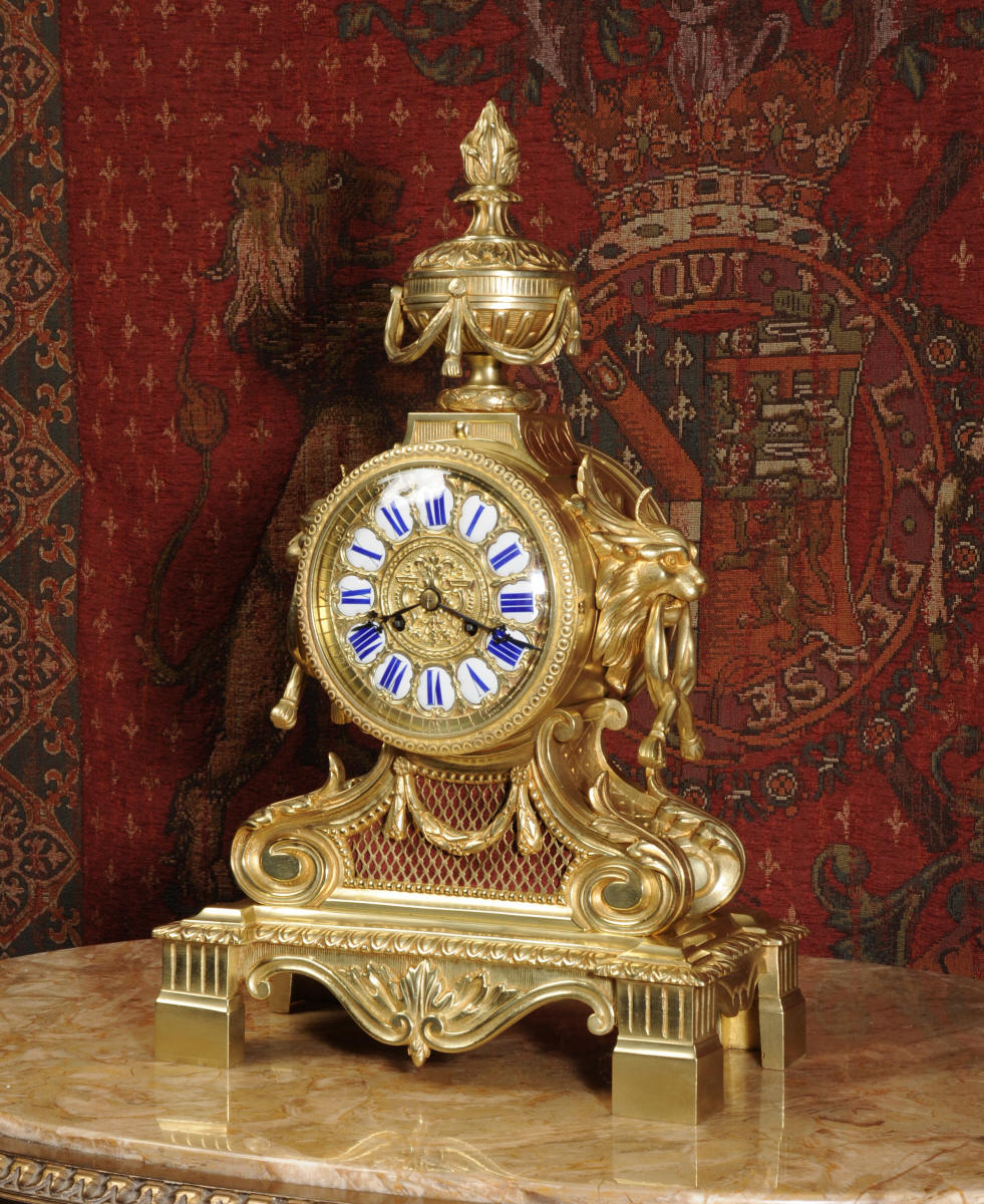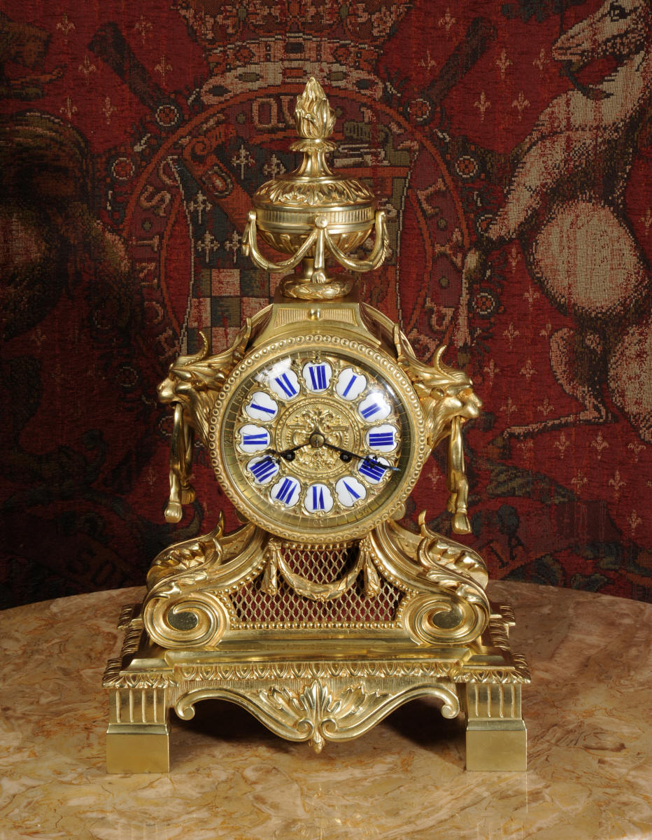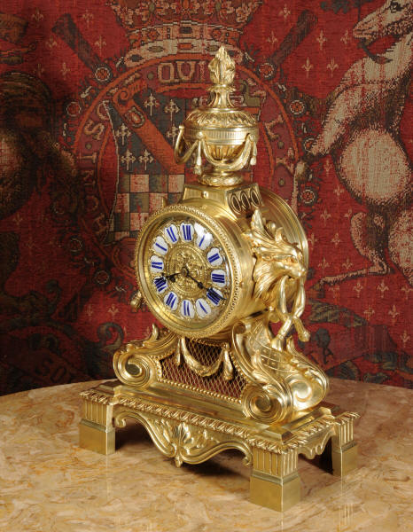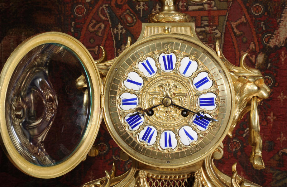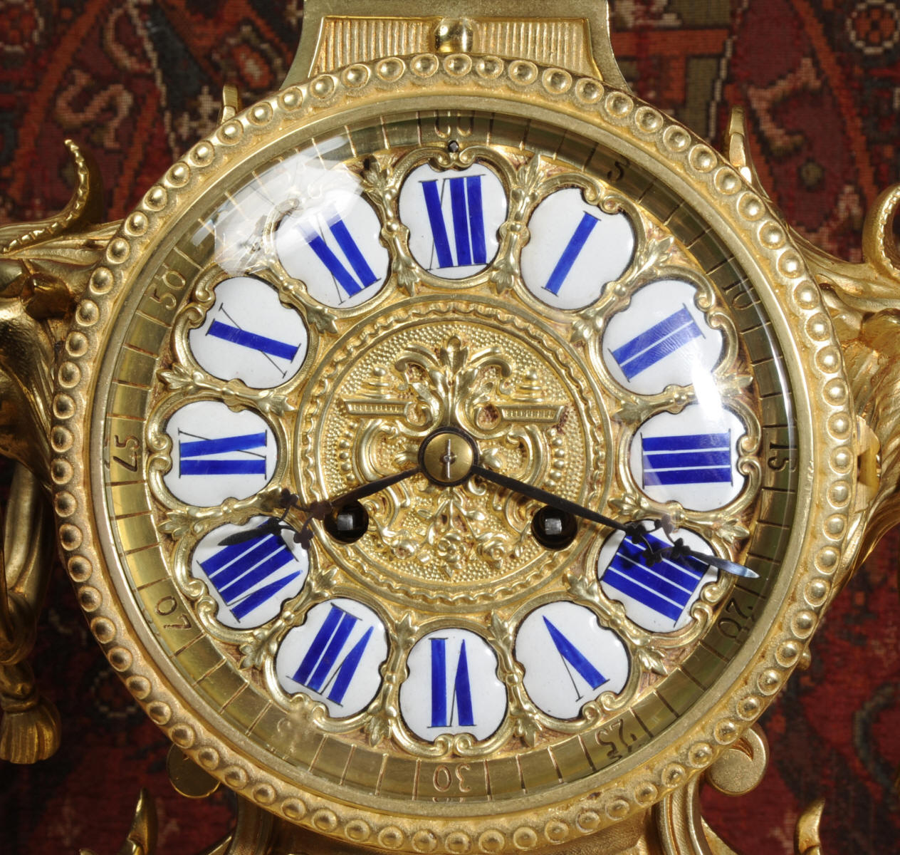 The large, stunning dial is also gilt brass with 12 individual enamel cartouches and blued steel hands.