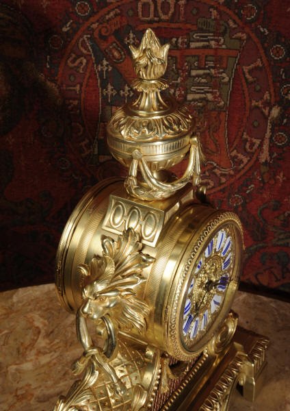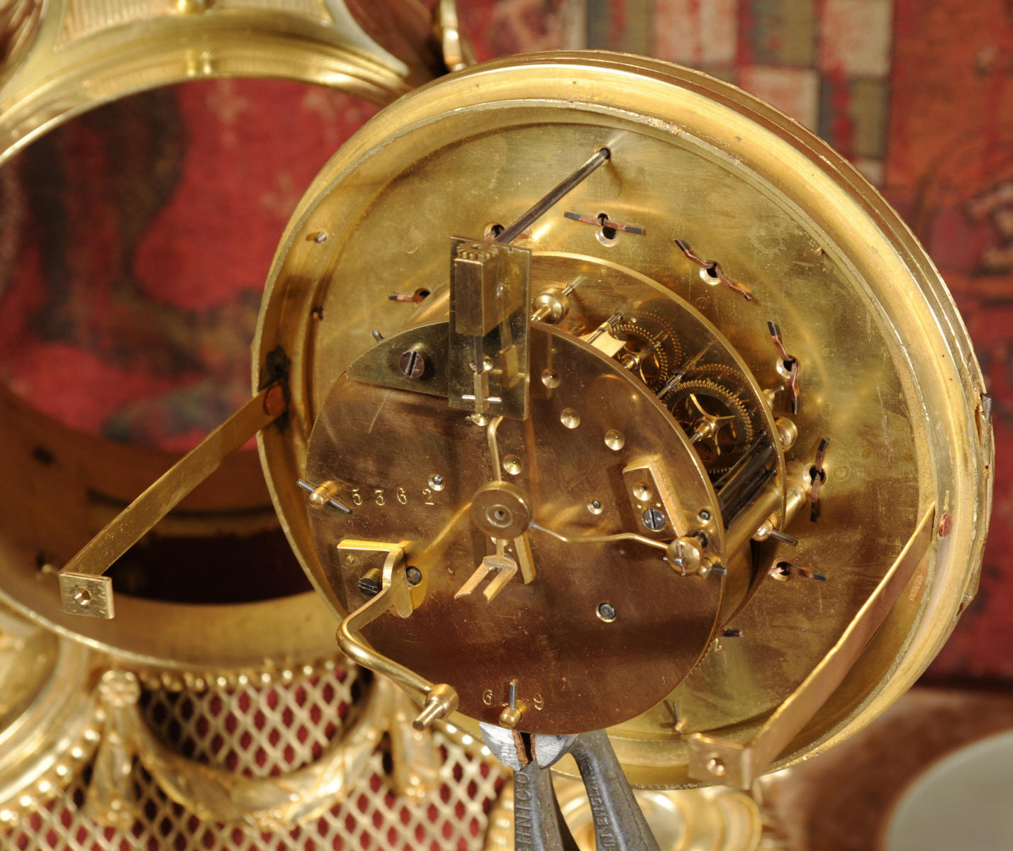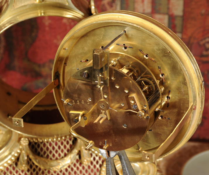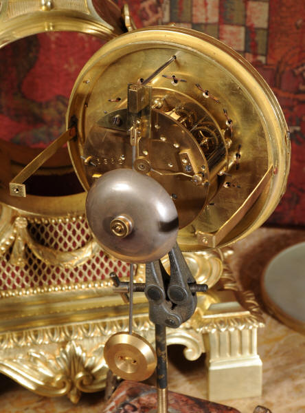 The French movement is of high quality and is in excellent clean and running condition and is in full working order. Pendulum is a replacement. It runs for 8 days and strikes the hours and halves on a bell. Click the video clip below to hear the bell and watch the clock running!