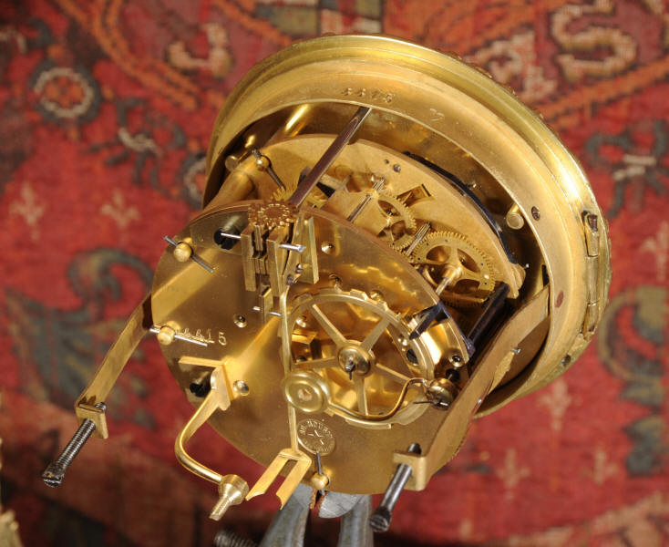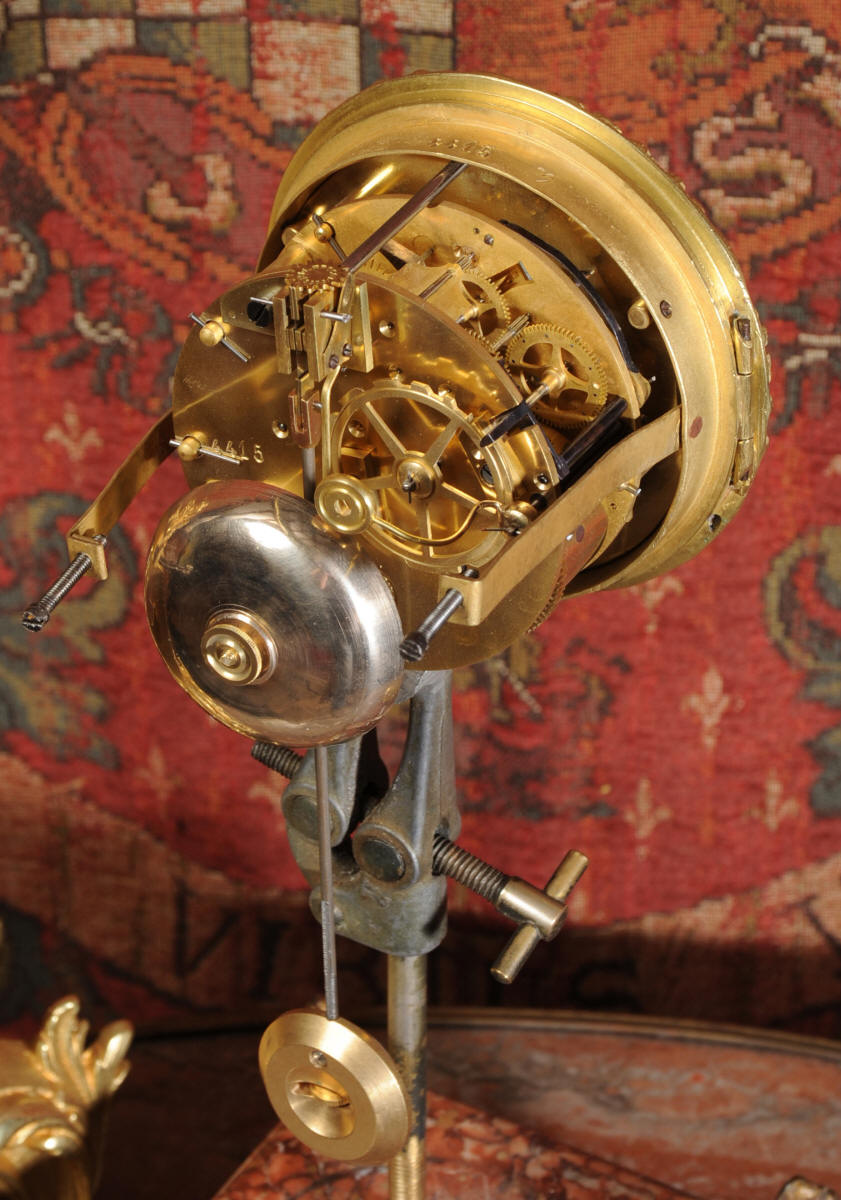 The French movement is by A. D. Mougin and is of the maker's usual high quality. It is in excellent clean and running condition having been fully overhauled by our clockmaker. Pendulum is a replacement. It runs for 8 days on one wind and strikes the hours and halves on a bell. Click the video clip below to hear the bell and watch the clock running!