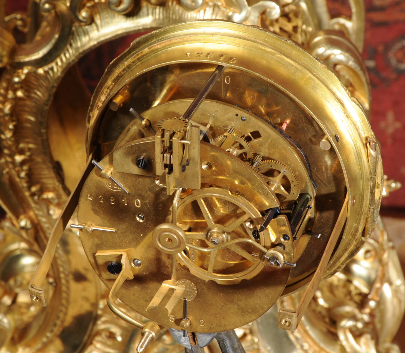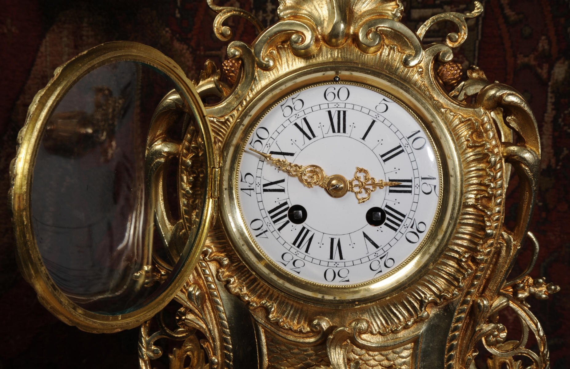 The dial is enamel on copper with separate minute ring. It is complete with finely fretted gilt brass hands and convex glass fitted to the Rococo bezel.