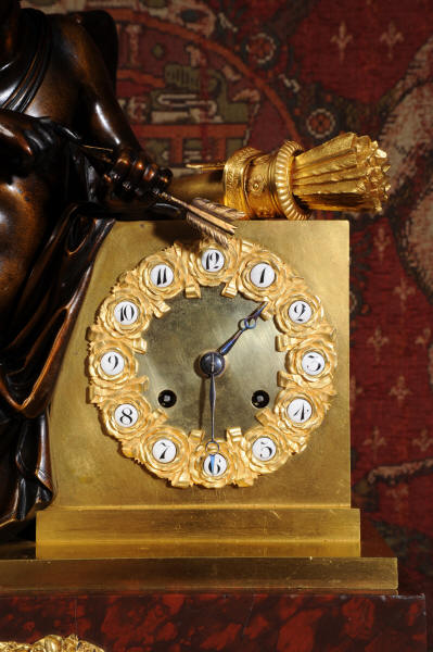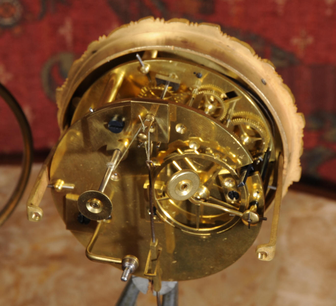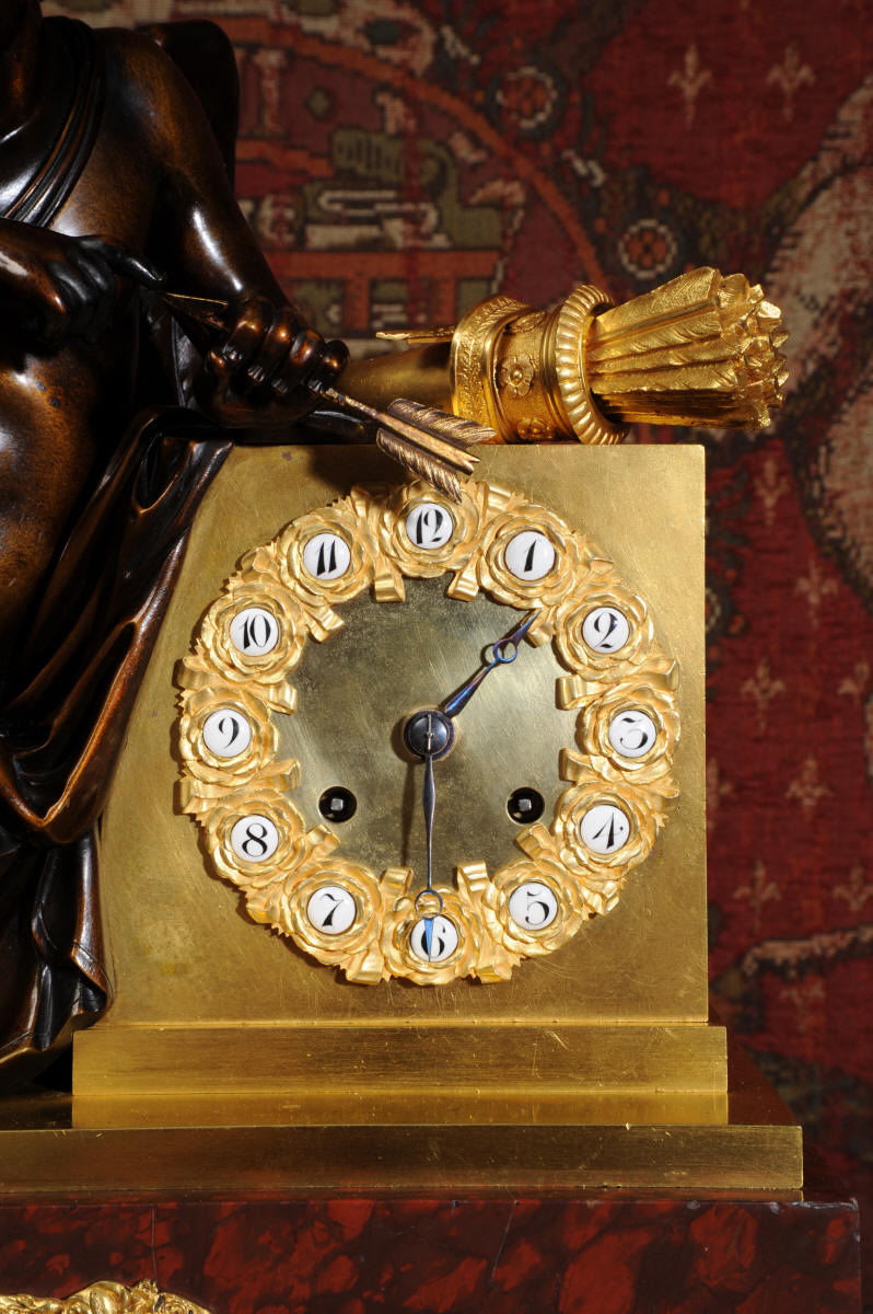 Condition of the case is excellent, the gilding is beautifully clean and bright with hardly any wear or discolouration and there are no losses. The dial is also in excellent condition, no damage to the cartouches. The dial centre has been polished at some time. The bronze figure has a lovely patina and has been lacquered at some time to preserve this. The marble is in excellent condition with just some tiny nibbles to the edges. A beautiful clock to add to your collection.
