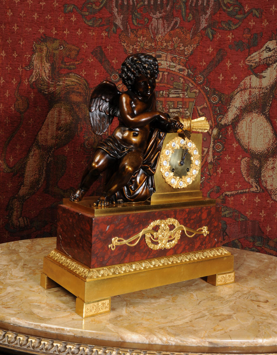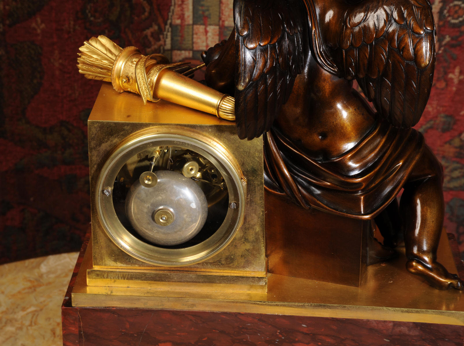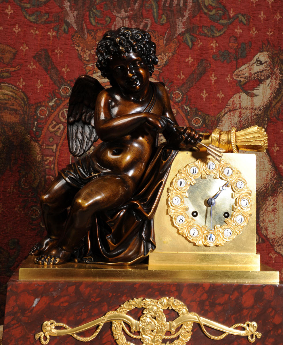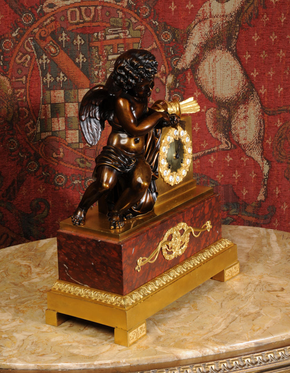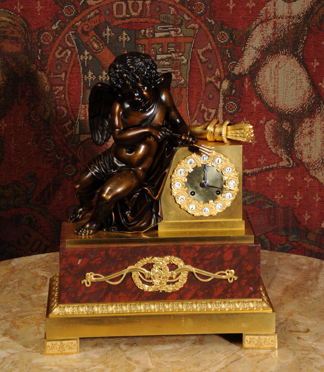 and Fine Bronze, Ormolu and Specimen Marble Clock with Cupid