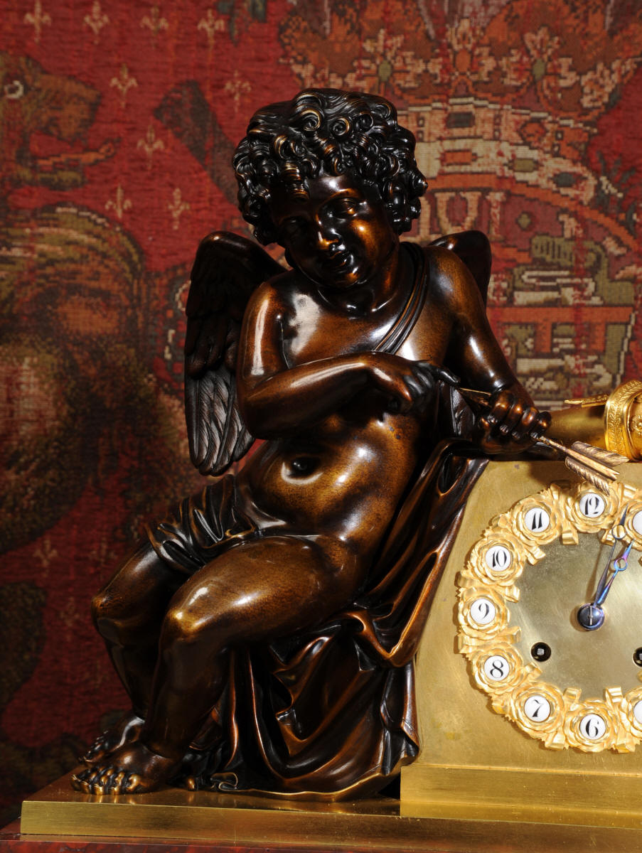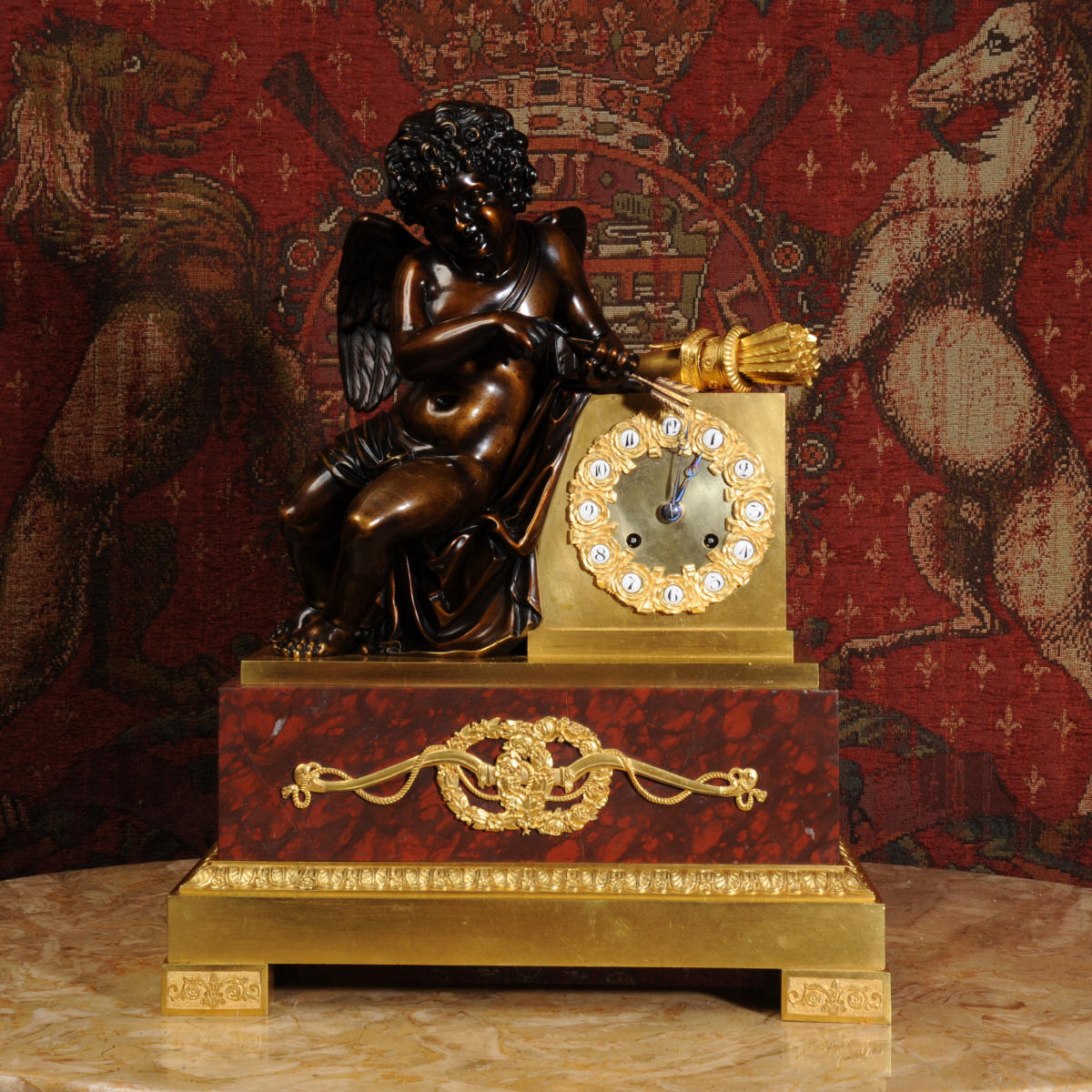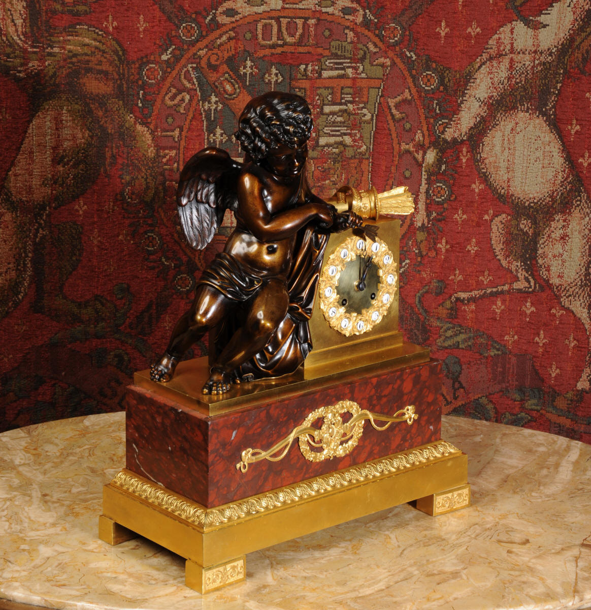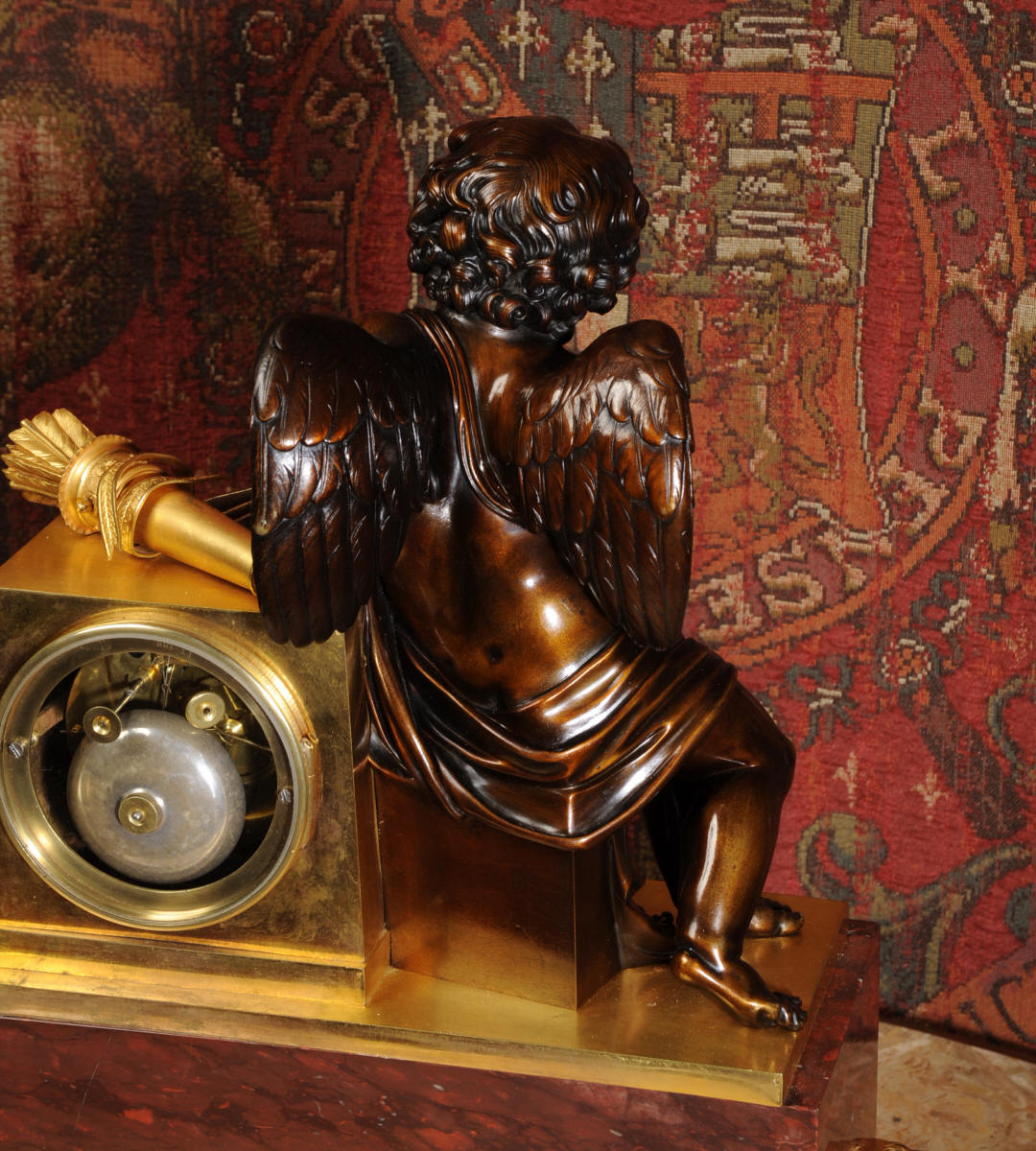 and Fine Bronze, Ormolu and Specimen Marble Clock with Cupid