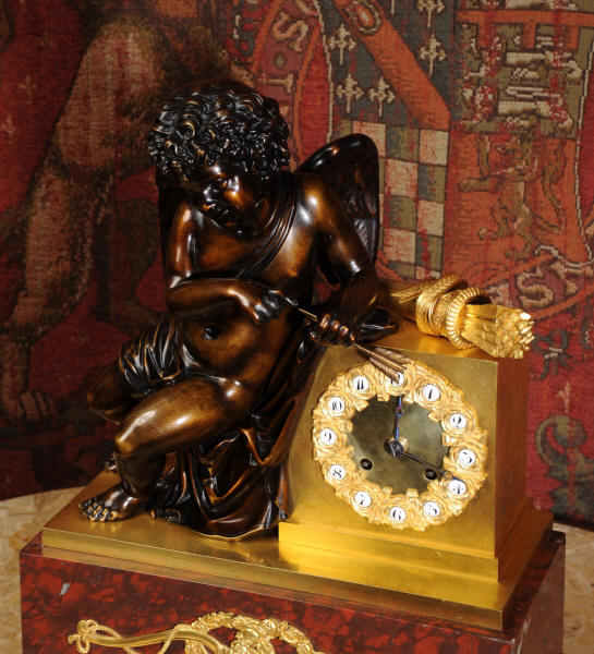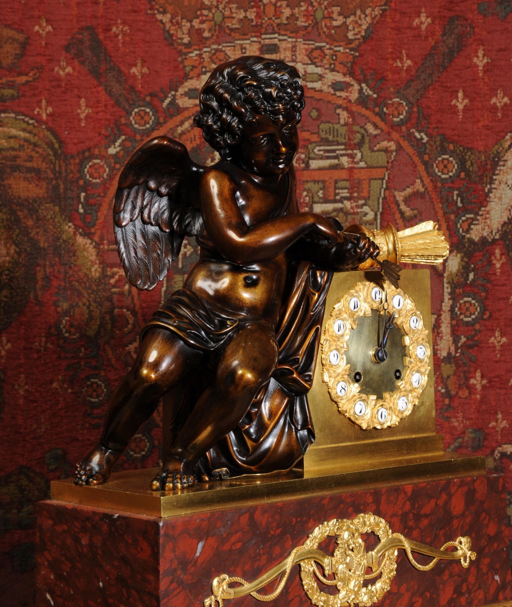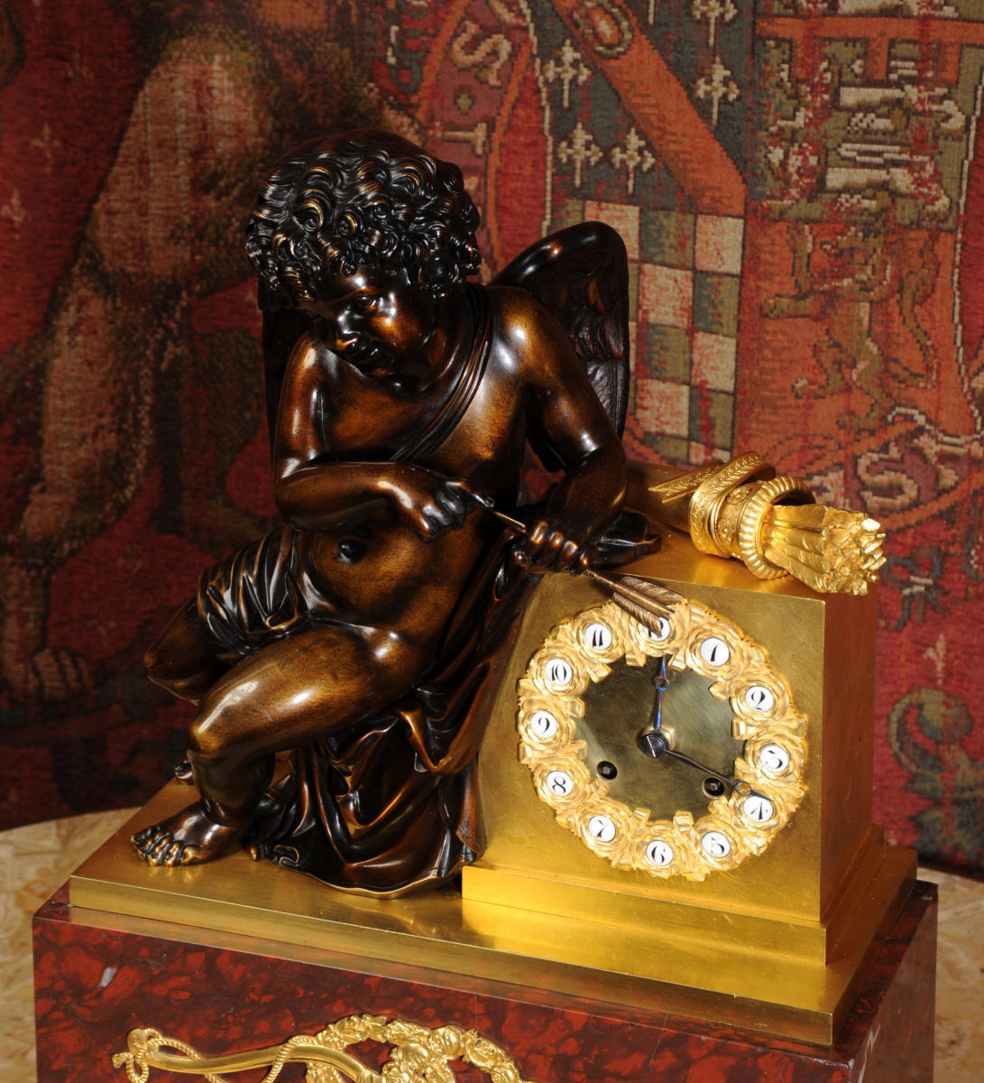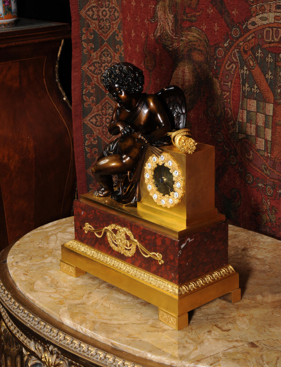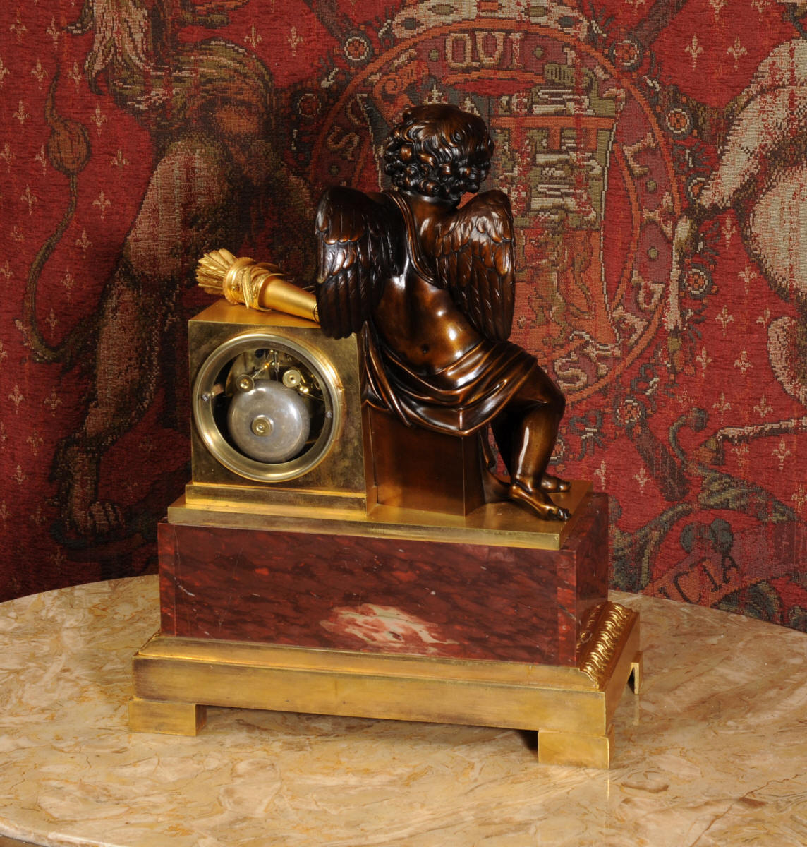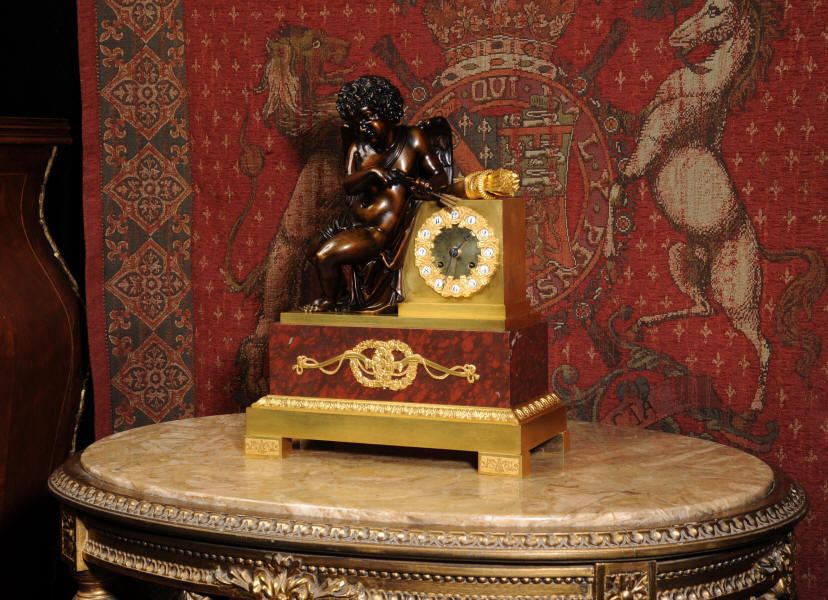 and Fine Bronze, Ormolu and Specimen Marble Clock with Cupid