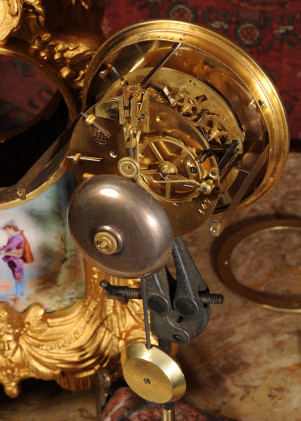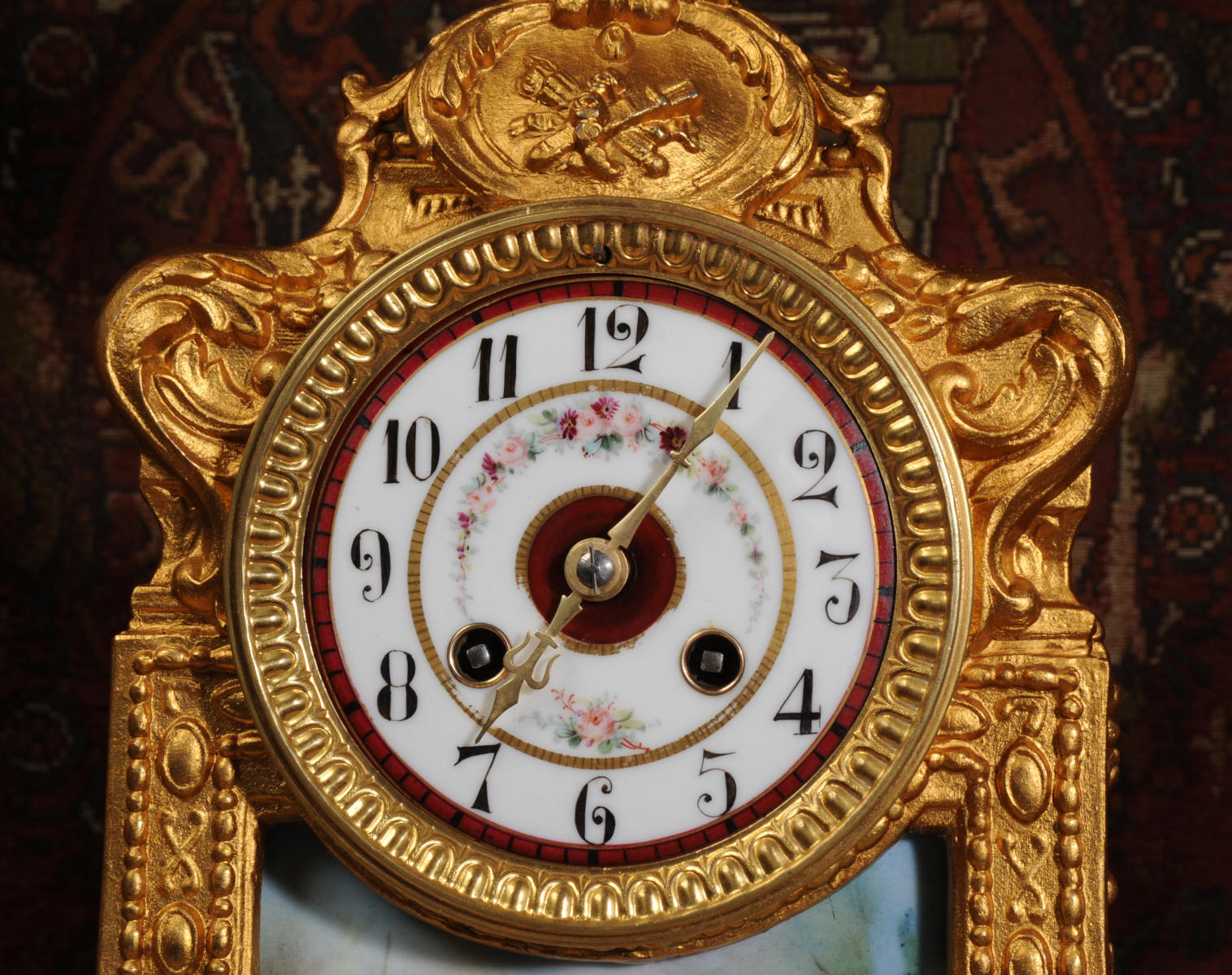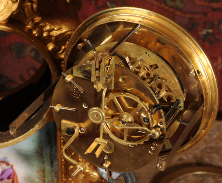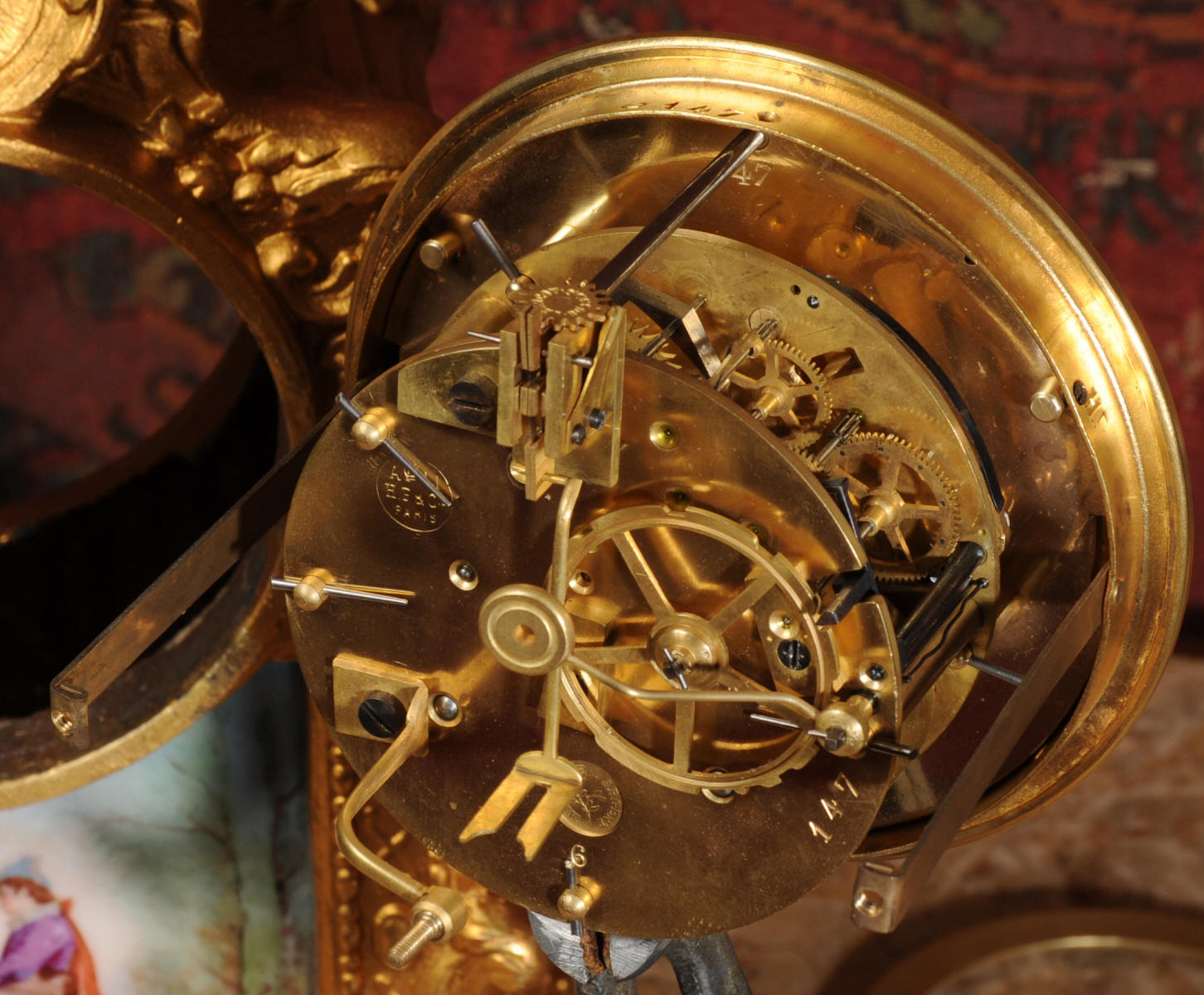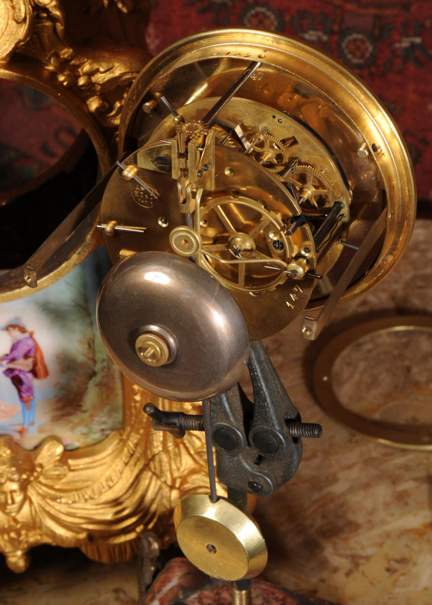 Condition of the case is very good, there is wear to the original gilding and we have polished it to a bright and clean finish as you can see in the pictures below. The rear of the case has some original foundry faults which don't detract and there is some stress cracking to one foot and the top of the base of one side piece. The tip of the front left hand foot of the clock has been repaired at some time, it strong and doesn't detract. The porcelain is in excellent condition with no chips or scratches. The vast majority of the over-glaze gilt decoration is fresh and complete with remarkably little wear including the dial. This is a stunning clock to add to your collection.