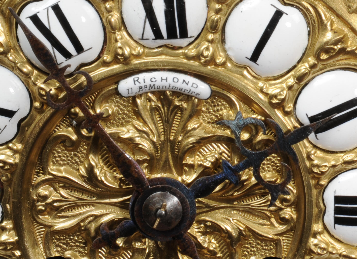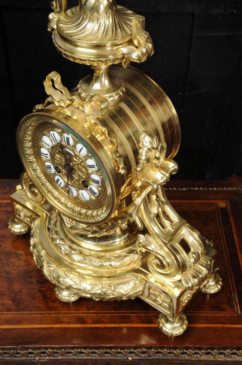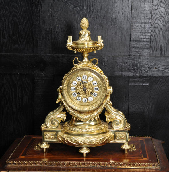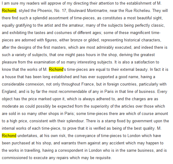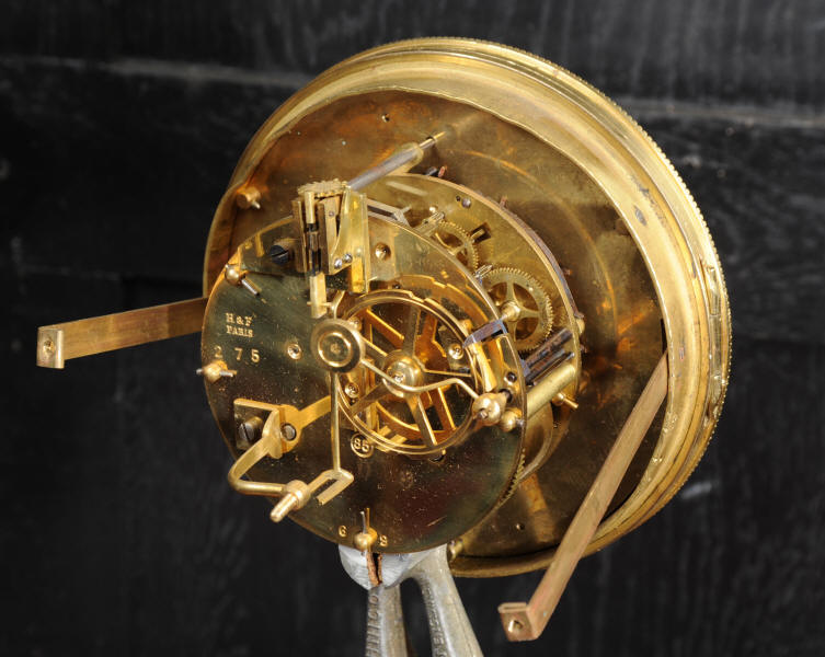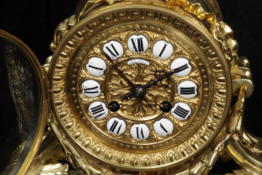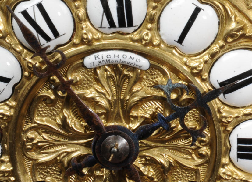The dial is boldly modelled in gilt bronze with 12 individual enamel cartouches and original blued steel hands. There is also a cartouche with the retailers signature of Richond of the famous Boulevard Montmartre, Paris. He is listed in Tardy, Dictionnaire des Horlogers Francais as working in Boulevard Montmartre between 1850 and 1870. He is also mentioned in a contemporary work 'How to enjoy Paris in 1842 - see below', a particularly interesting and charming account of the retailers premises. The French movement is of high quality and has the clockmakers mark H&F Paris on the backplate. It is in excellent clean and running condition having been fully overhauled by our clockmaker. Pendulum is a replacement. It runs for 8 days on one wind and strikes the hours and halves on a bell. Click the video clip below to hear the bell and watch the clock running! Condition of the case is excellent, it is beautifully clean and bright with hardly any wear or discolouration and recently lacquered to protect the finish. The dial is also in excellent condition with no damage.