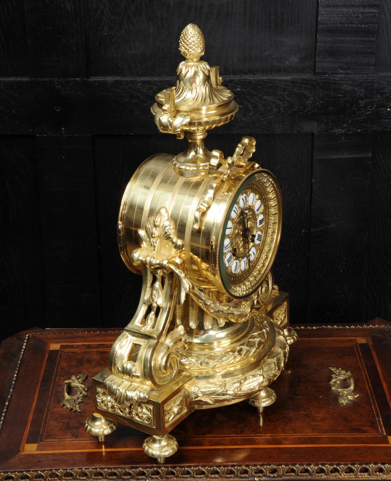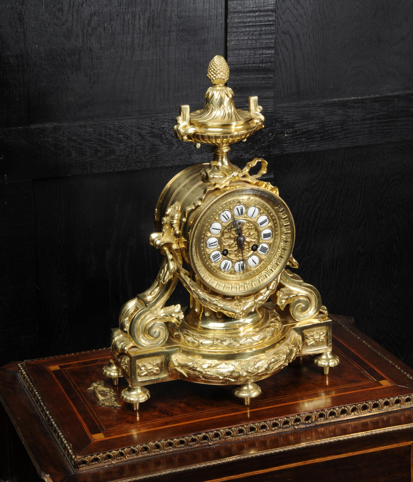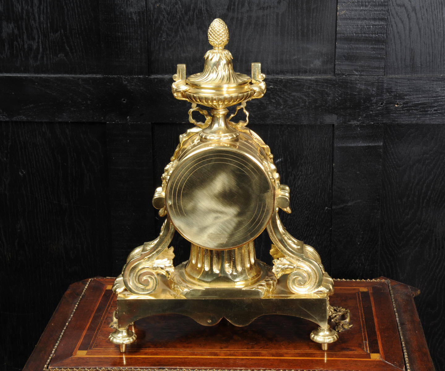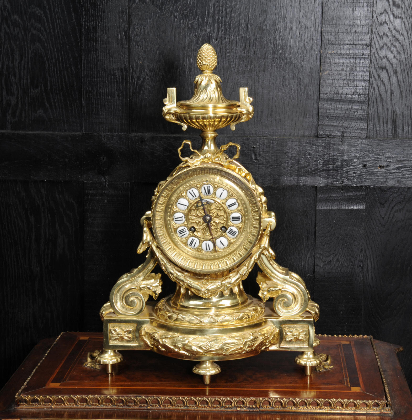 The dial is boldly modelled in gilt bronze with 12 individual enamel cartouches and original blued steel hands. There is also a cartouche with the retailers signature of Richond of the famous Boulevard Montmartre, Paris. He is listed in Tardy, Dictionnaire des Horlogers Francais as working in Boulevard Montmartre between 1850 and 1870. He is also mentioned in a contemporary work 'How to enjoy Paris in 1842 - see below', a particularly interesting and charming account of the retailers premises. The French movement is of high quality and has the clockmakers mark H&F Paris on the backplate. It is in excellent clean and running condition having been fully overhauled by our clockmaker. Pendulum is a replacement. It runs for 8 days on one wind and strikes the hours and halves on a bell. Click the video clip below to hear the bell and watch the clock running! Condition of the case is excellent, it is beautifully clean and bright with hardly any wear or discolouration and recently lacquered to protect the finish. The dial is also in excellent condition with no damage.