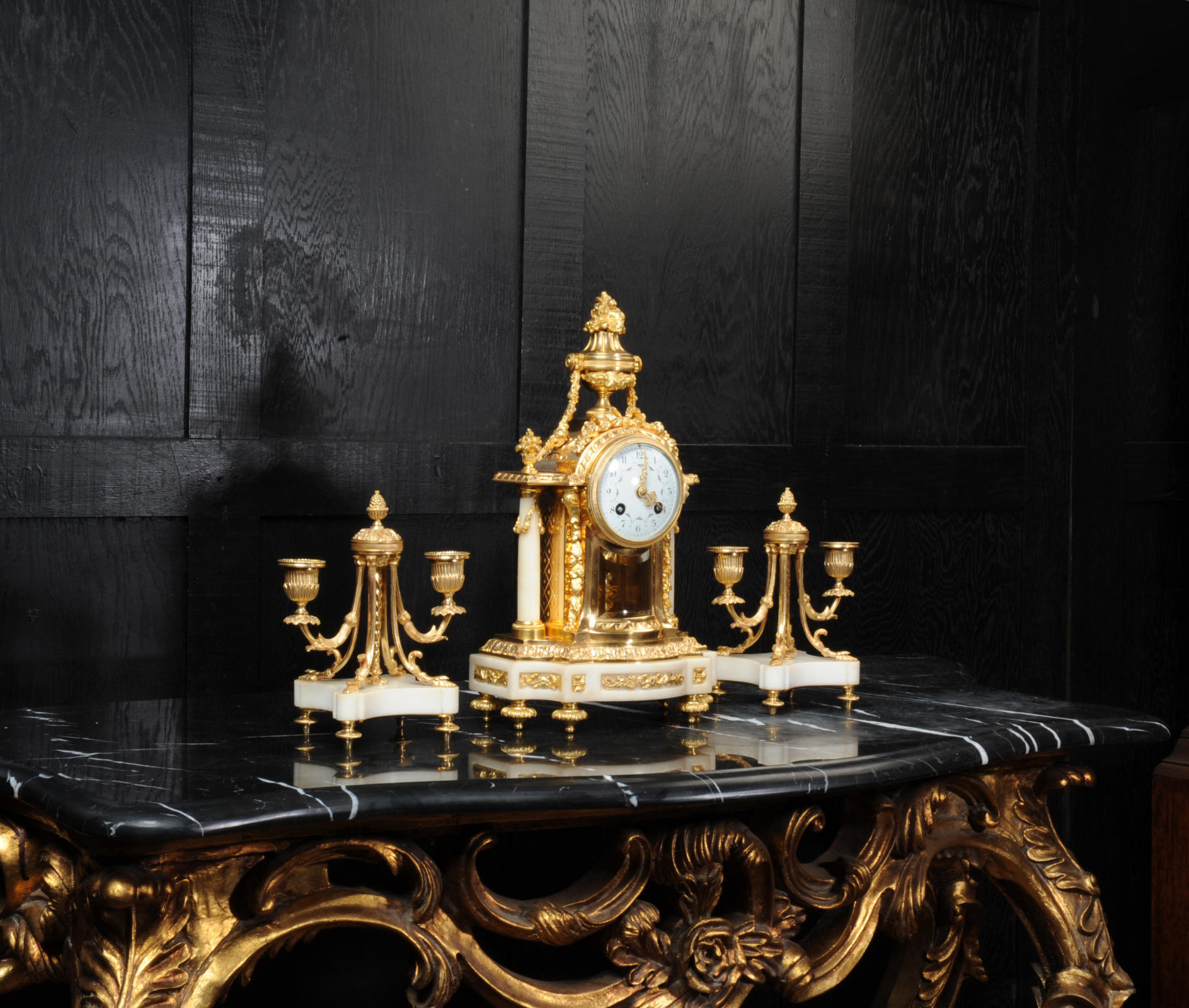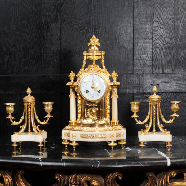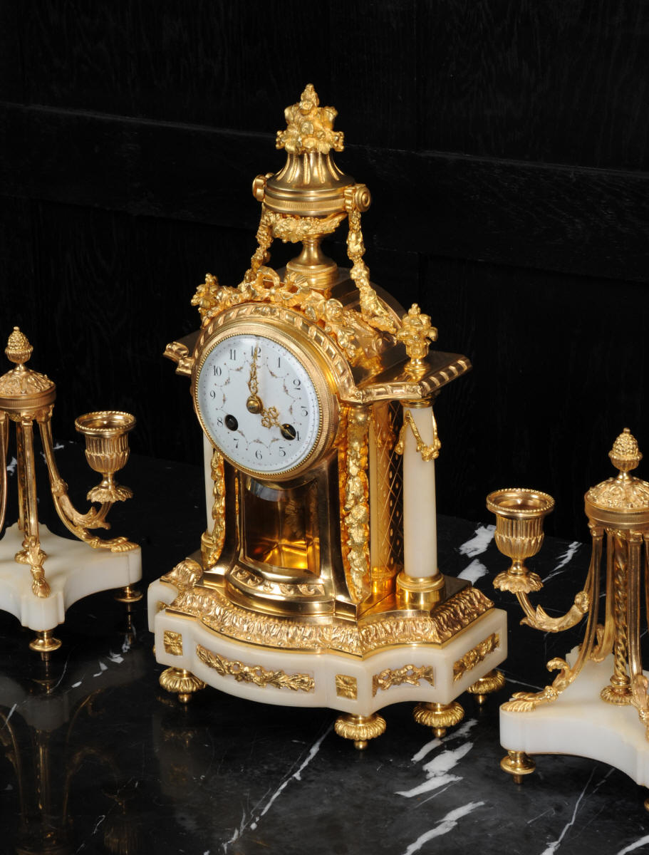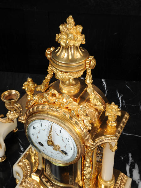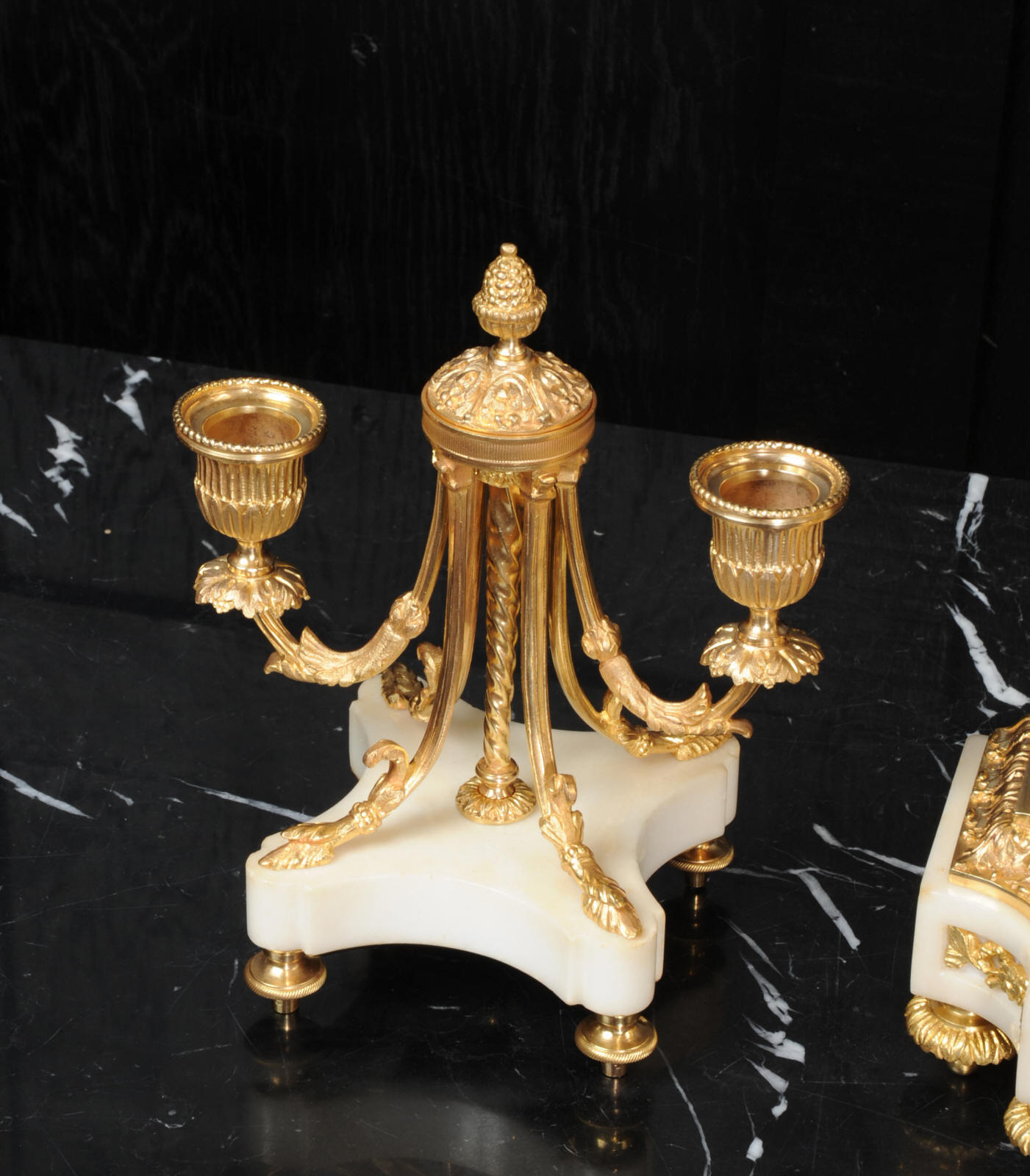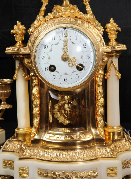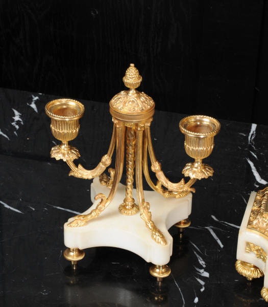 Candelabra are delicately modelled with acanthus supporting the two lights and a pineapple finial to the top. The dial is porcelain enamel with beautiful floral swags between the numbers and is complete with original finely fretted gilt hands and convex glass. The French movement is of high quality and is by Samuel Marti. It is in excellent clean and running condition having been fully overhauled by our clockmaker. Sunburst Pendulum is original. It runs for 8 days and strikes the hours and halves on a bell. Click the video clip below to hear the bell and watch the clock running!