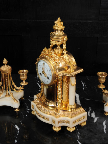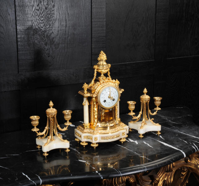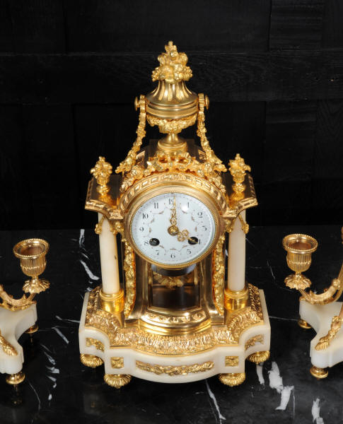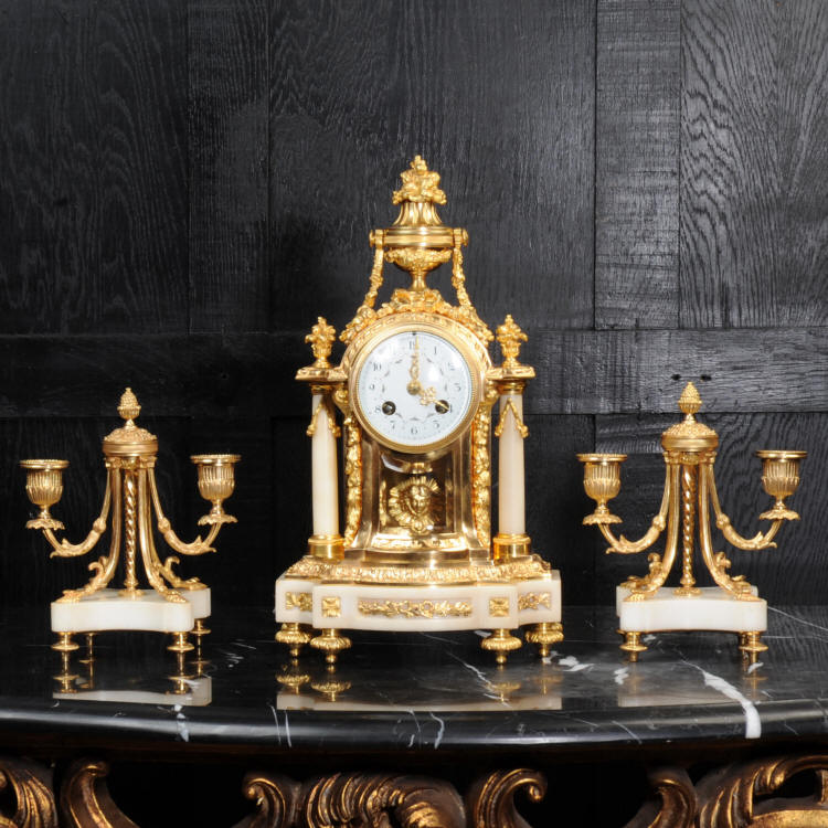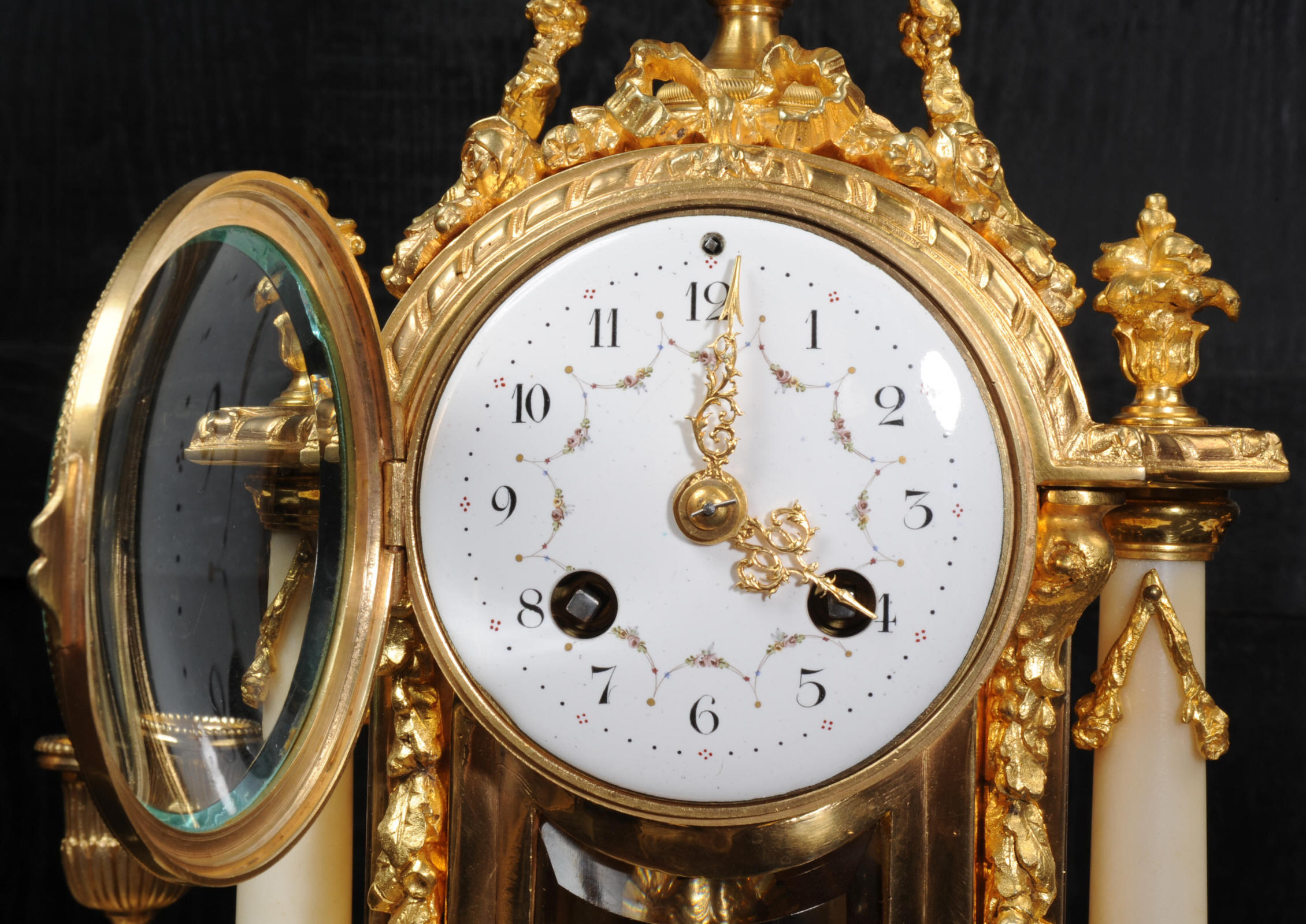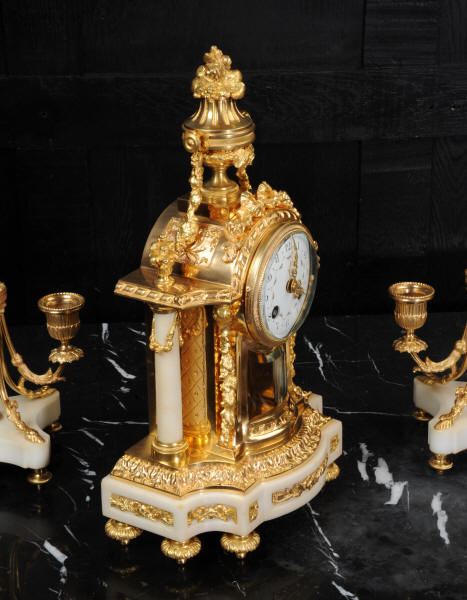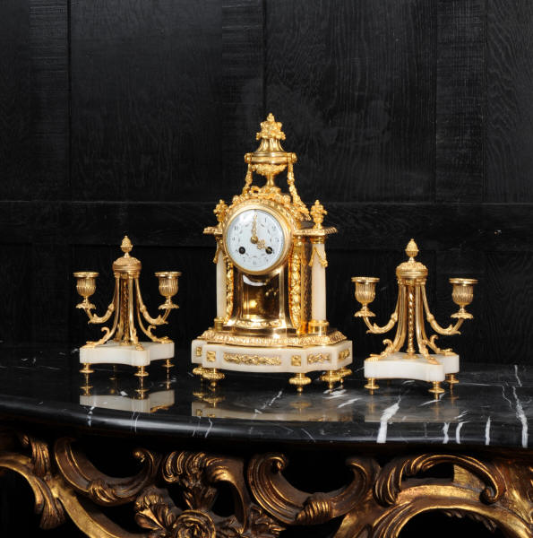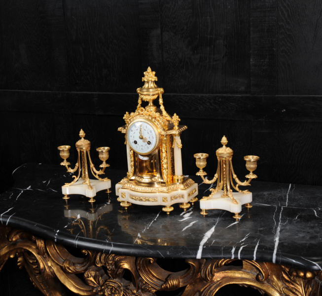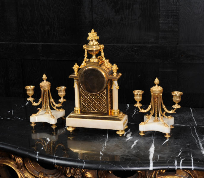 Candelabra are delicately modelled with acanthus supporting the two lights and a pineapple finial to the top. The dial is porcelain enamel with beautiful floral swags between the numbers and is complete with original finely fretted gilt hands and convex glass. The French movement is of high quality and is by Samuel Marti. It is in excellent clean and running condition having been fully overhauled by our clockmaker. Sunburst Pendulum is original. It runs for 8 days and strikes the hours and halves on a bell. Click the video clip below to hear the bell and watch the clock running!