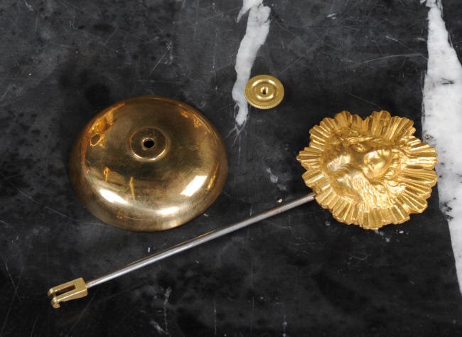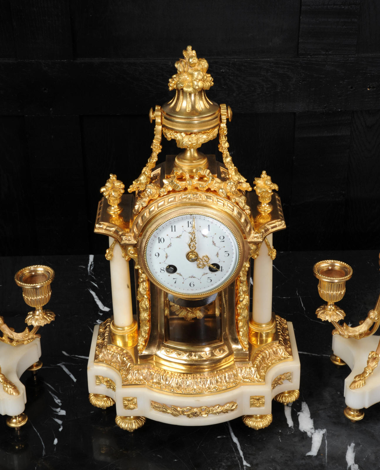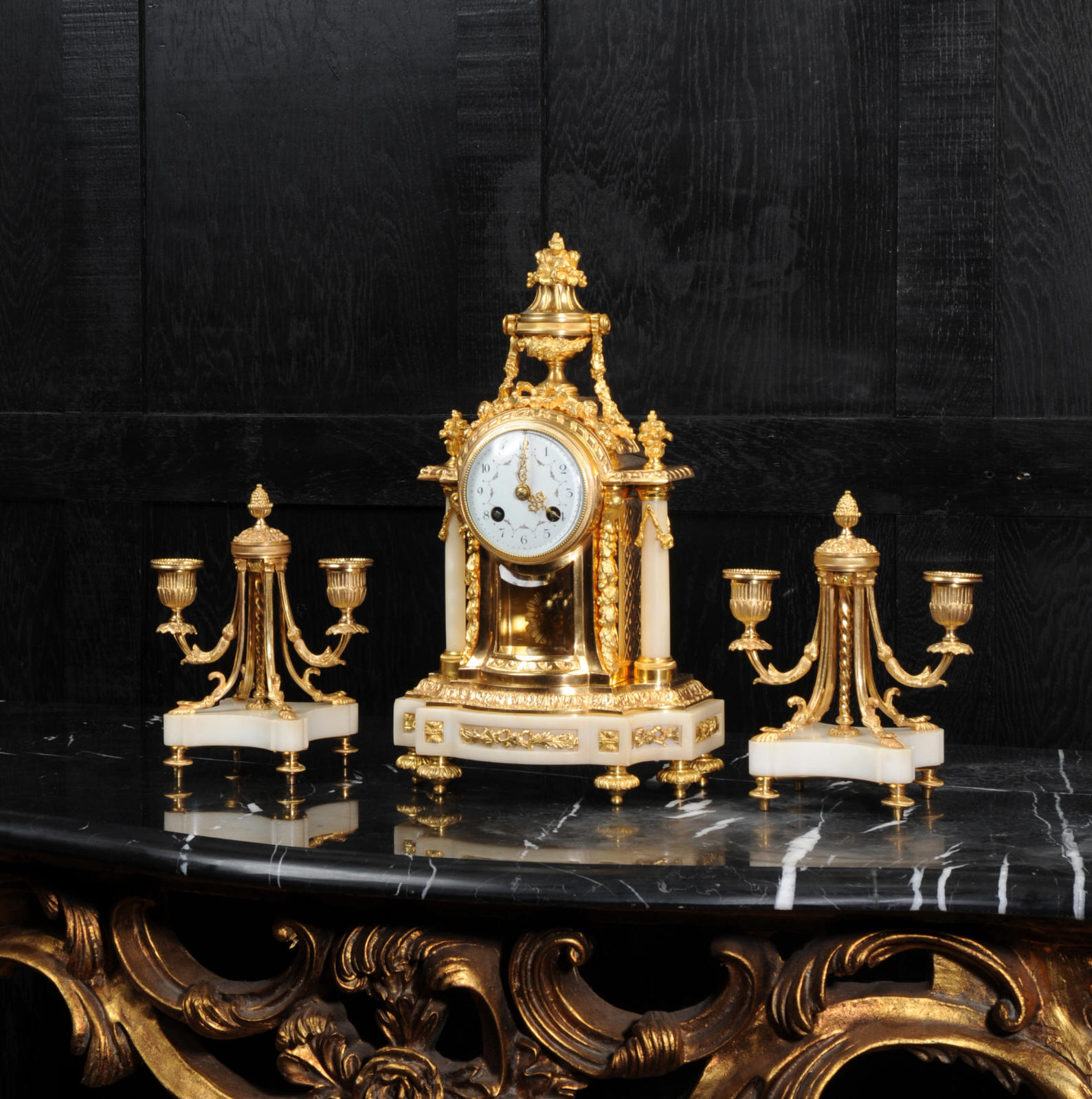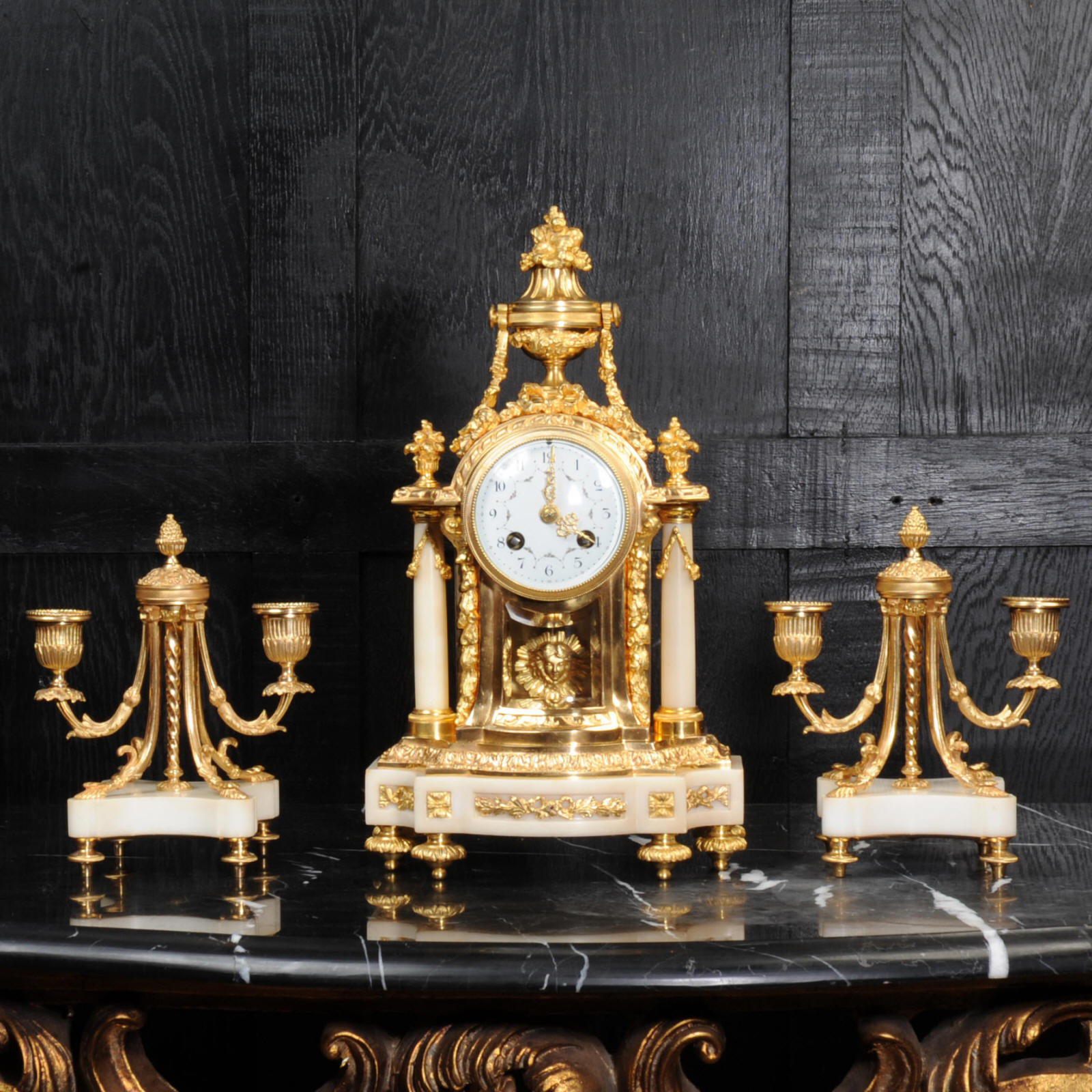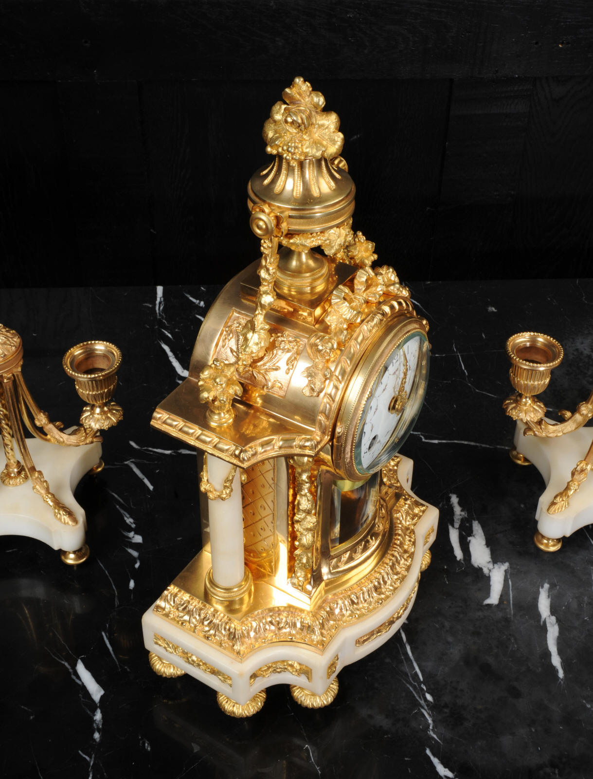 Candelabra are delicately modelled with acanthus supporting the two lights and a pineapple finial to the top. The dial is porcelain enamel with beautiful floral swags between the numbers and is complete with original finely fretted gilt hands and convex glass. The French movement is of high quality and is by Samuel Marti. It is in excellent clean and running condition having been fully overhauled by our clockmaker. Sunburst Pendulum is original. It runs for 8 days and strikes the hours and halves on a bell. Click the video clip below to hear the bell and watch the clock running!