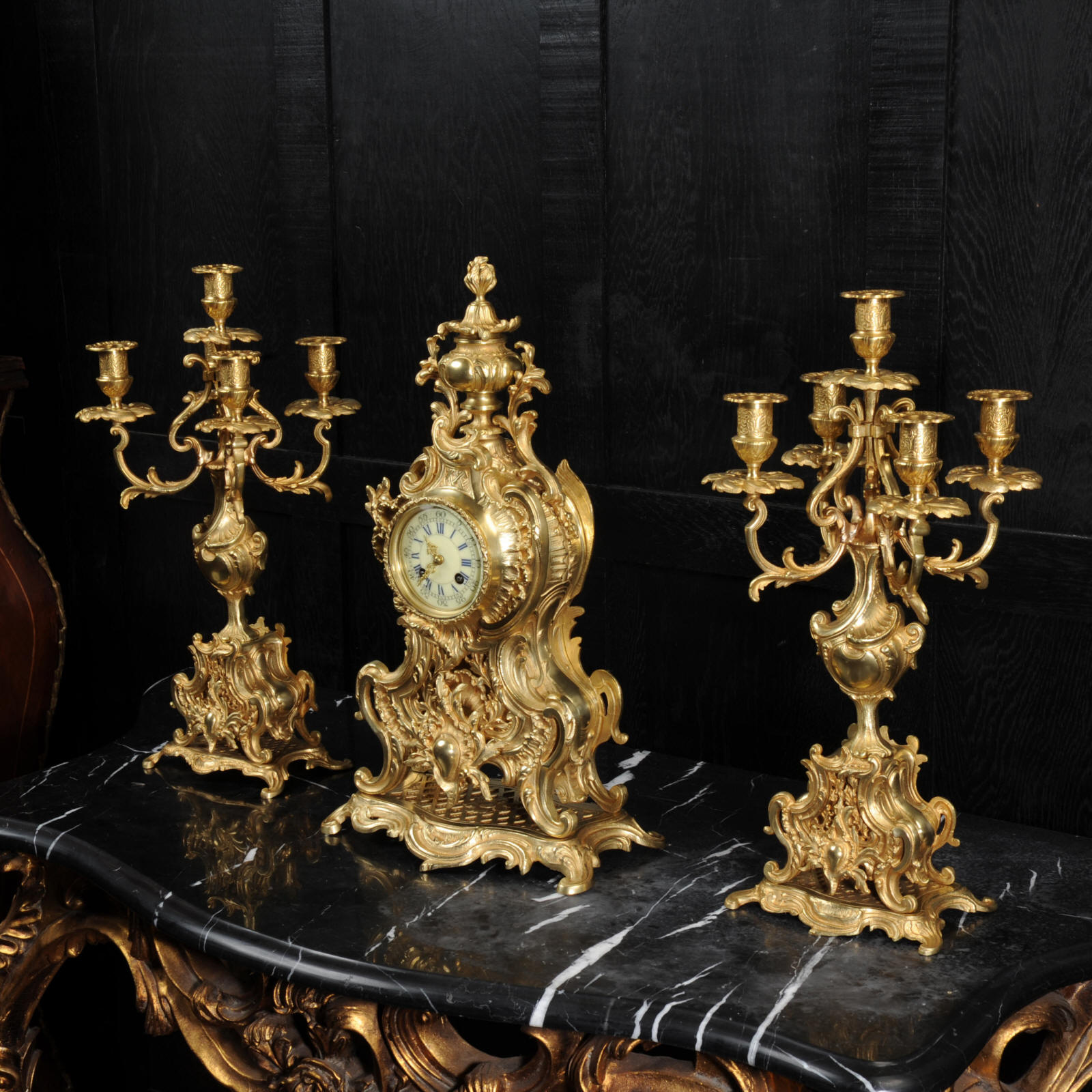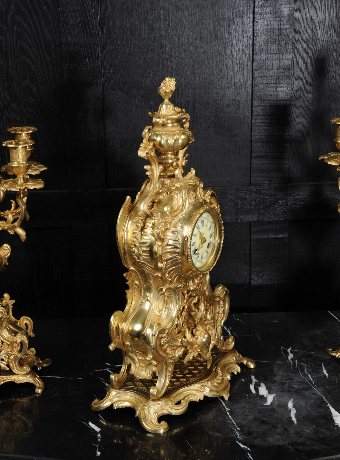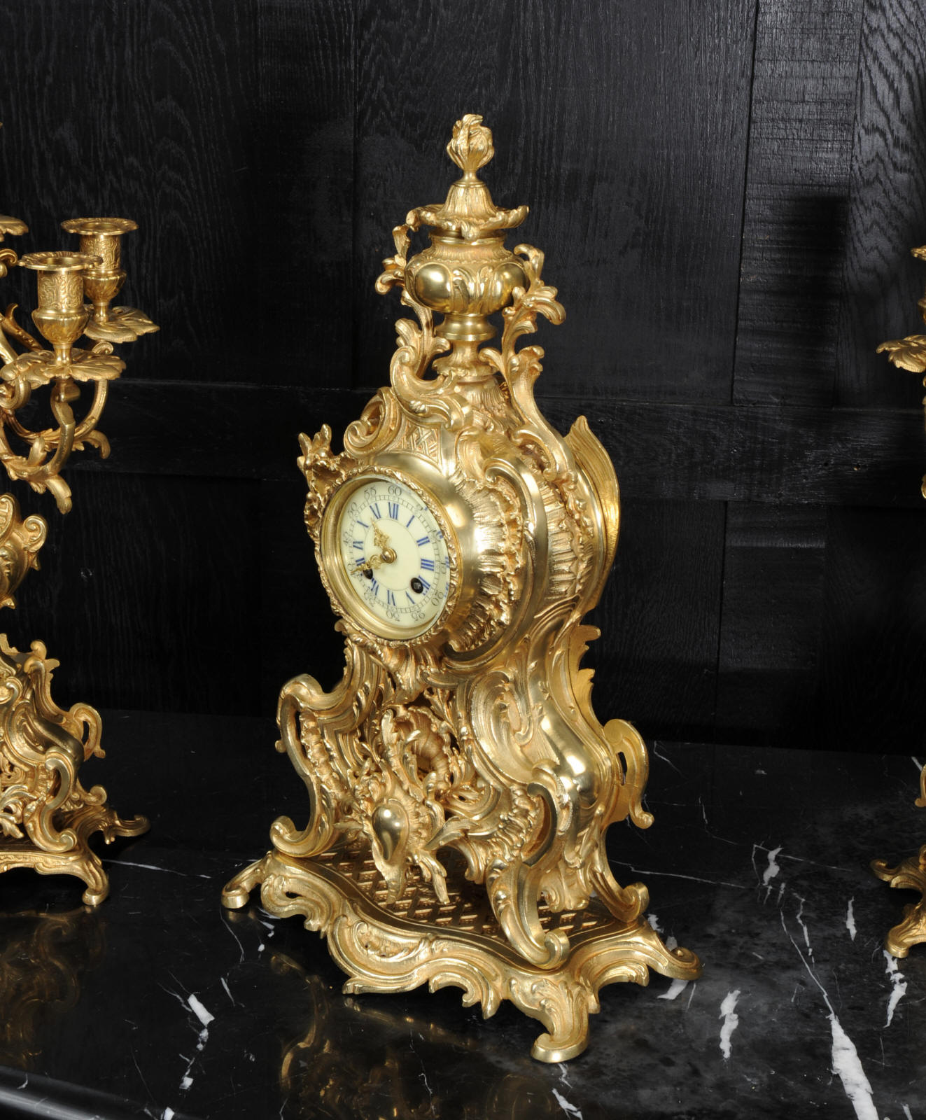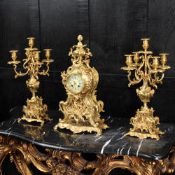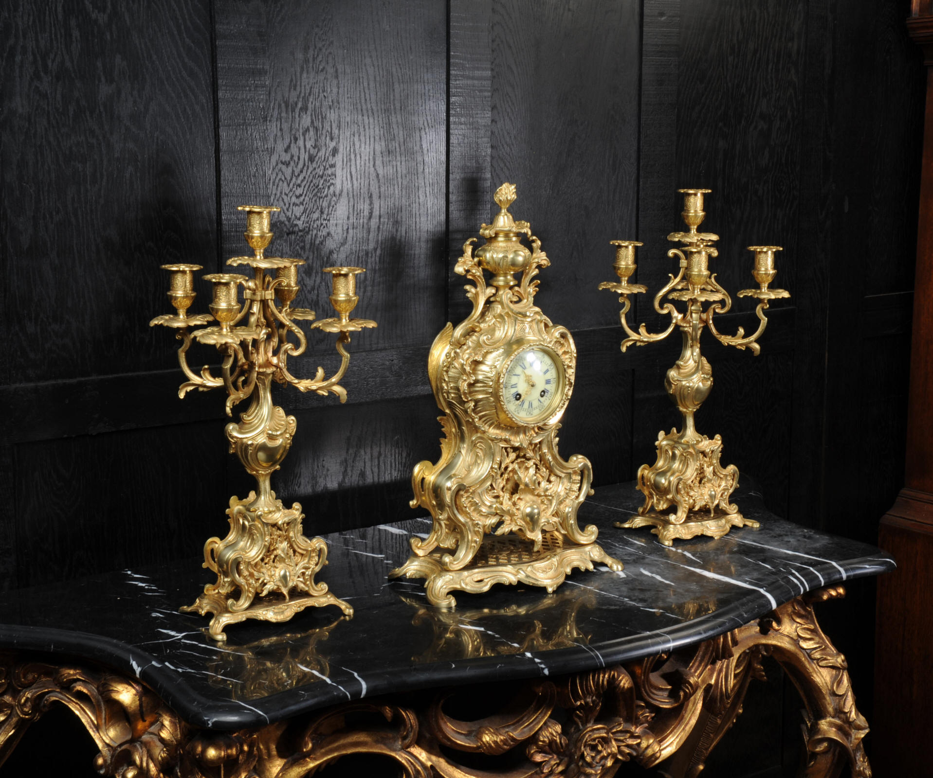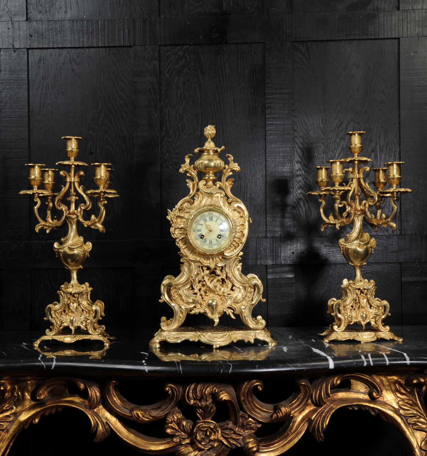 The dial is cream porcelain enamel with blue letters and a separate minute ring in black. It is complete with original finely fretted gilt hands and Rococo bezel with convex glass. The French movement is of high quality and is by A. D. Mougin. It is in excellent clean and running condition having been fully overhauled and tested by our clockmaker. Pendulum is a replacement. It runs for 8 days and strikes the hours and halves on a bell. Click the video clip below to hear the bell and watch the clock running. Condition of the case is excellent, the original gilding is beautifully clean and bright with hardly any wear or discolouration and there are no losses. The dial is also in excellent condition just some nibbles next to the winding holes. The set makes a stunning display as you can see below.