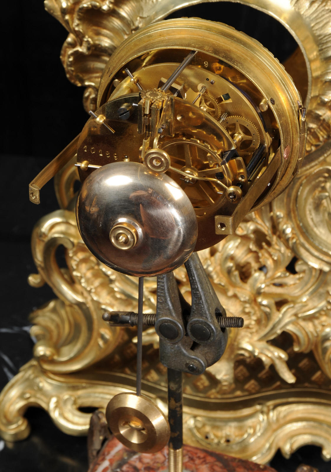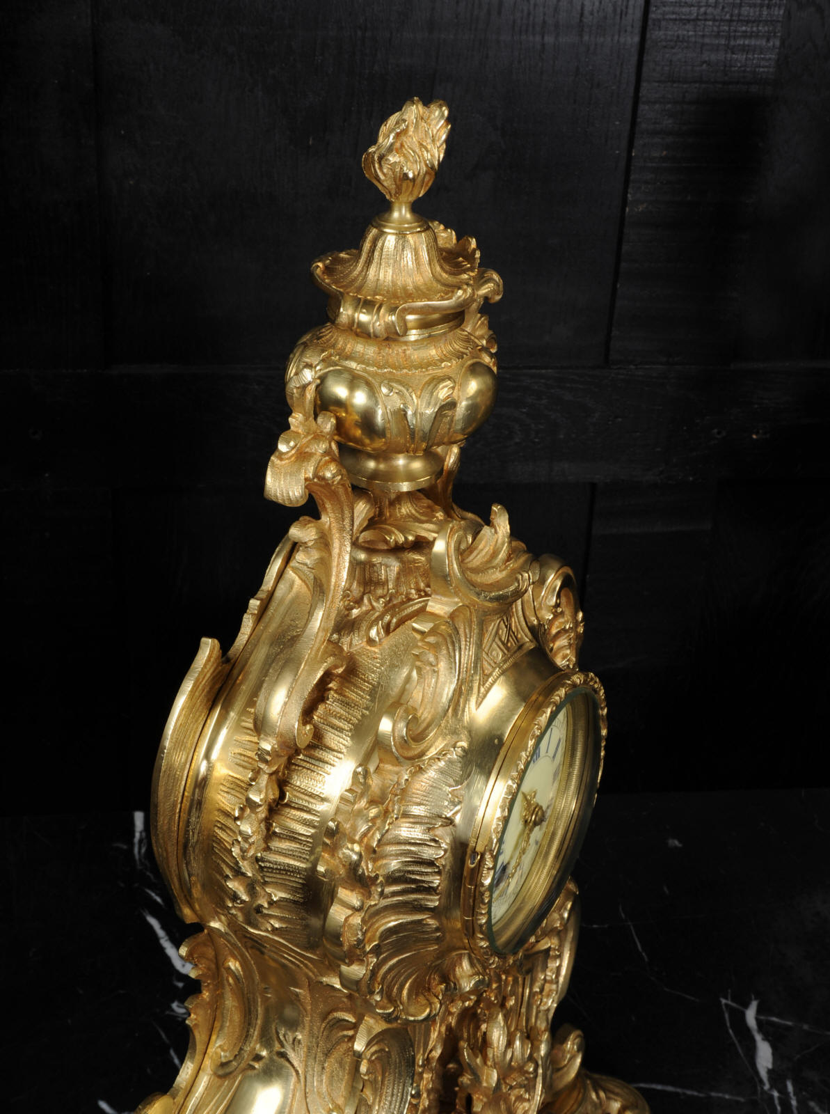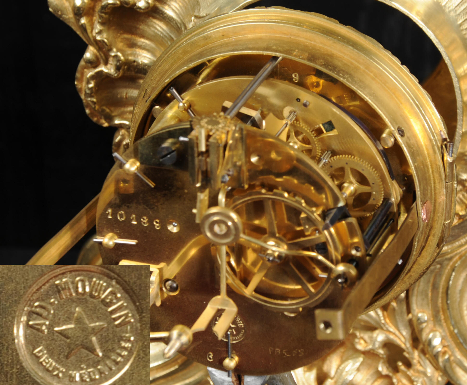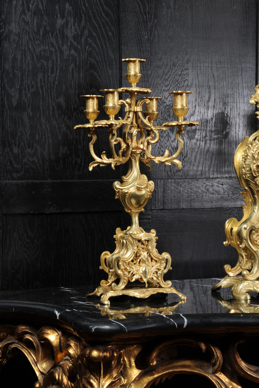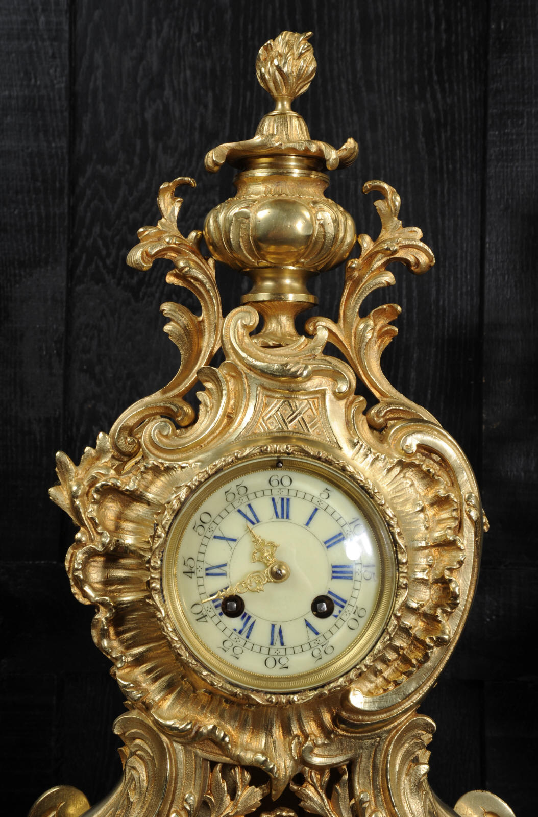 The dial is cream porcelain enamel with blue letters and a separate minute ring in black. It is complete with original finely fretted gilt hands and Rococo bezel with convex glass. The French movement is of high quality and is by A. D. Mougin. It is in excellent clean and running condition having been fully overhauled and tested by our clockmaker. Pendulum is a replacement. It runs for 8 days and strikes the hours and halves on a bell. Click the video clip below to hear the bell and watch the clock running. Condition of the case is excellent, the original gilding is beautifully clean and bright with hardly any wear or discolouration and there are no losses. The dial is also in excellent condition just some nibbles next to the winding holes. The set makes a stunning display as you can see below.